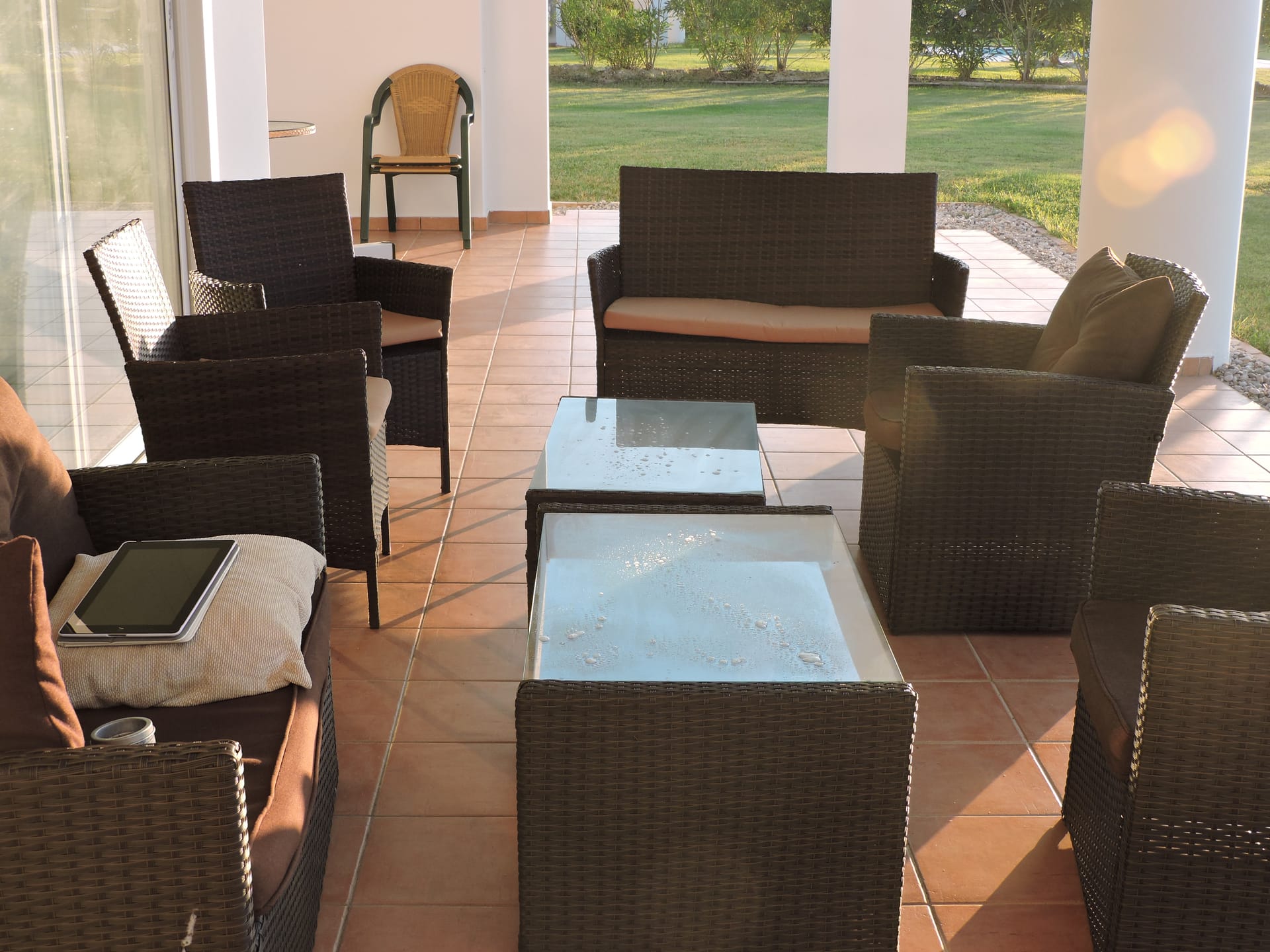 The outdoor space is a huge yard build just upon the sea. It includes everything you need to enjoy and relax during your stay in Arismari Villa.