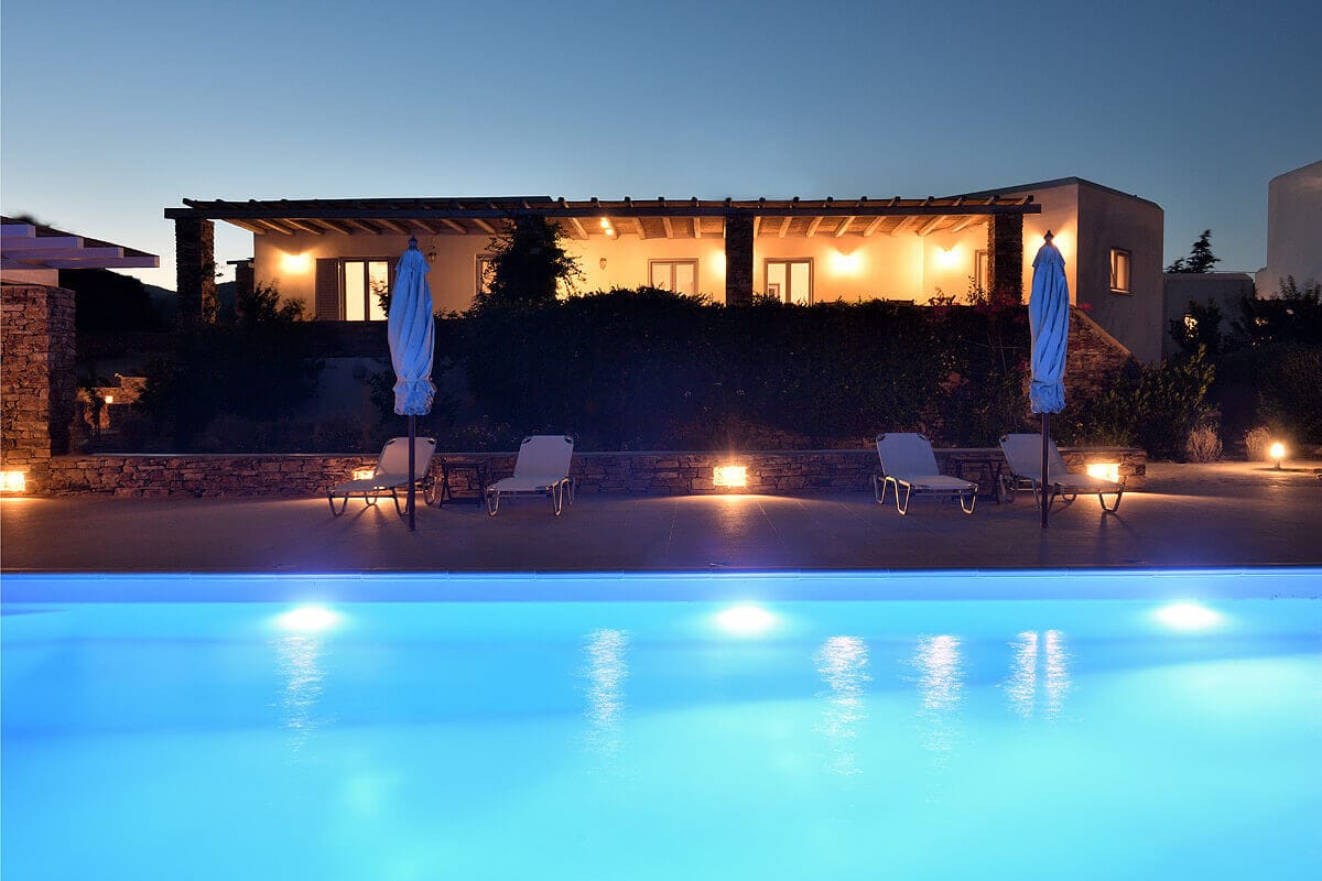 The outdoor area is a large terrace build just upon the sea. The garden is a representative illustration of the regional flora of Porto Roma that is more dry compared to the rest of the island. The highlight of the veranda is a large infinity pool where you can spend a whole day figuring out at which point the sea andthe horizon become one. Nearby, you will also find a jacuzzi and a BBQ in case you would like to grill some fresh and locally sourced food.