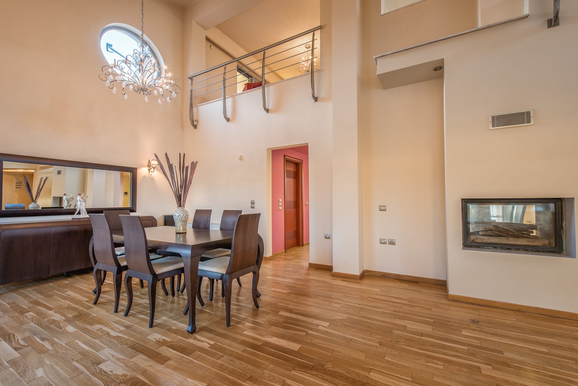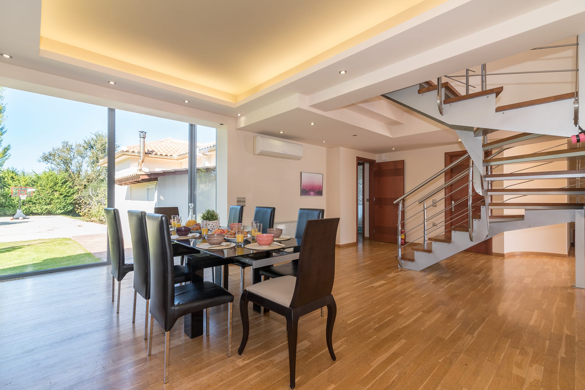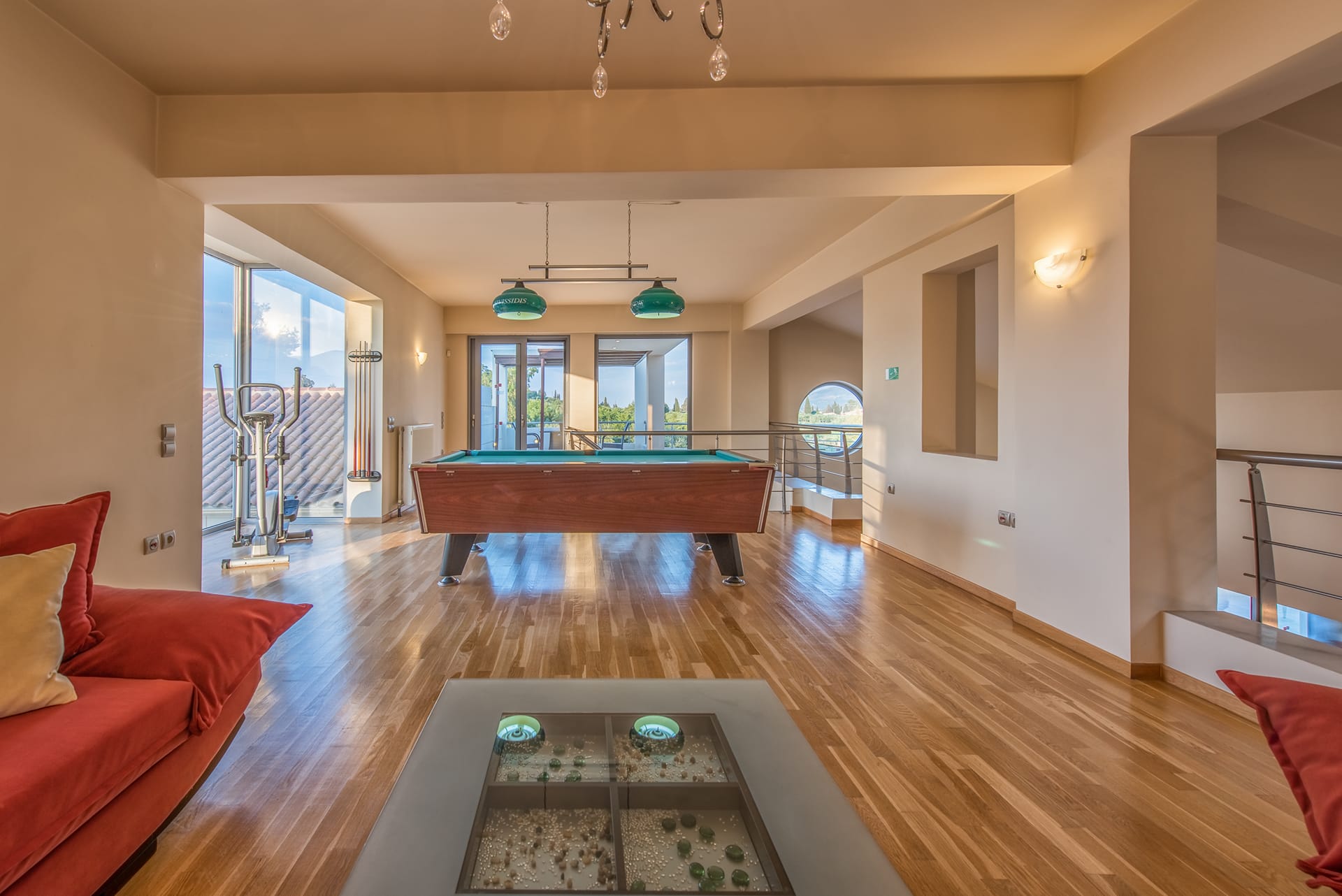 On the main floor the villa has spacious living-rooms, dining rooms & fully equipped kitchen with a fireplace, four bedrooms with En-suite bathrooms and a staircase that leads to the luxurious living room, with a view of the green surroundings. It has independent heating on every floor, A/C, Wi- Fi, storage-room with a washing machine, as well as a billiard. On the first froor you may find 1 double sofa bed!