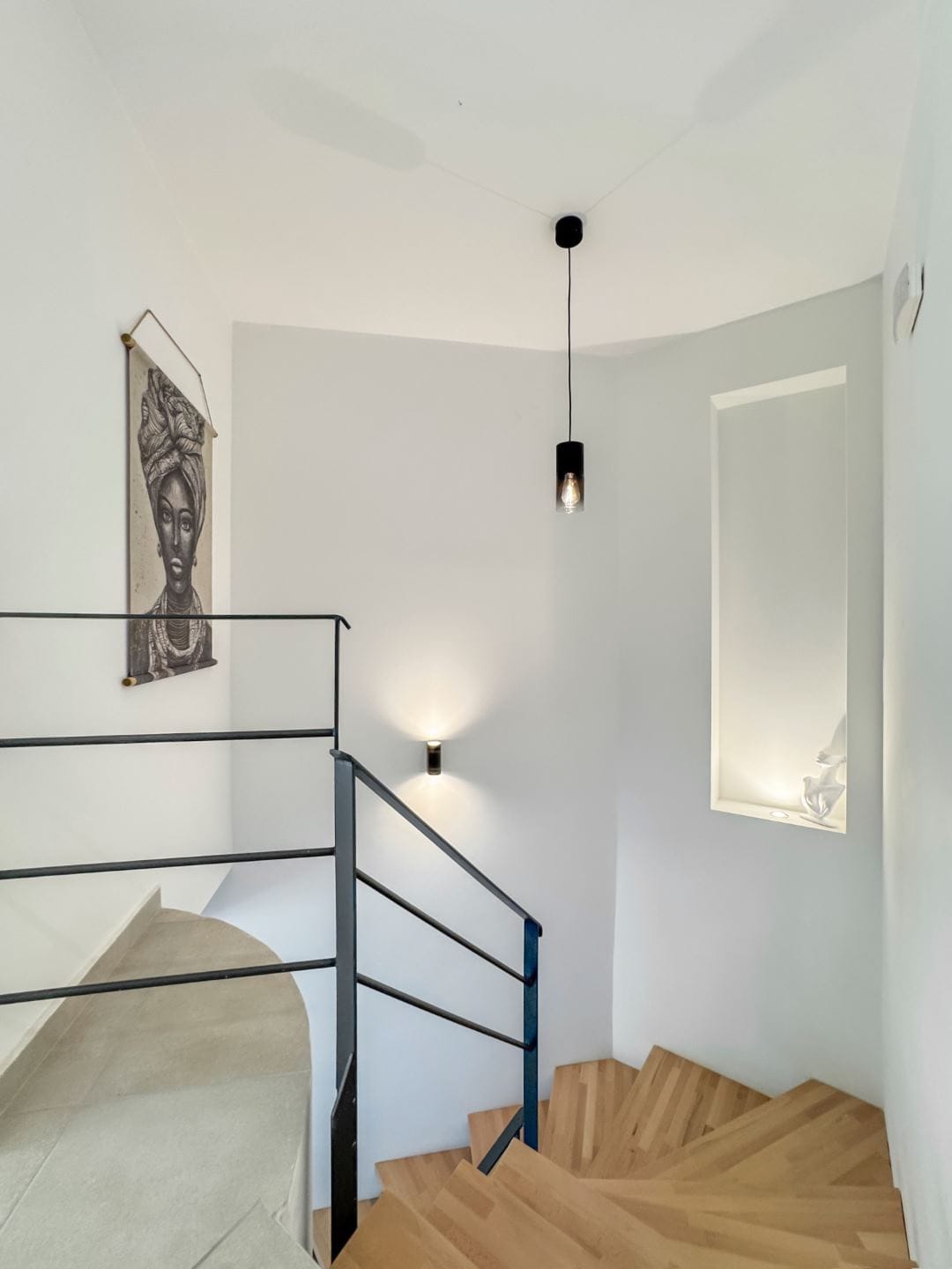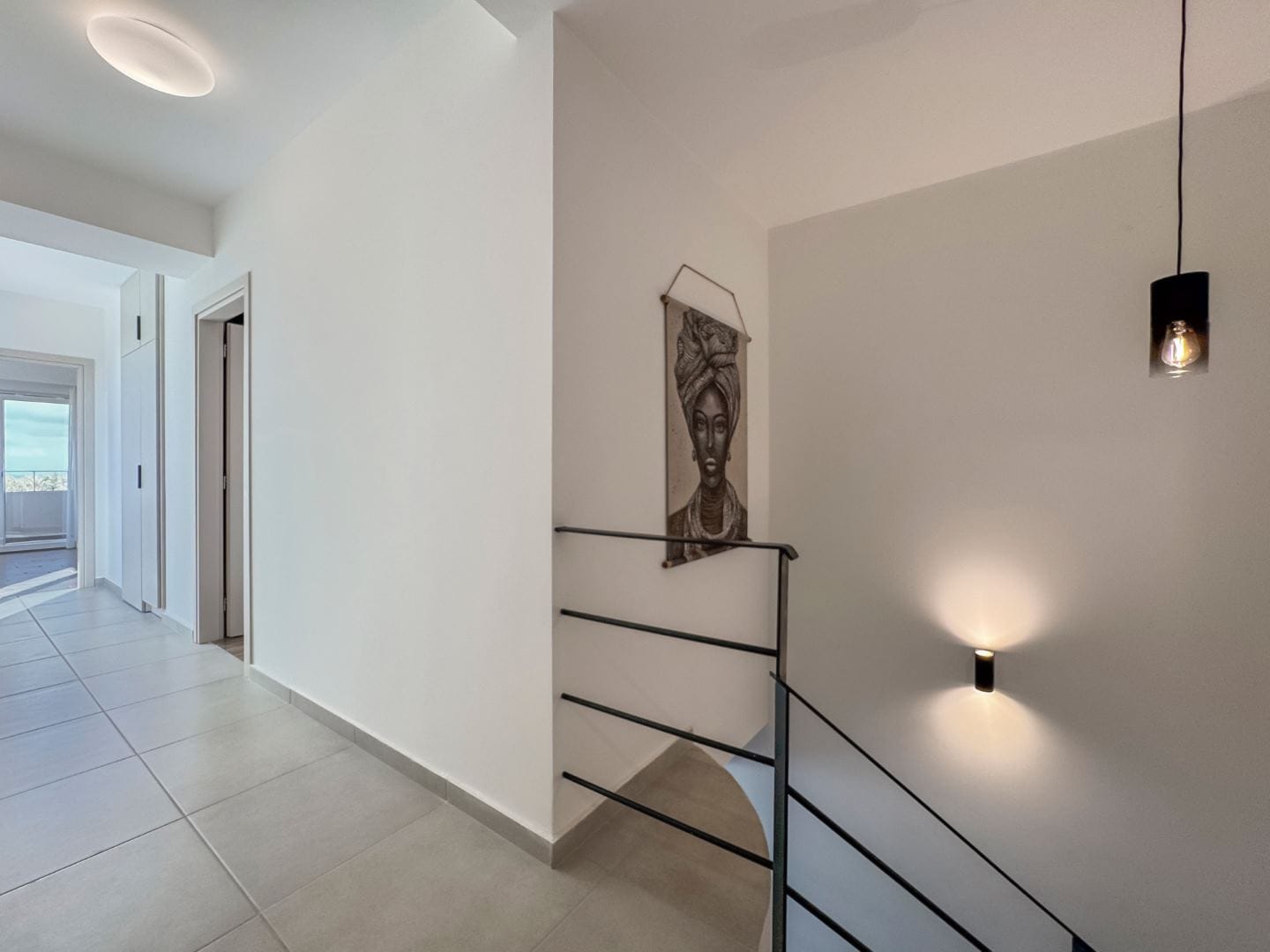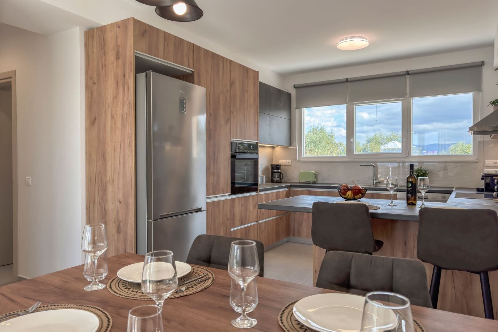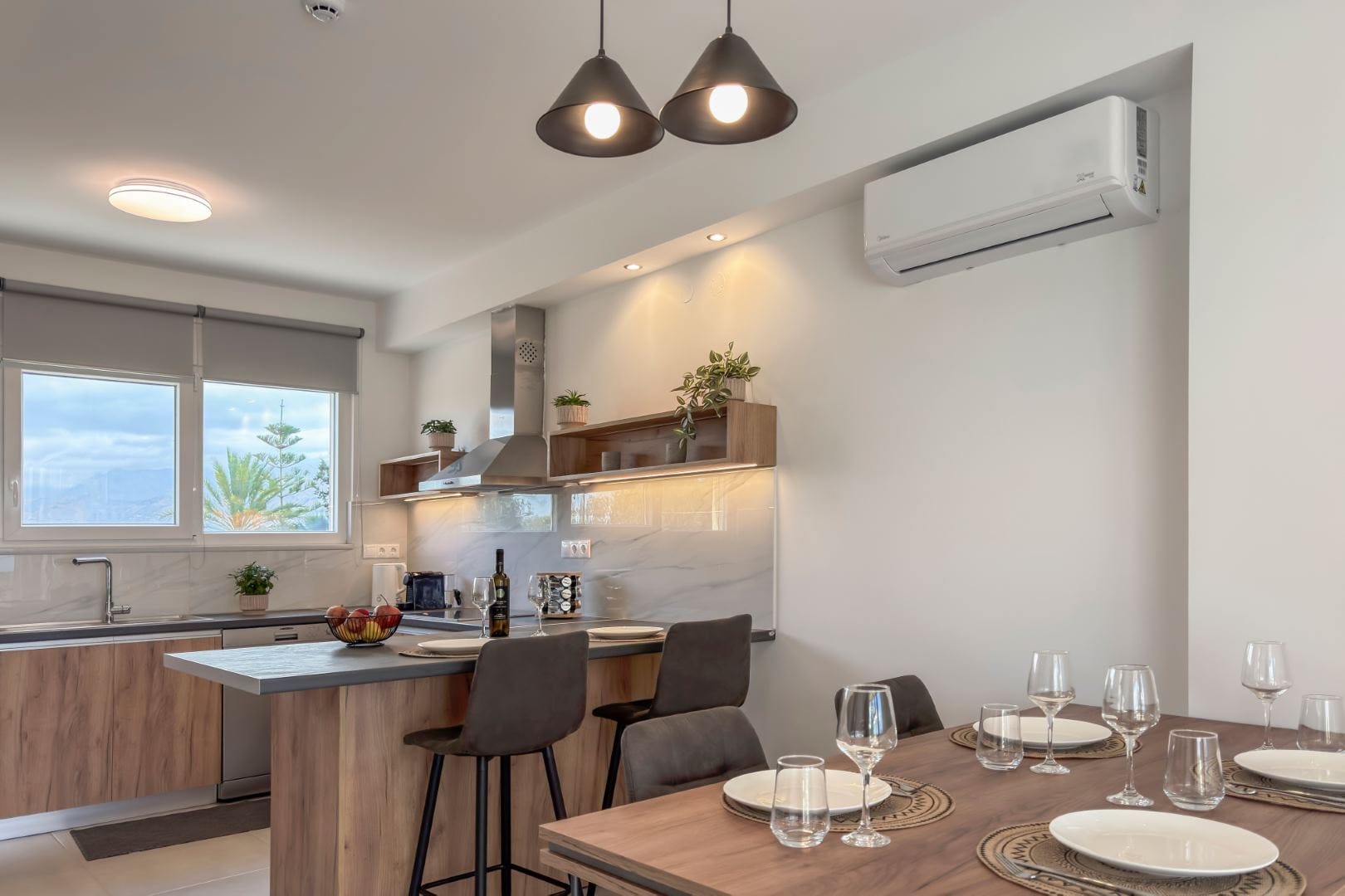 On the ground floor, the layout includes a fully equipped kitchen with a full-size fridge, freezer, oven and dishwasher, in addition to the living room, which incorporates a flat screen smart TV and a plush sofa. There is also a full common bathroom on the ground floor.