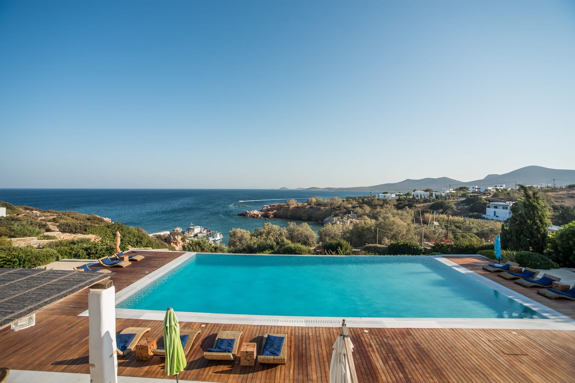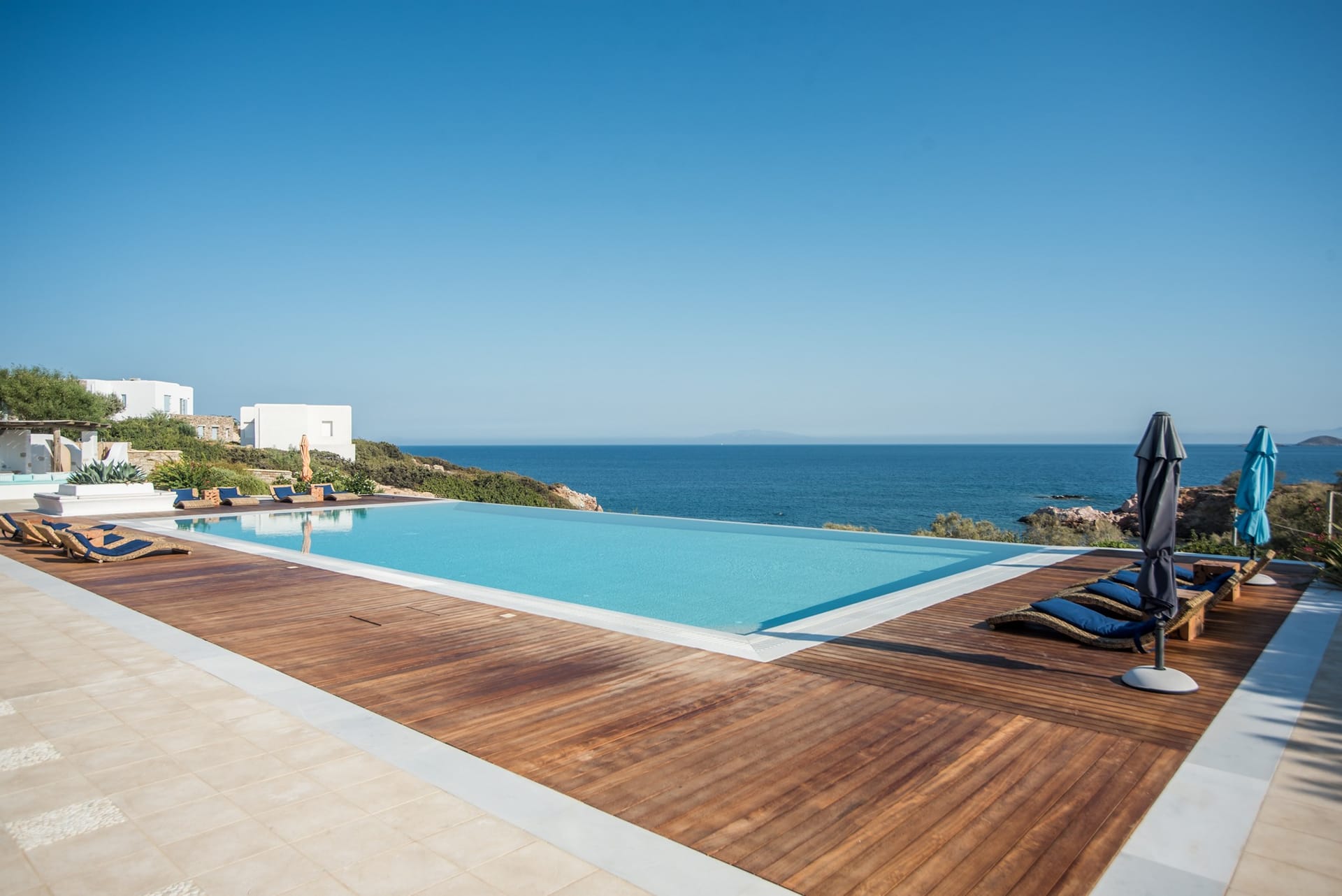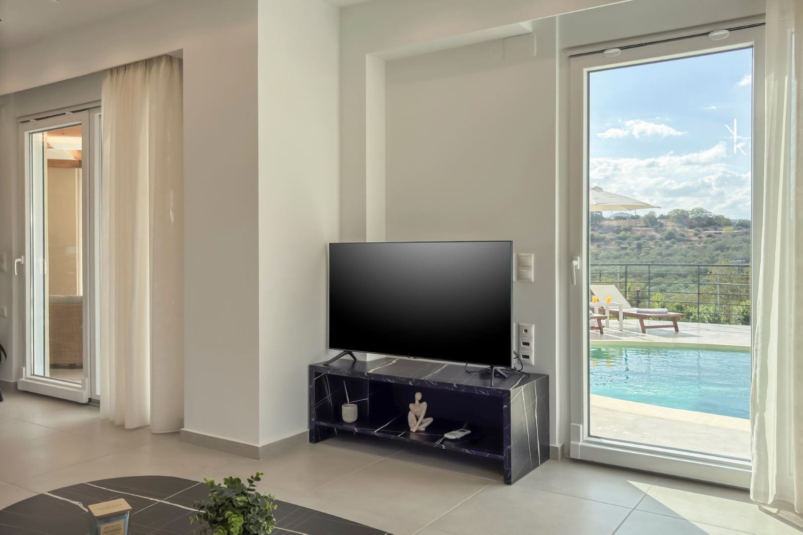 Ascending to the first floor, AéNaos Luxury Villa presents 3 bedrooms meticulously curated to suit the needs of 6 people, who will find 2 bedrooms with double beds and 1 bedroom with a twin-size bed, as well as ensuite bathrooms with luxury amenities, air conditioning and TVs in all rooms. A safe box is furthermore available for added convenience and security. There is a terrace and balconies too, from where the beautiful view of the lush-green surrounding area and sea view can be taken in from afar, while also drenching the villa with an abundance of natural light.