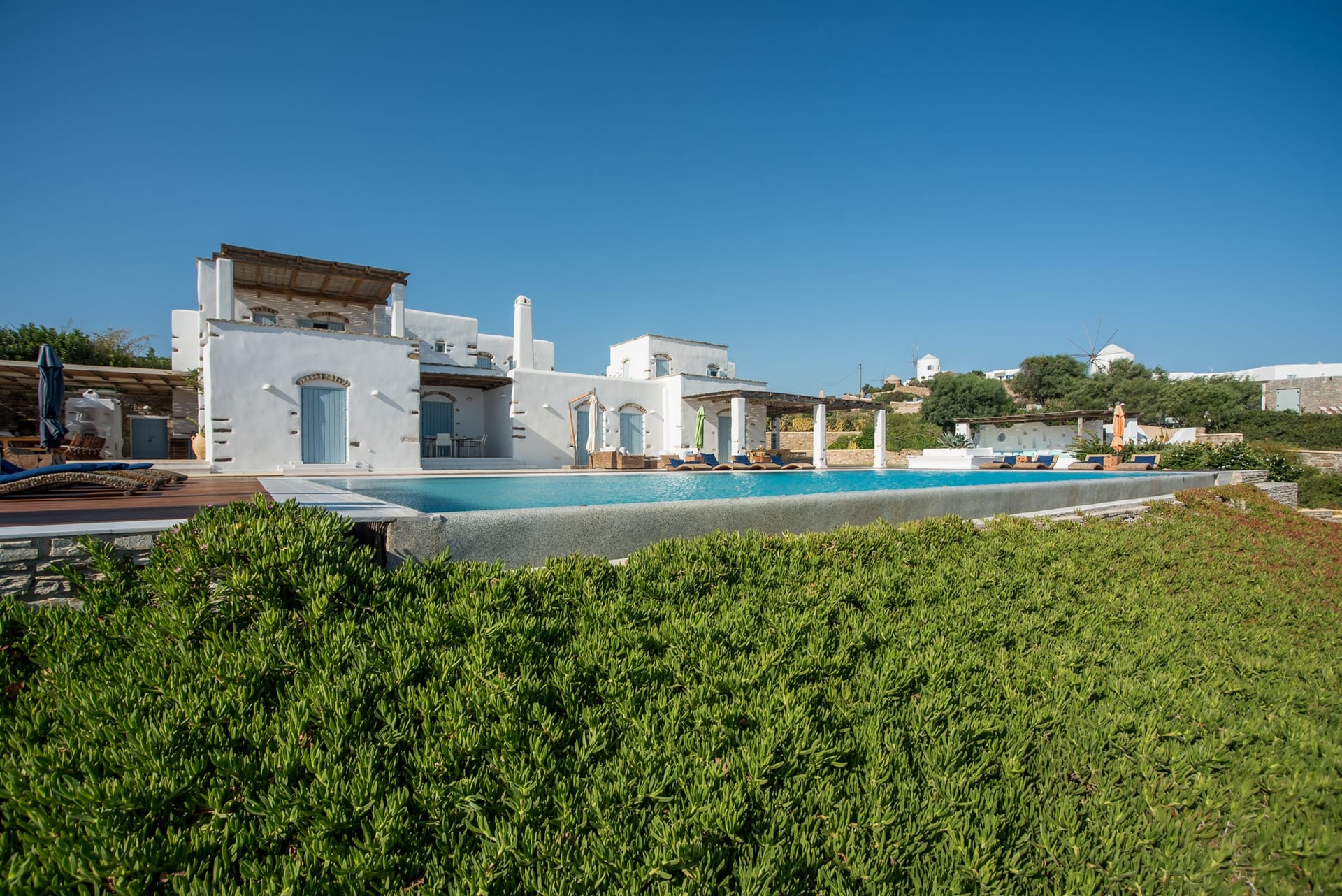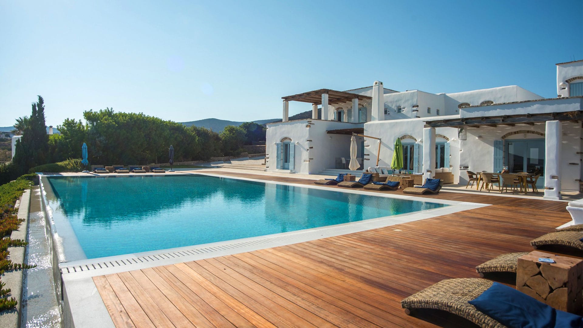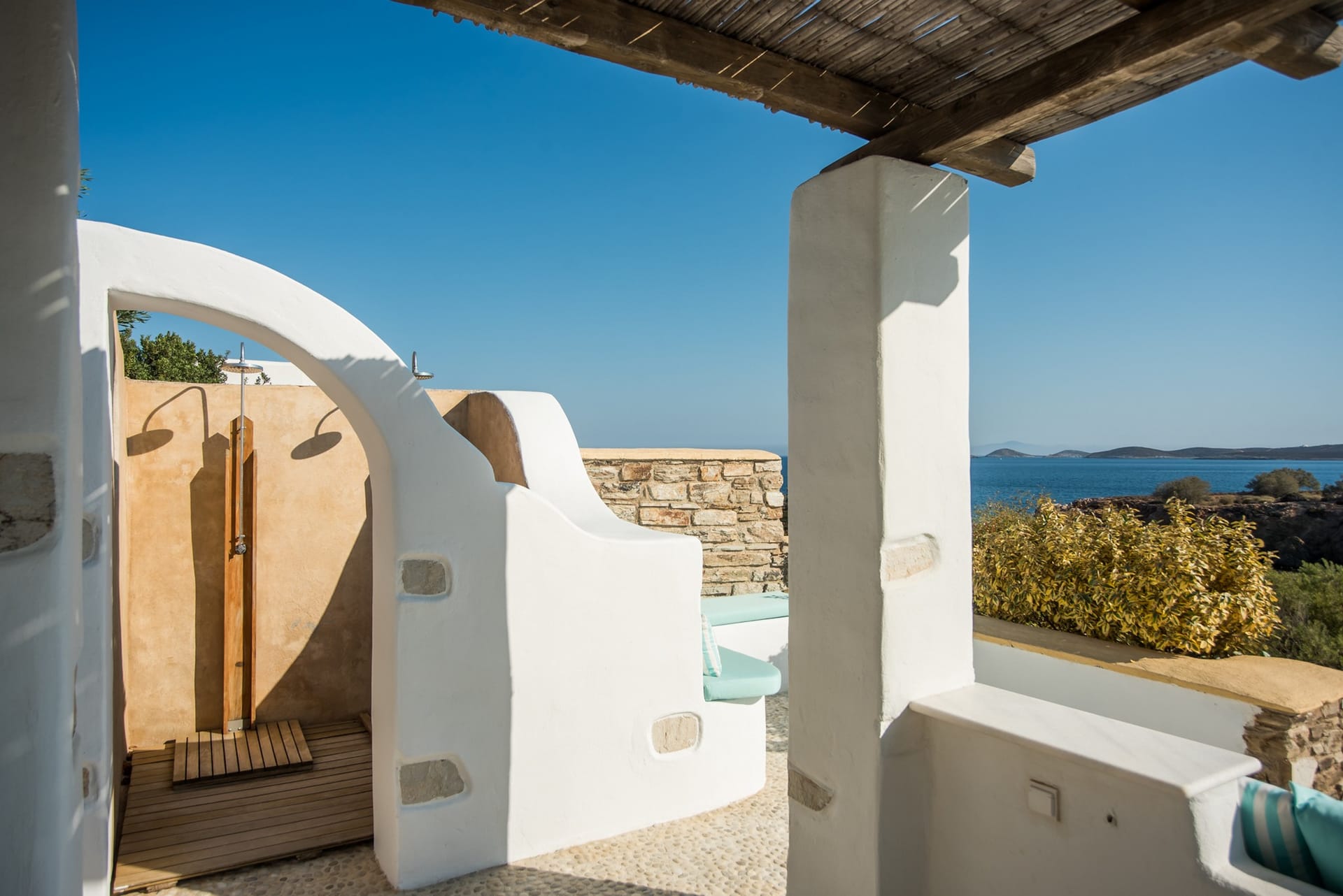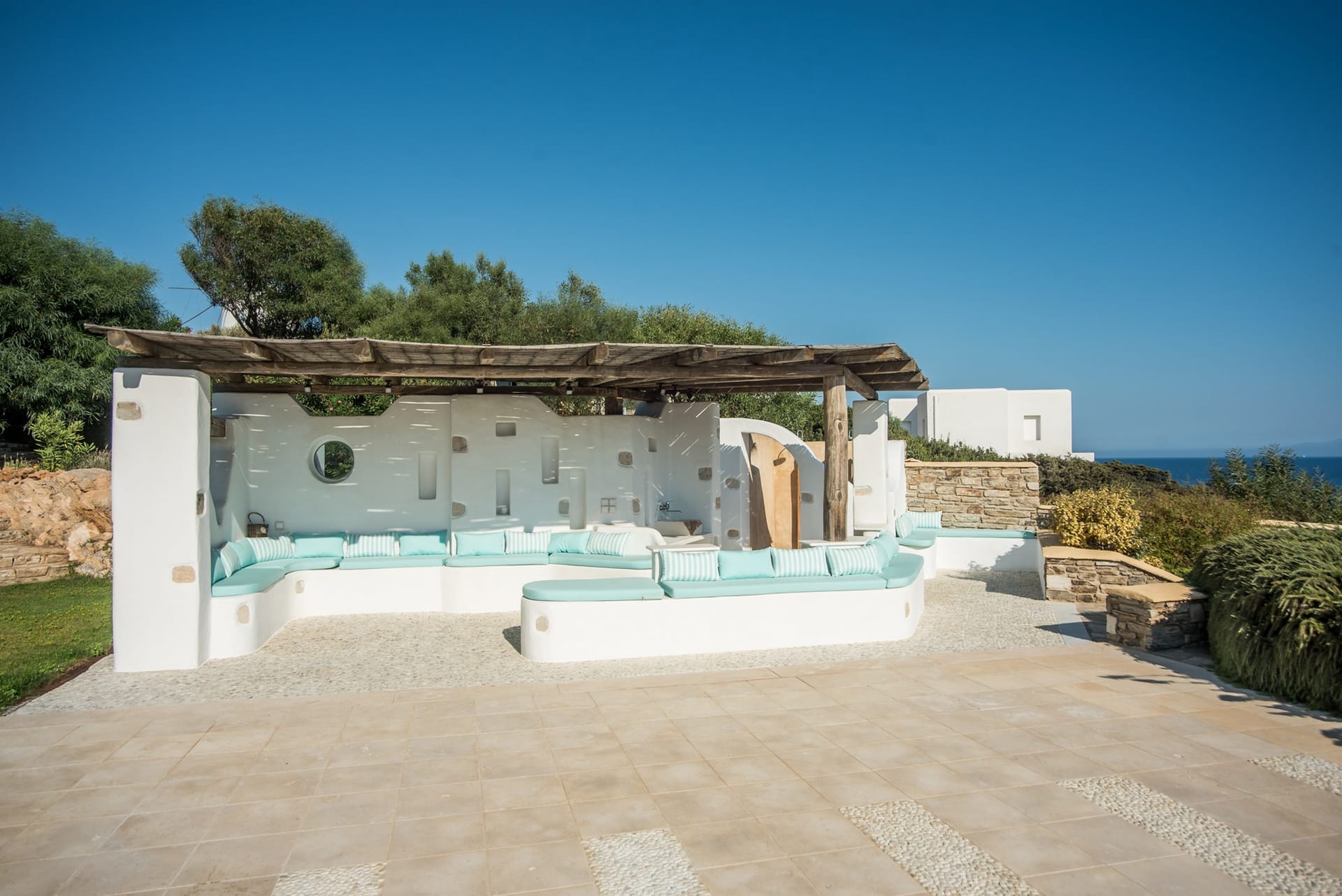Upon arrival at AéNaos Luxury Villa, guests will discover ample parking space for their convenience and overall security of their vehicles. Guests will then encounter the swimming pool area with an outdoor shower available, the garden and outdoor lounge with BBQ as well as sitting space for them to relax around, dine, enjoy a glass of wine or simply sit calmly and appreciate the company of one another, available to take advantage of at all times of the day. The outdoor spaces of AéNaos Luxury Villa also serve as a perfect play area for smaller children, of course and as always under constant adult supervision.