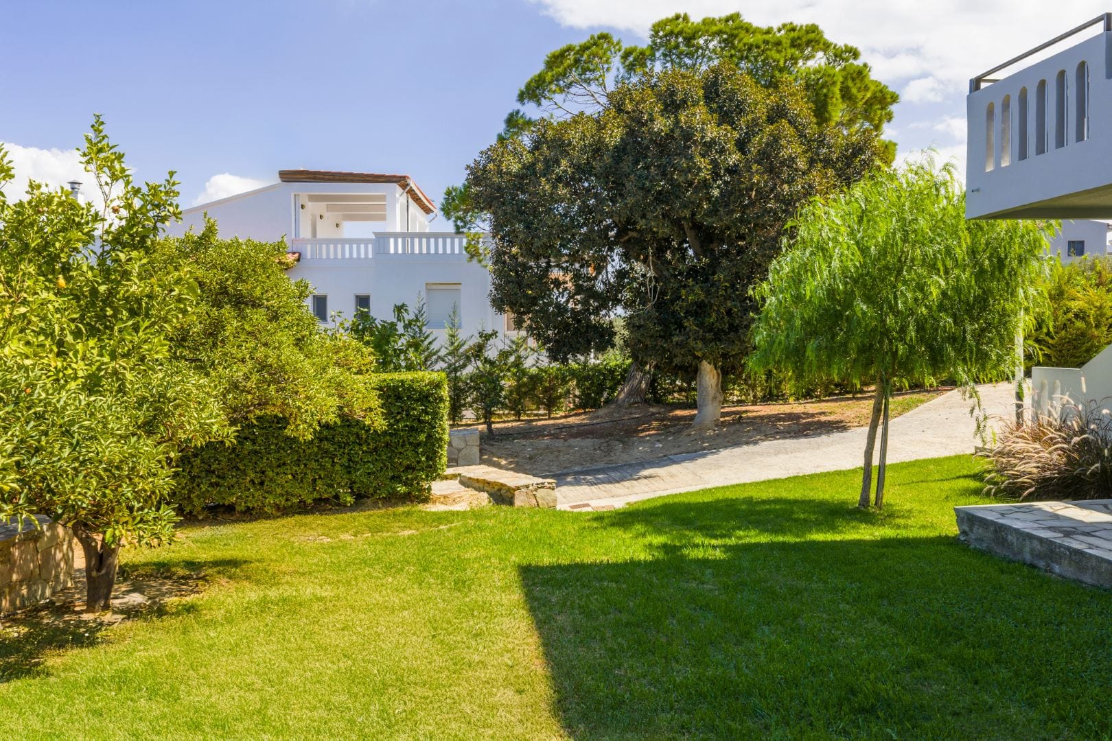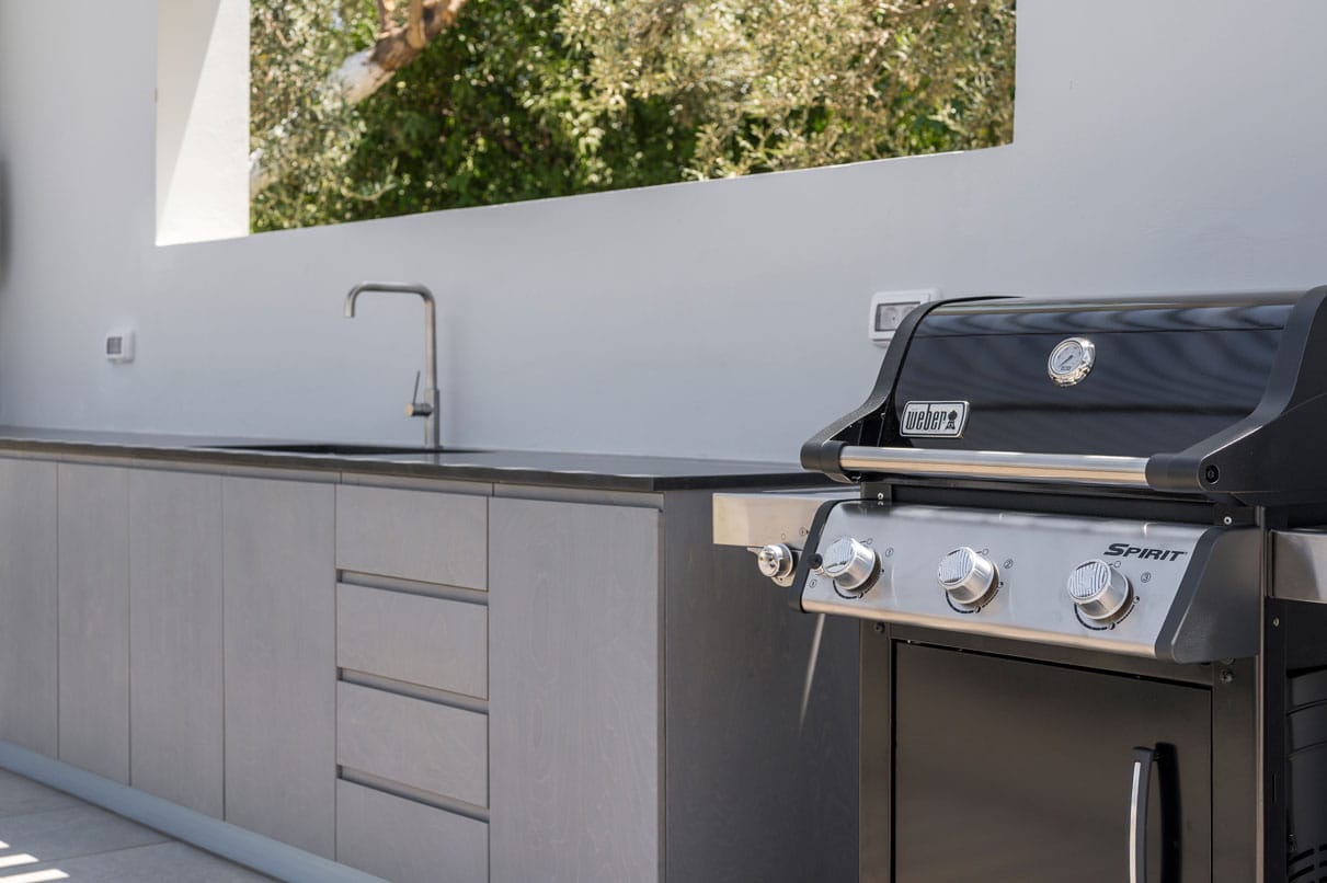 Adjacent to the pool, a grassy area offers a delightful space for children to play. The outdoor gas barbecue and shaded dining area make for wonderful al fresco dining experiences.