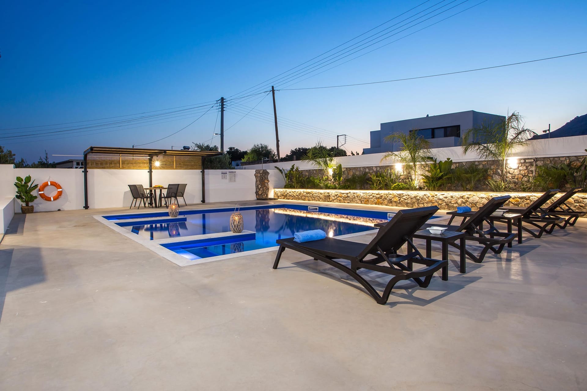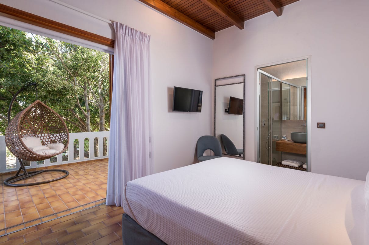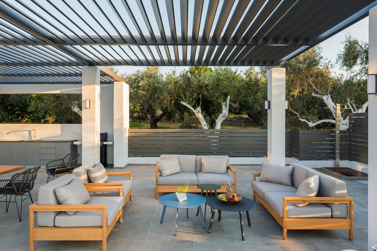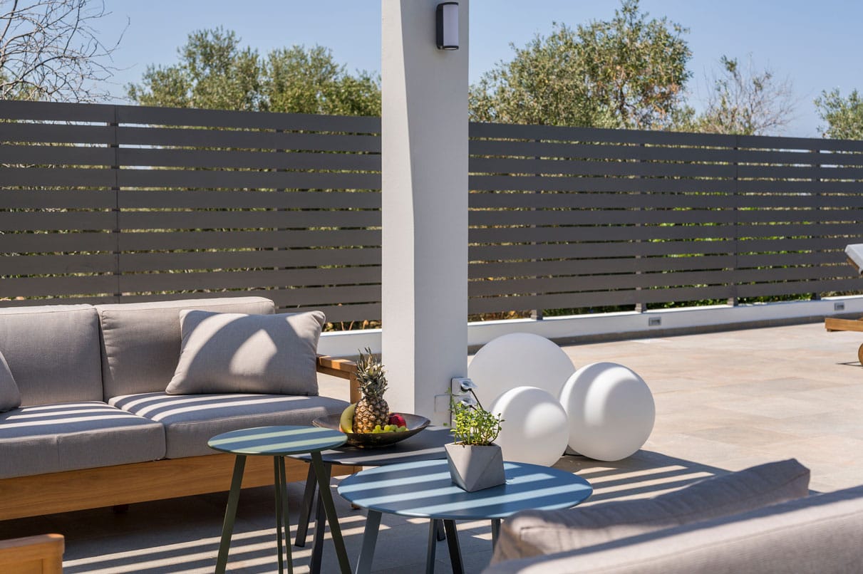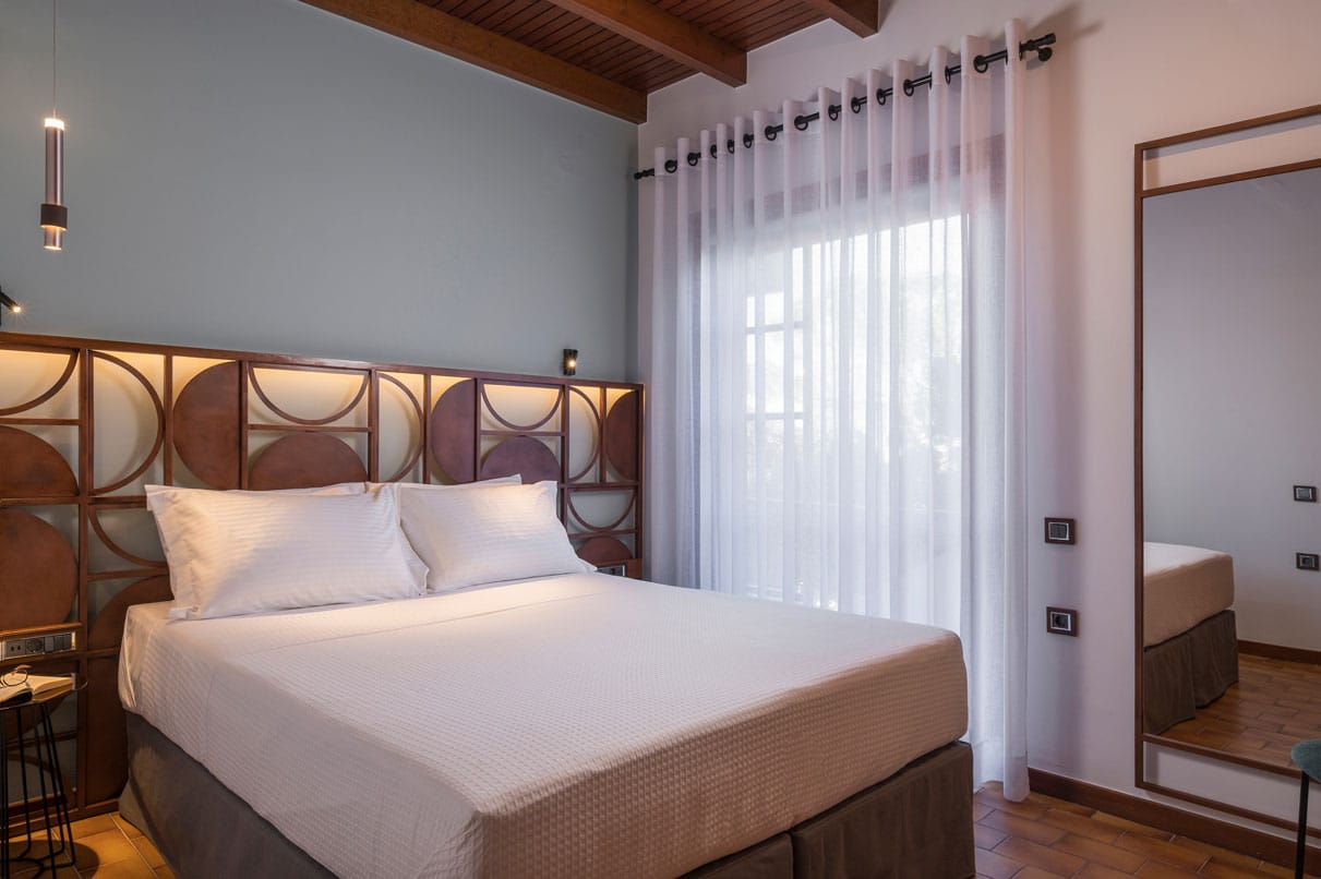 Azatis Luxury Villa covers two separate levels of a total of 360 square meters and comfortably accommodates up to 14 guests. The 7 bedrooms, 4 on the terrace level and 3 on the garden level, are elegantly designed, featuring hypoallergenic COCO-MAT mattresses for ultimate comfort. Each bedroom offers the option of a queen-size bed or two single beds, ensuring adaptability for different group needs.