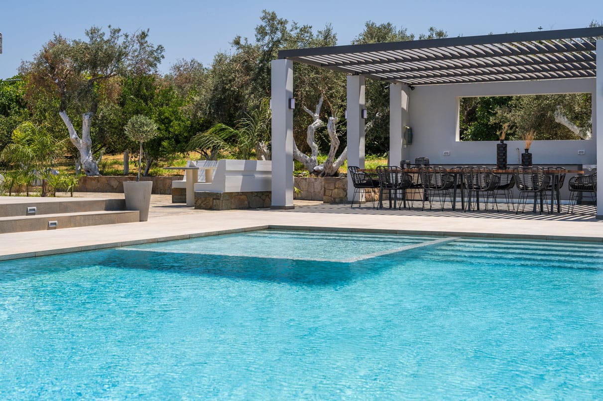 The villa features a total of 7 elegantly designed bedrooms and 7 modern bathrooms (6 ensuite and 1 non-ensuite), complemented by a stunning heated (at an extra cost) outdoor pool with children’s section and a hydromassage corner.