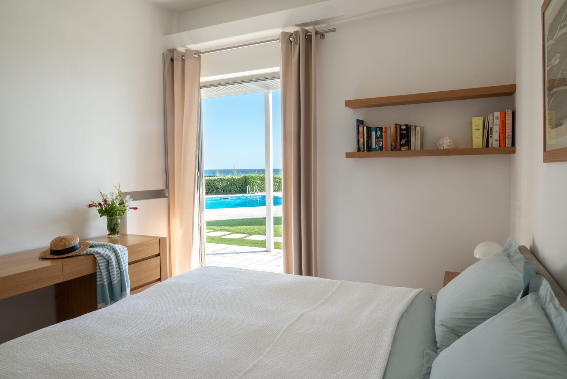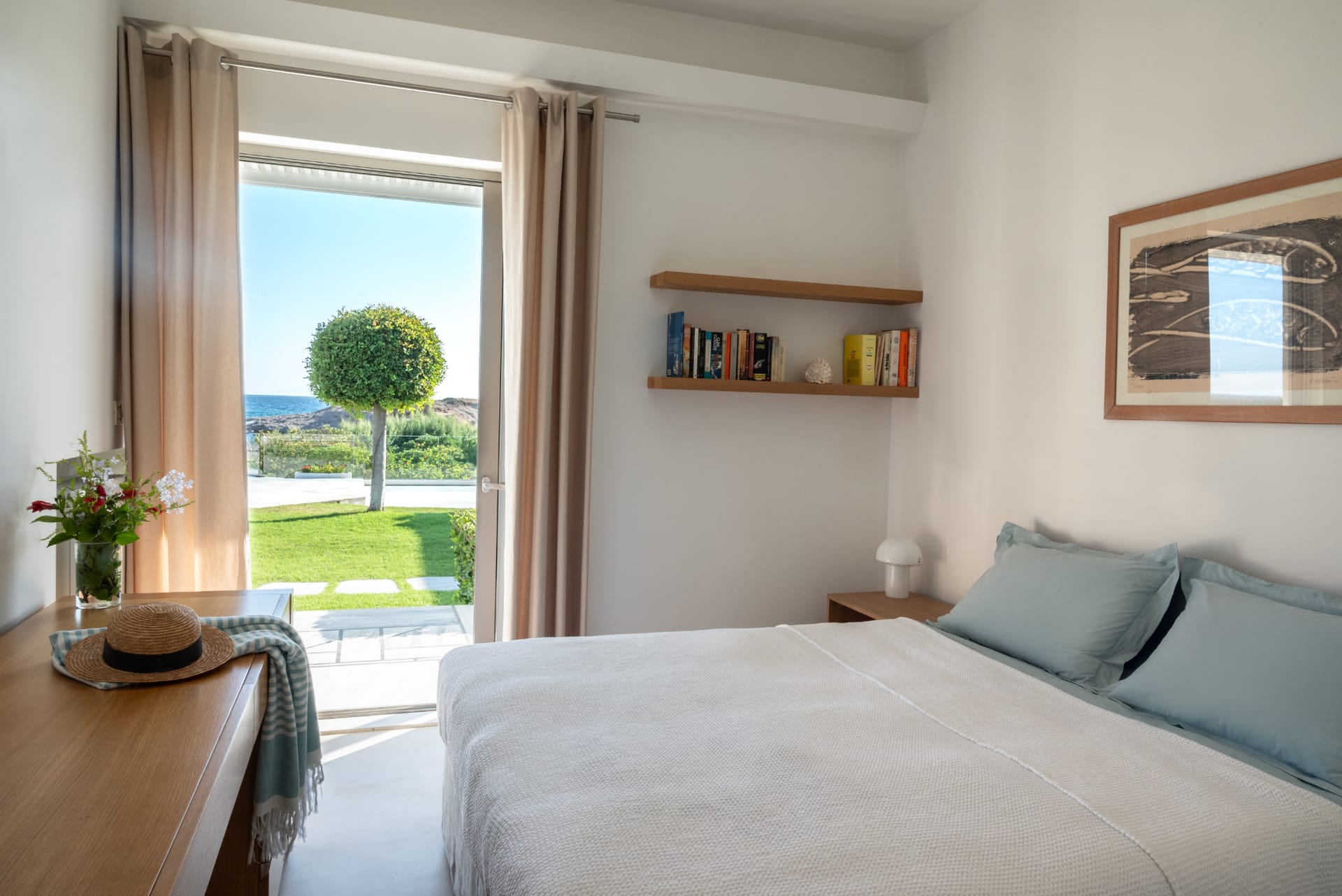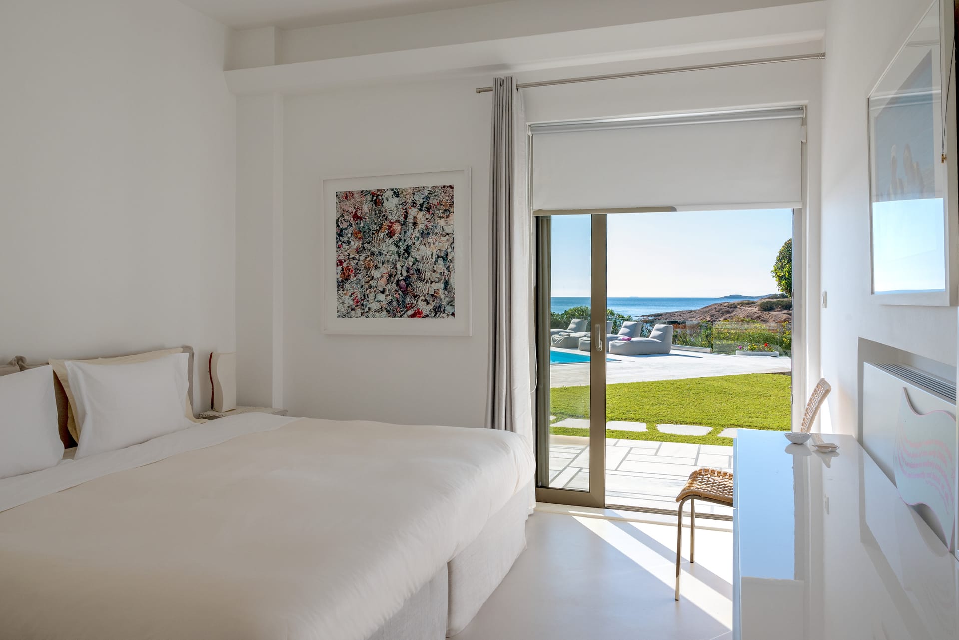 Step outside and the villa reveals its true magic. The private swimming pool glistens under the sun, surrounded by comfortable loungers and a lush, manicured garden. Just beyond, the beachfront location invites you to step onto the sand within moments. Whether you're starting your day with a swim in the Aegean or ending it with a glass of wine as the sun sets over the sea, every moment here feels extraordinary.