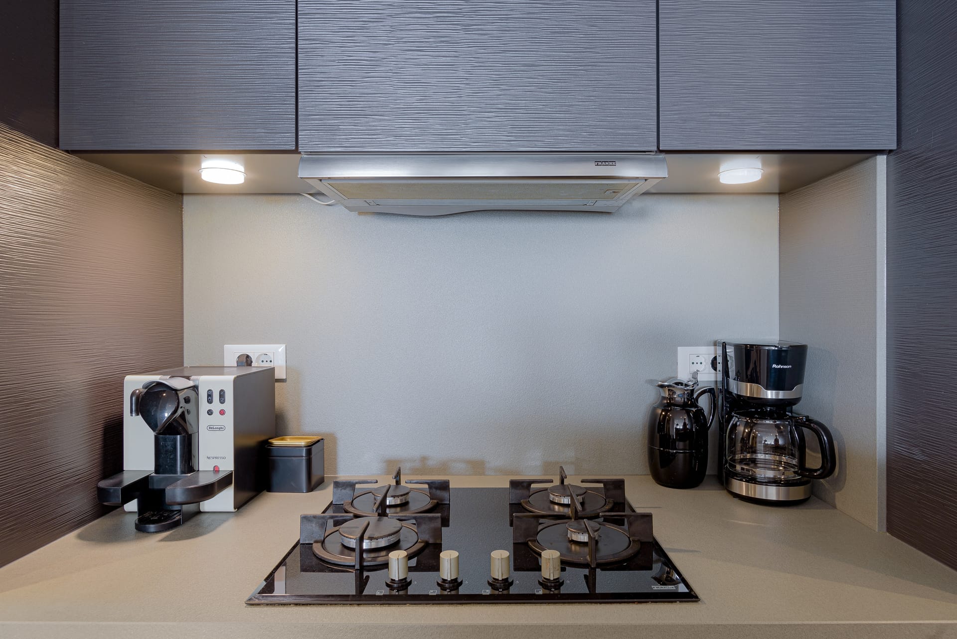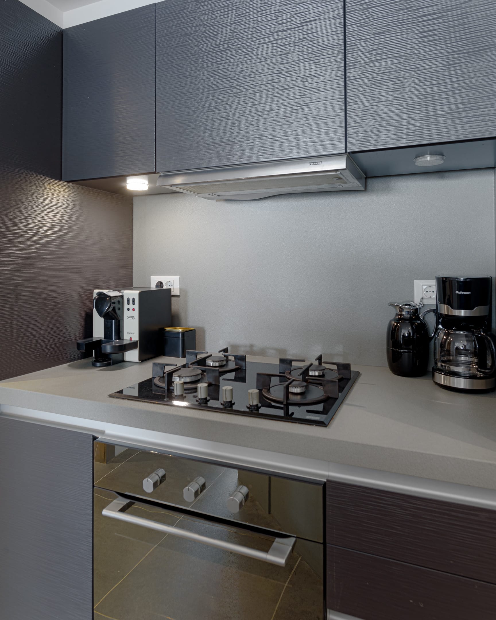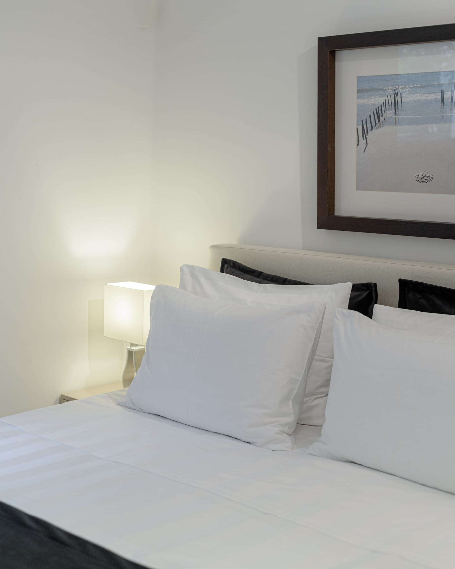 The ground floor exudes a crisp, modern vibe with grey and white tones accentuated by pops of unique décor. The spacious living/dining area is illuminated by floor to ceiling sliding doors which lead out on to the terrace and pool. The space is complete with a compact kitchen that features high-end appliances and everything you need for quality dining. Both of the two ground floor bedrooms are designed for flawless top-of-the-line sleeps; Queen size beds with plush mattresses and linen make sure of this. Getting clean is a spa-worthy experience, as the bathroom is complete with corresponding amenities.