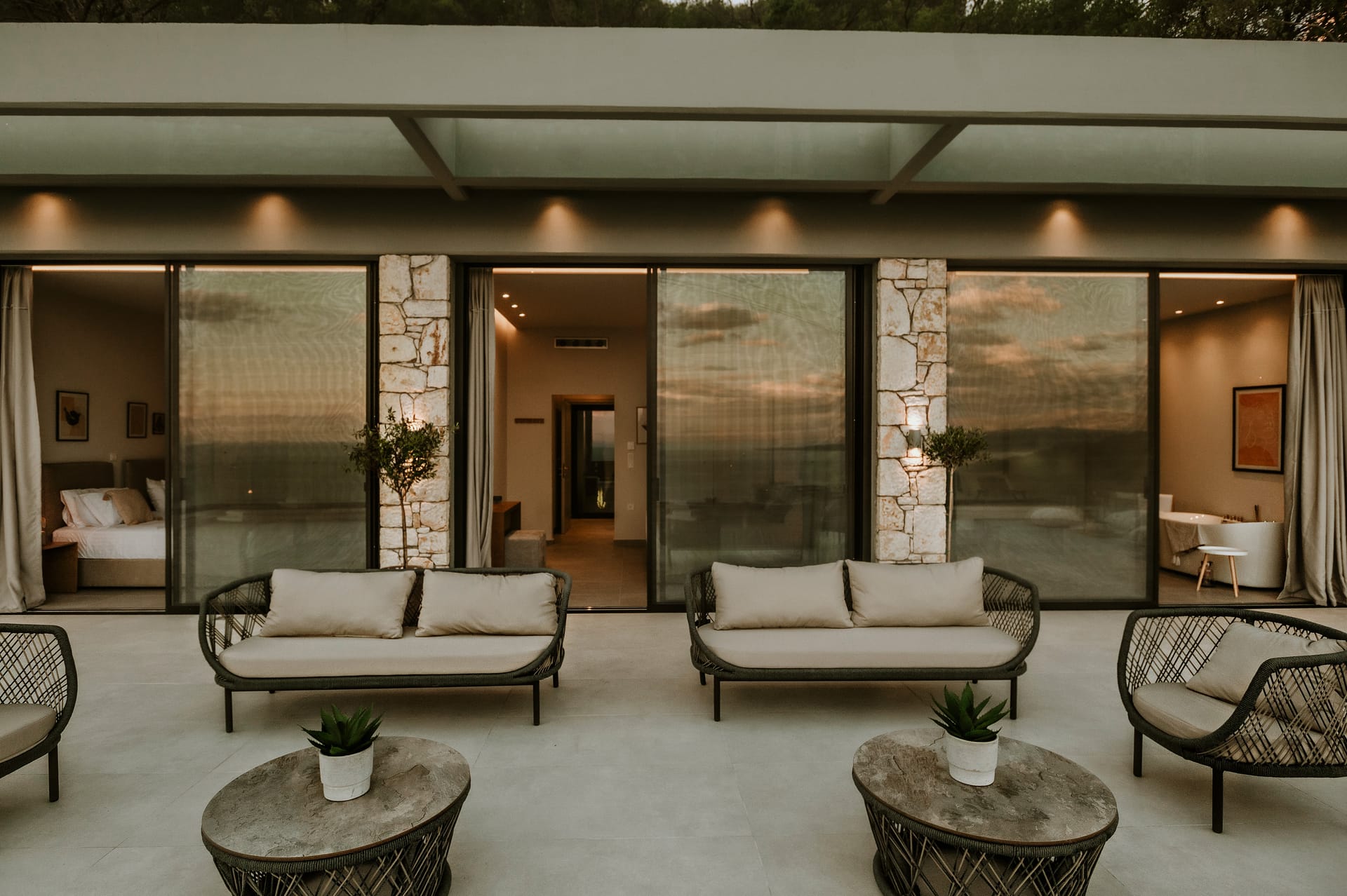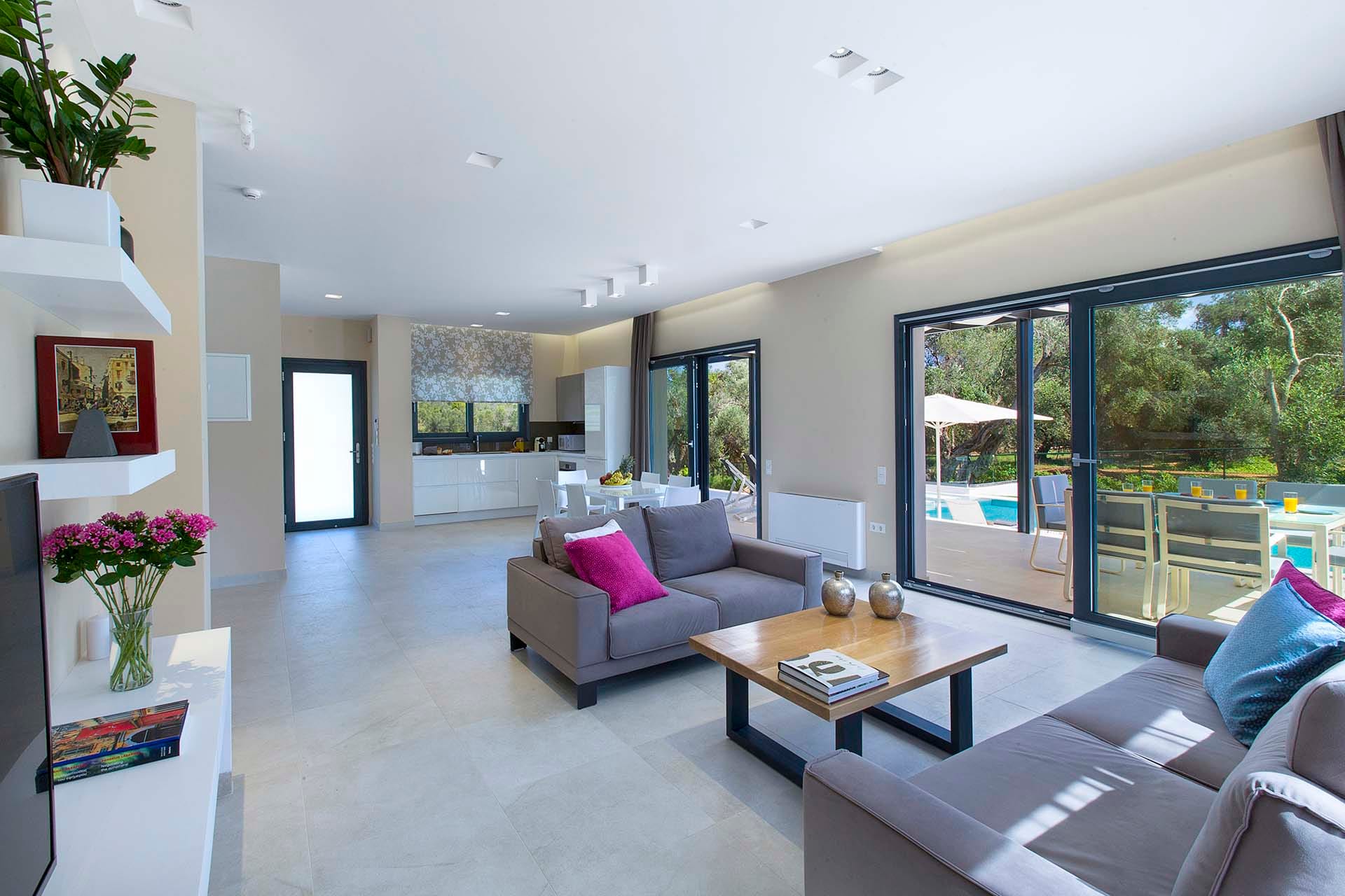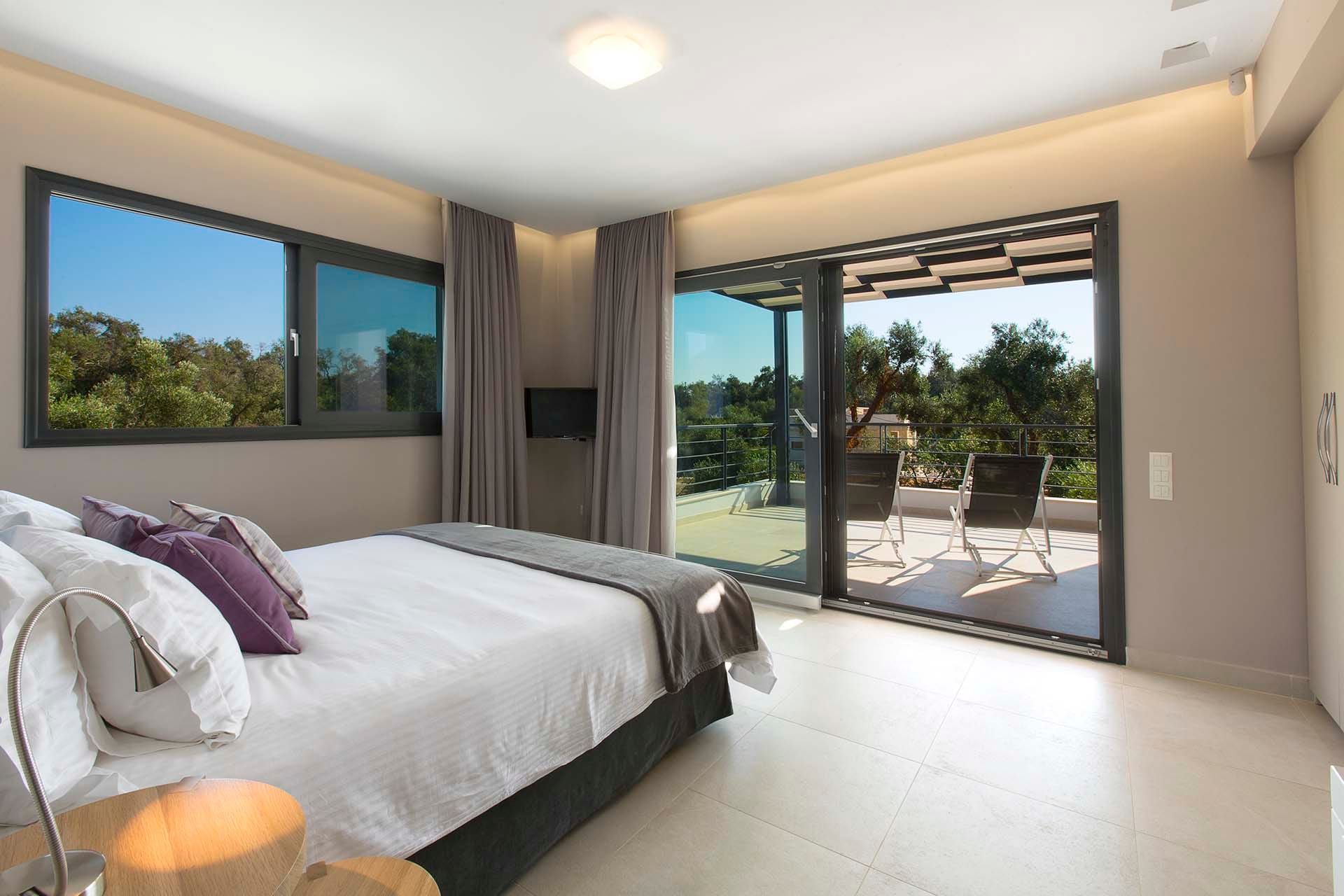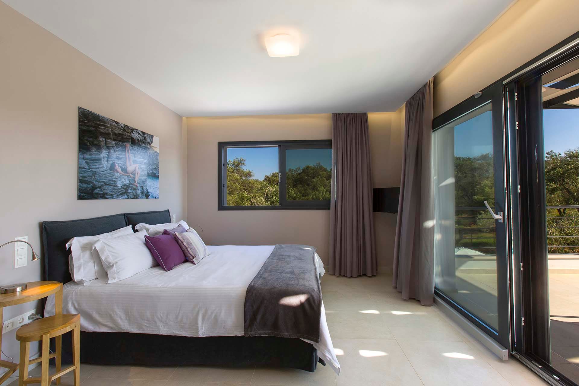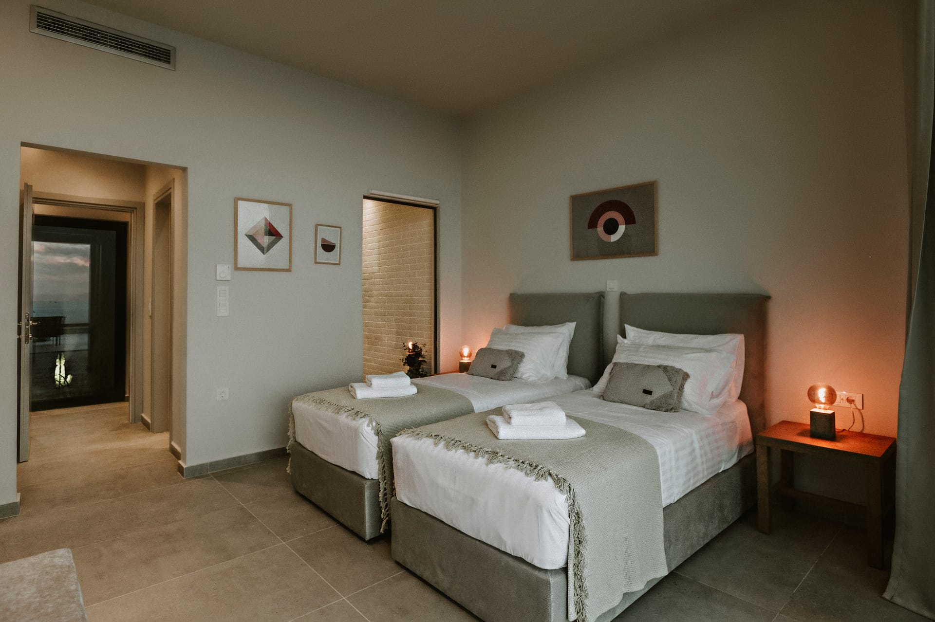 Paradisun is unique with a perfect blend of modern luxury and the natural landscape in this geometrically perfect villa. Designed for complete privacy, the olive trees, the mountain, and blue Greek sky will revitalize the senses. Inside is full of natural light from the panoramic window doors that surround the villa; from all angles, you'll have beautiful soothing views. It boasts easy access with private parking and is very central, near to everything. You can even amble down to the beautiful beach nearby. This villa would be a perfect choice for a group or family of up to 6 people, with the option for two extra guests on the lower floor.