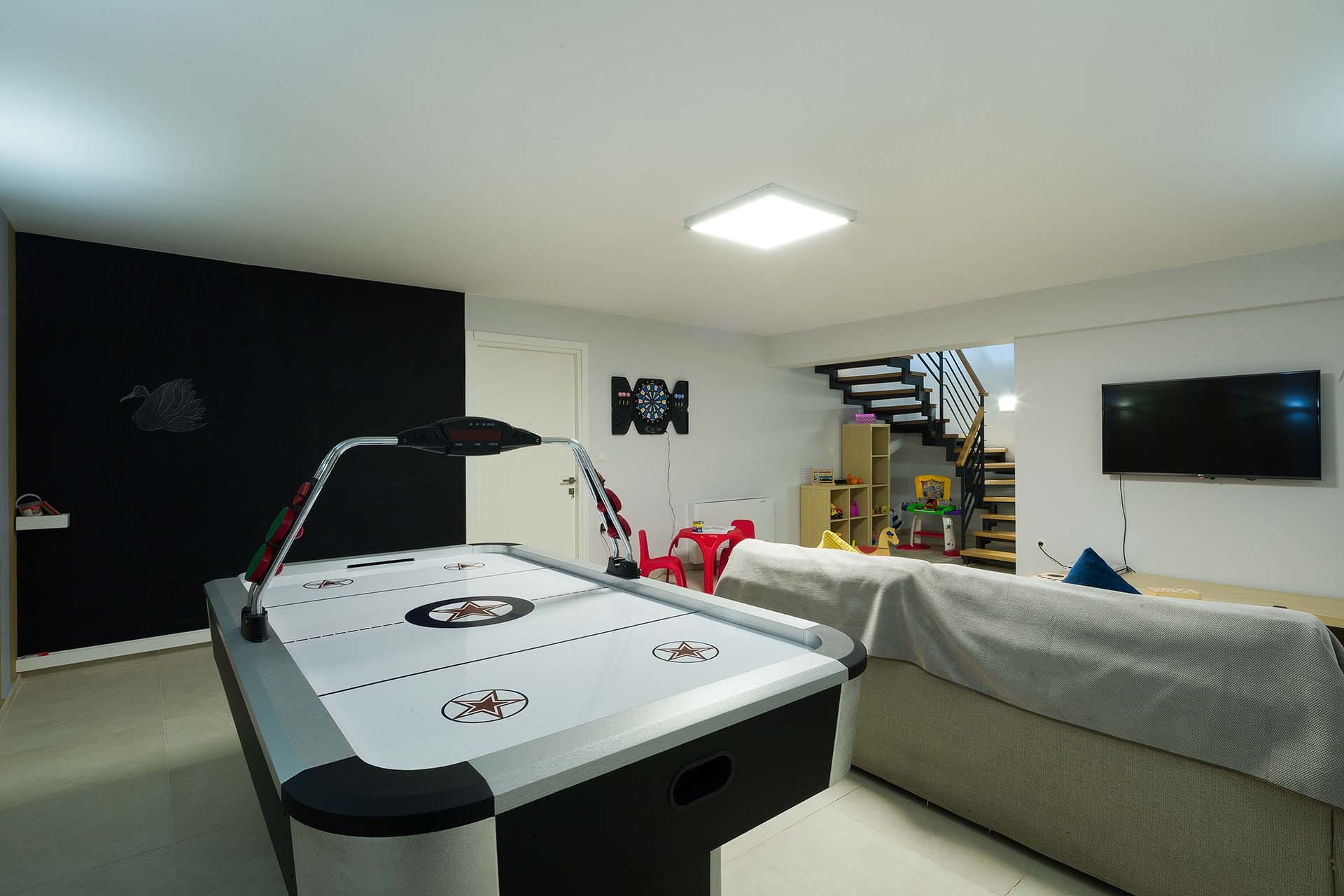 The villa is spread over 3 levels, with the fully equipped kitchen on the ground floor, connected to the dining and living room areas, spaces for friends and family get togethers. There are 3 bedrooms, 2 of them are on the first floor; the master bedroom with en suite bathroom and private balcony, and the other spacious bedroom on this floor can be laid out as a twin or a double room. There is also, a further double bedroom on the ground floor. In case you just want to chill out there is also a playroom with a sofa bed for a cool afternoon nap.