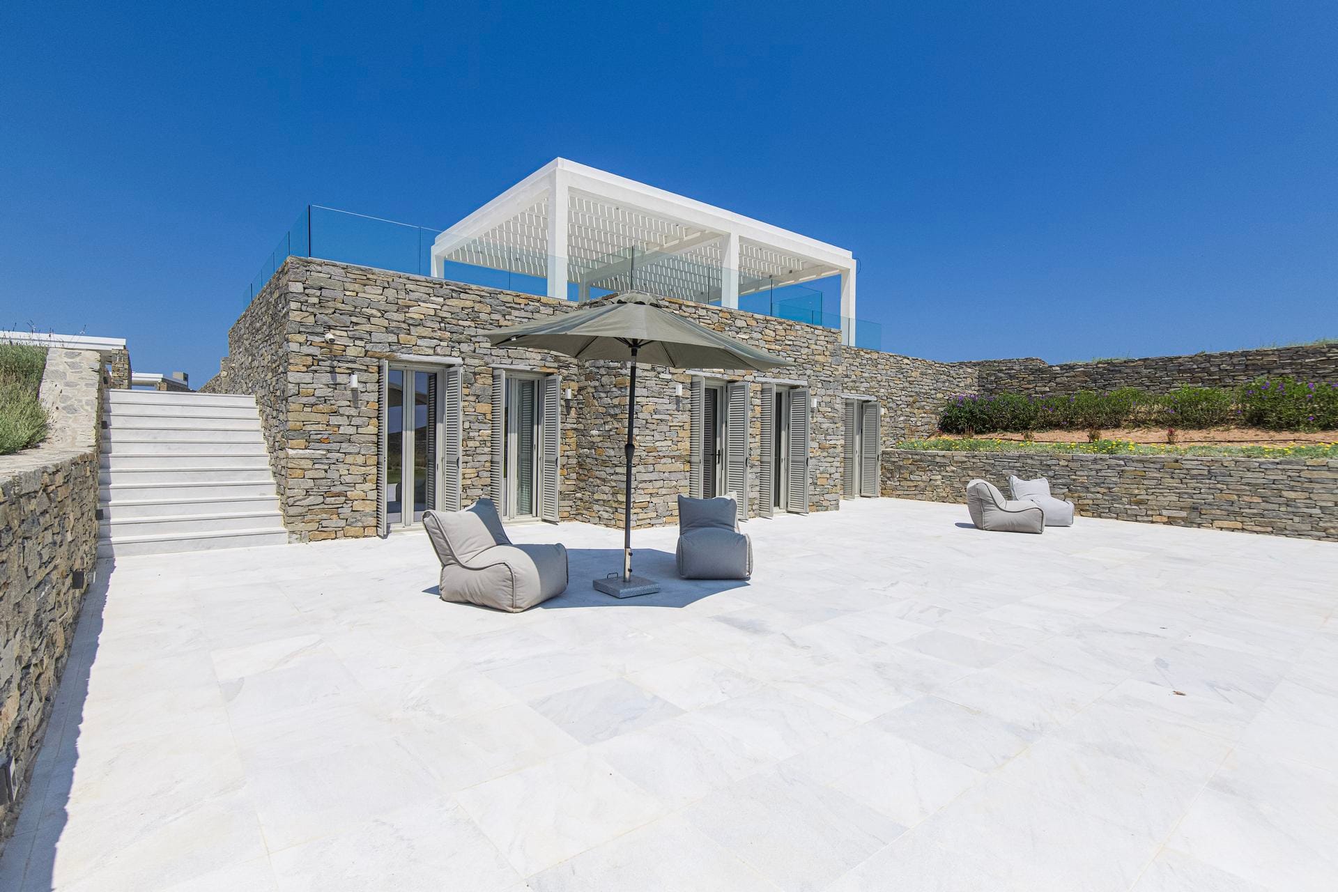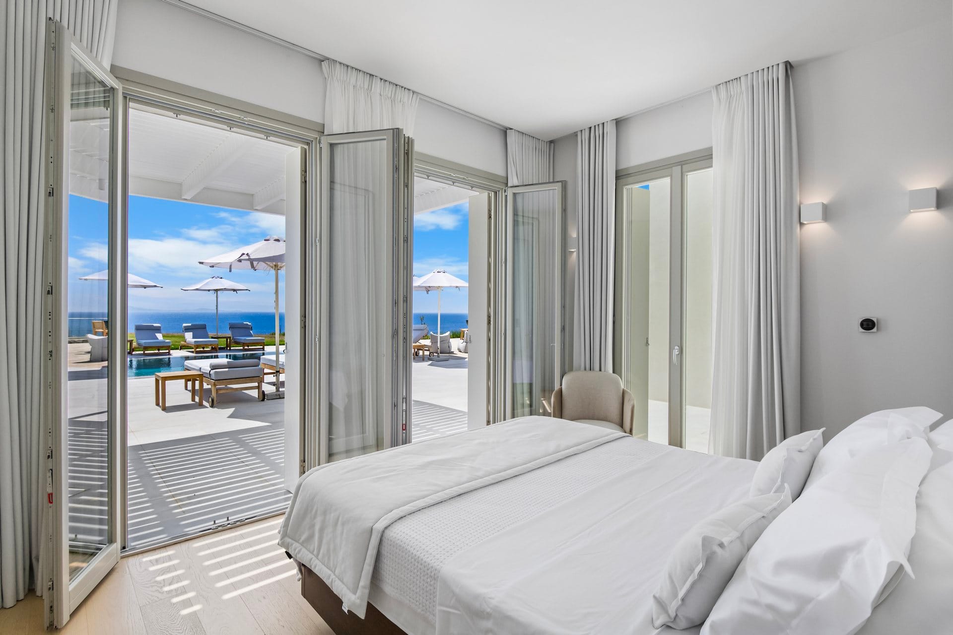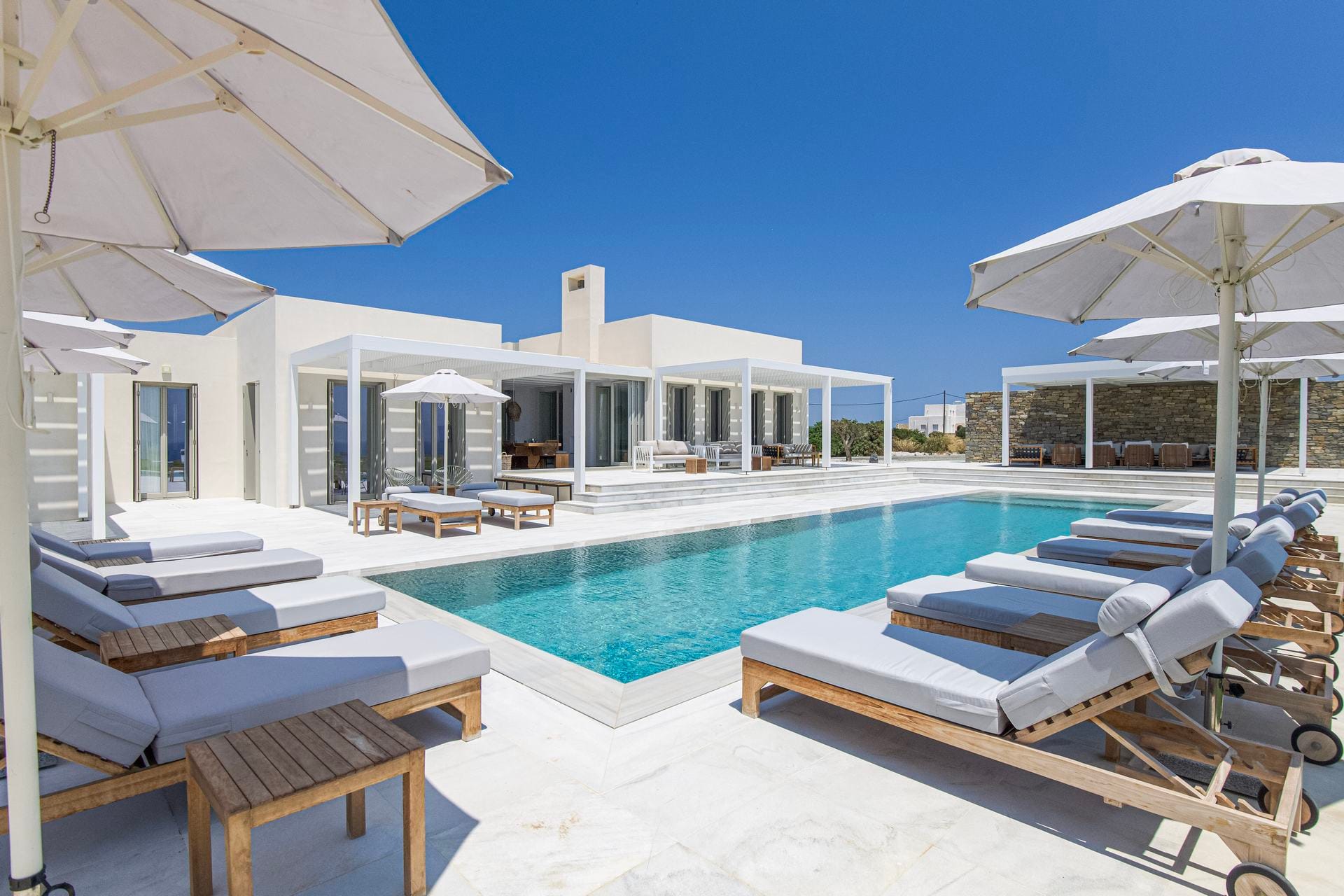 A striking fusion of white high ceiling walls, marble-like flooring, minimal wooden furniture, and contemporary décor paints an accurate picture of villa Anya’s interiors. Well-equipped with ultra-luxurious amenities, it offers guests all the comforts for a hassle-free holiday. Accommodation-wise, it features 7 bedrooms, with unlimited sea views and direct access to the outdoor area, hosting up to 14 guests. Everything is perfectly arranged, from a spacious living area to a fully equipped kitchen; each corner of the villa breathes out style and luxury.