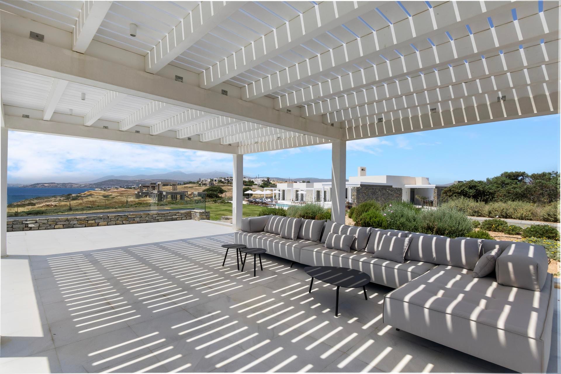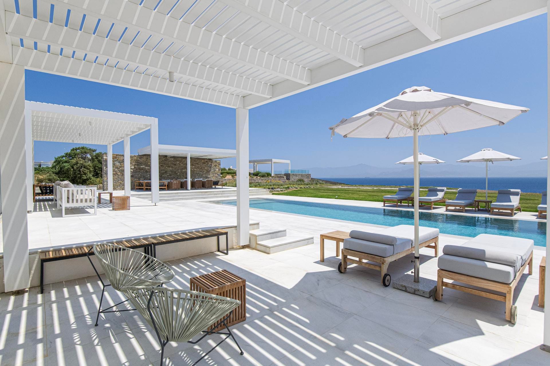 Set across from the Filizi islet, you will find Anya, a luxurious, well-designed Paros villa featuring incredible open green spaces and panoramic sea views. With its pristine white geometric lines and welcoming light-filled interiors, Anya is a very tempting villa option indeed. Add a refreshing swimming pool, a tennis court, and a helipad, and it would be fair to say that this charming luxury home lacks for nothing when it comes to summery allure. What better way to experience an authentic Greek vacation in Paros than a secluded, luxurious retreat?