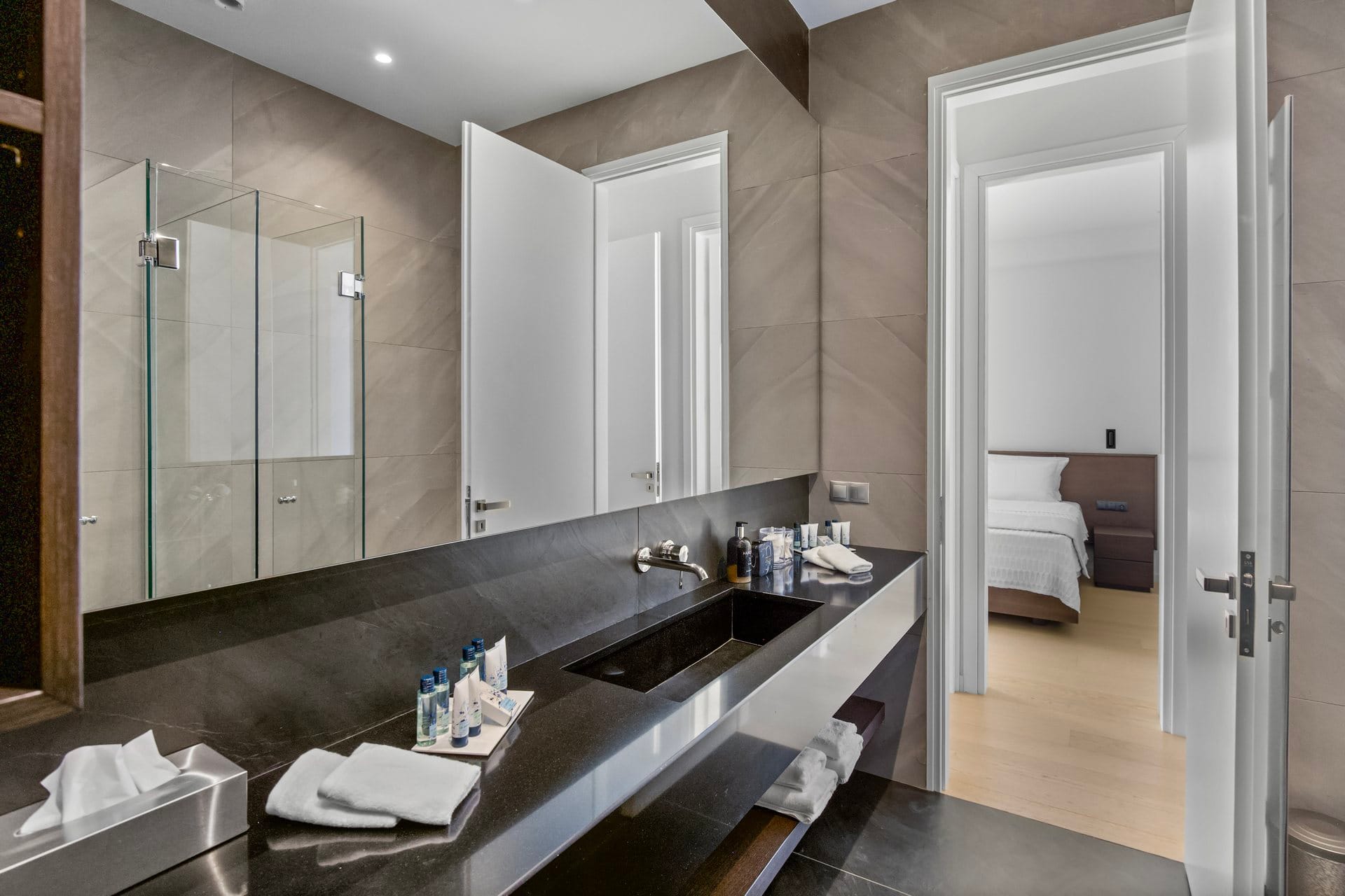 1 master bedroom with a double bed, ensuite bathroom, separate wardrobe, private office, pool access, sea view