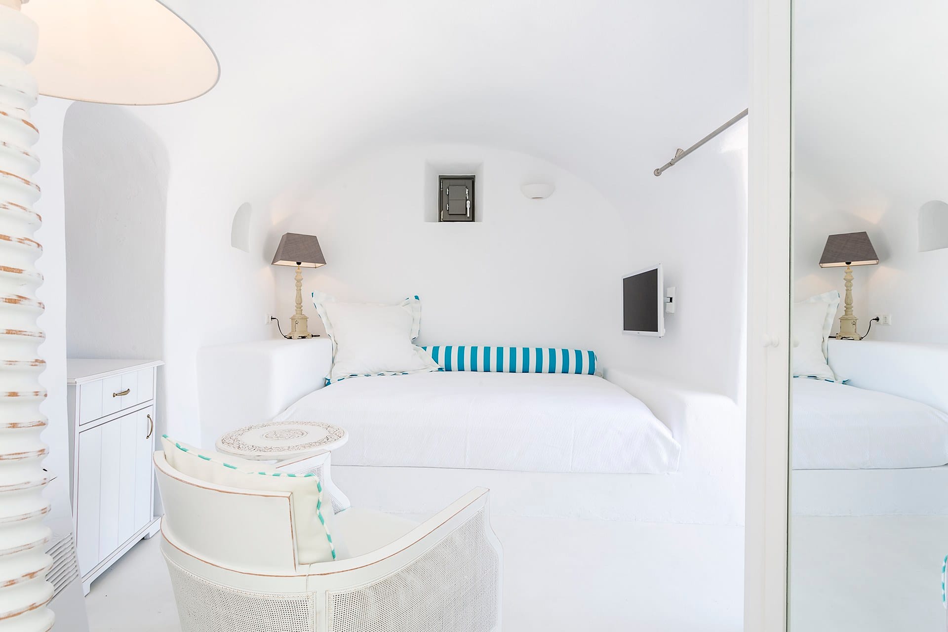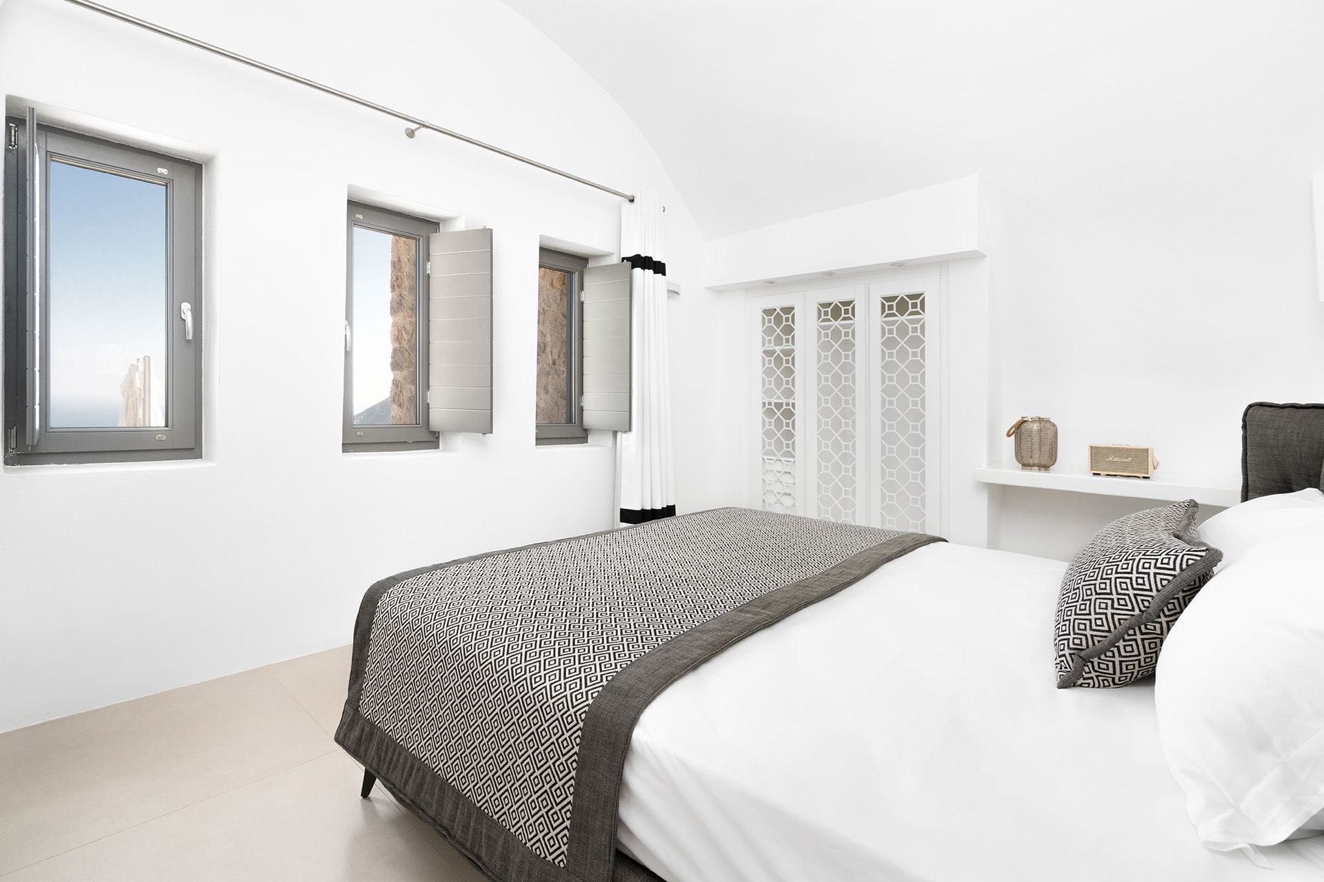 Located in Pyrgos Kallistis, in the middle of the island, this luxury Santorini villa welcomes up to 10 guests across 5 bedrooms. A renovated heritage property of ingenious design, Celadon was originally a lime kiln that has been carefully restored and integrated into this unique architecture—balancing clean-lined living with a strong sense of place. Set inland for privacy yet within easy reach of Santorini’s highlights, it is the perfect option for a relaxing and luxurious vacation.