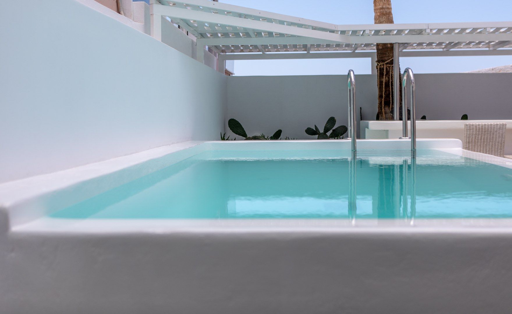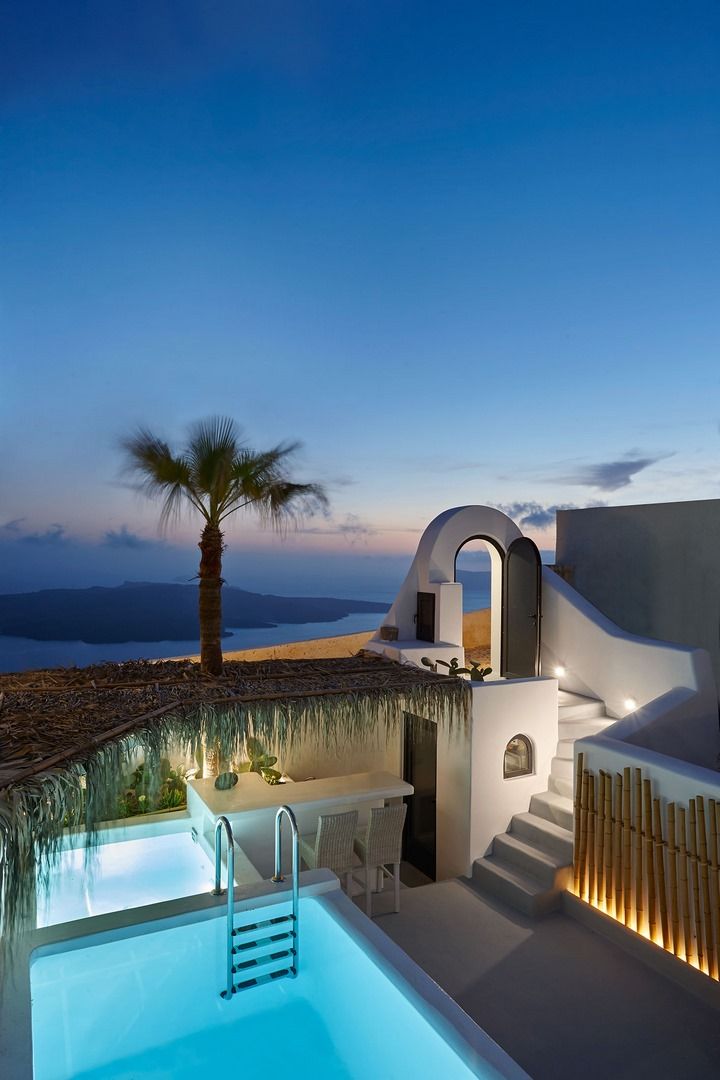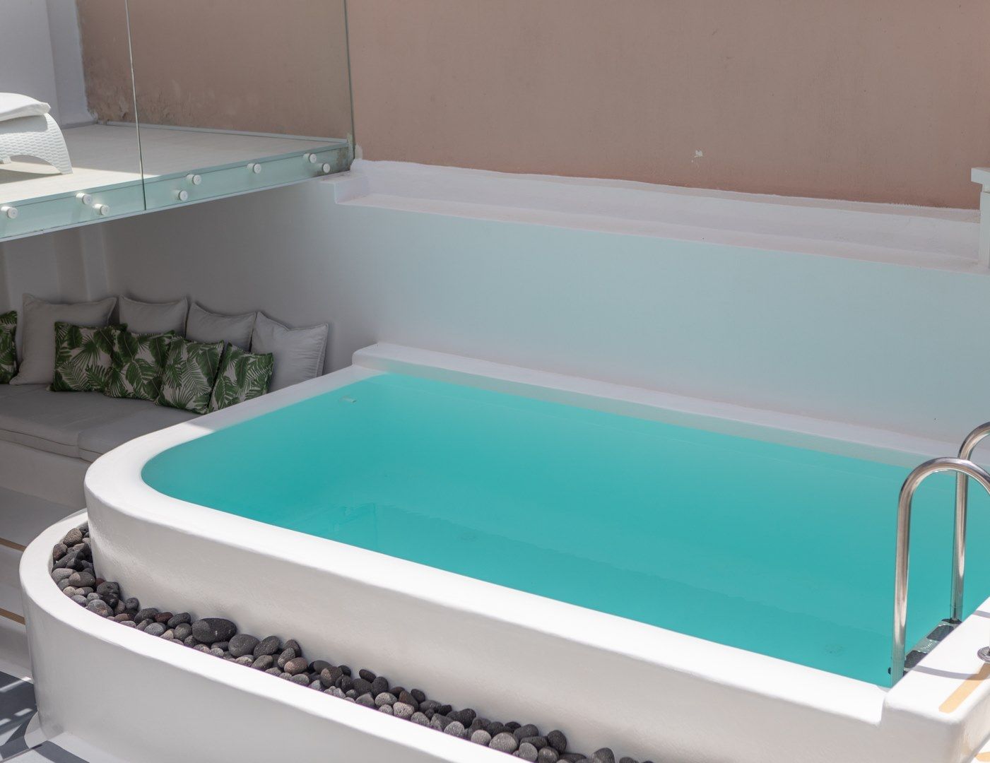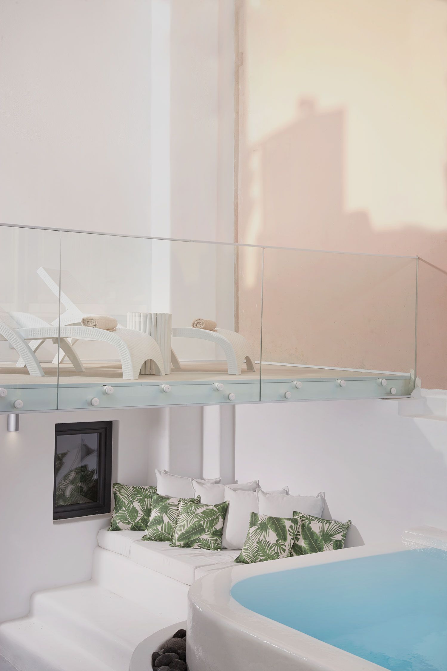 The moment you step off the public foot path, you enter your private oasis of calm, down your private steps to the ground level terrace, with a private outdoor freshwater swimming pool and outdoor heated jacuzzi. On a mezzanine level are sun loungers and shade and above that is the splendid private shaded deck with comfy sun loungers for cocktail moments at sunset whilst gazing at the enigmatic volcano of Santorini.
