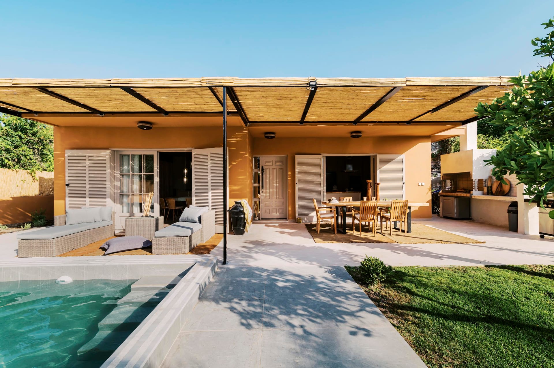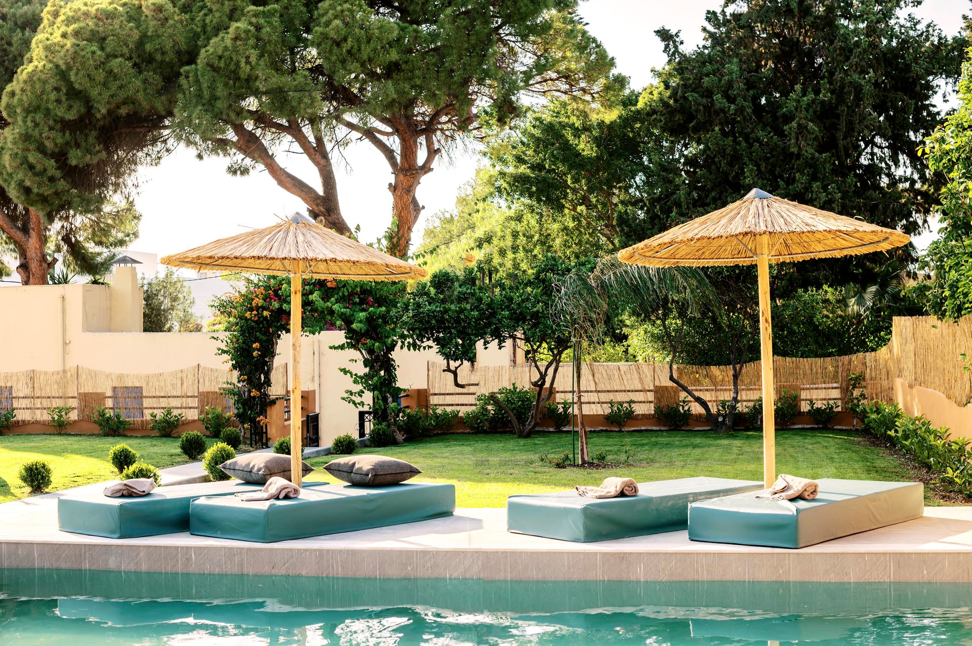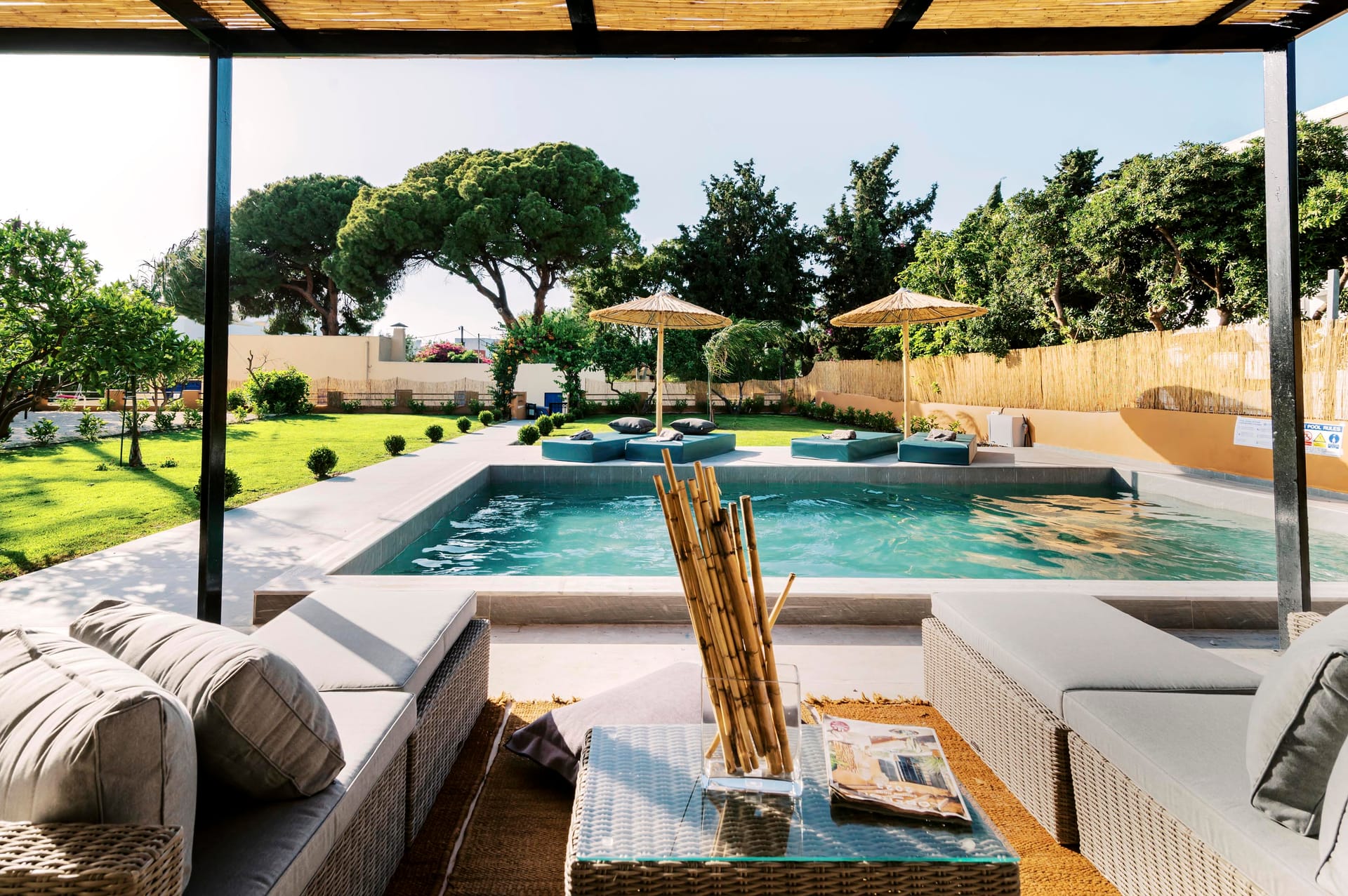 The moment you step off the public foot path, you enter your private oasis of calm, down your private steps to the ground level terrace, with a private outdoor freshwater swimming pool and outdoor heated jacuzzi. On a mezzanine level are sun loungers and shade and above that is the splendid private shaded deck with comfy sun loungers for cocktail moments at sunset whilst gazing at the enigmatic volcano of Santorini.