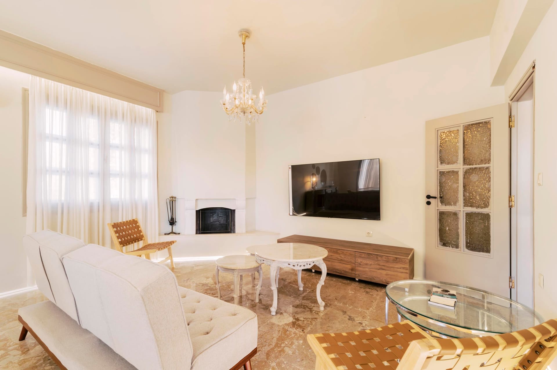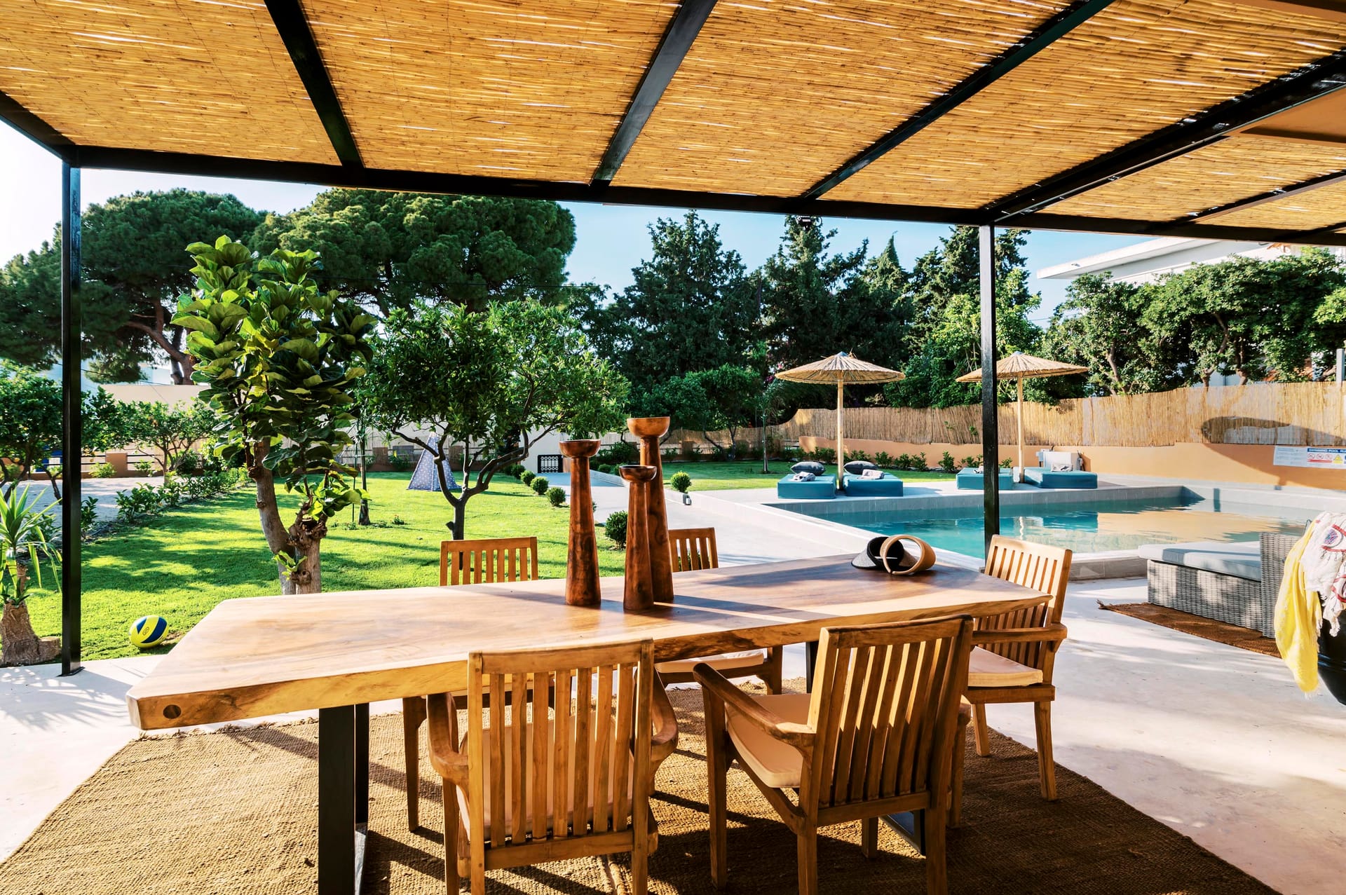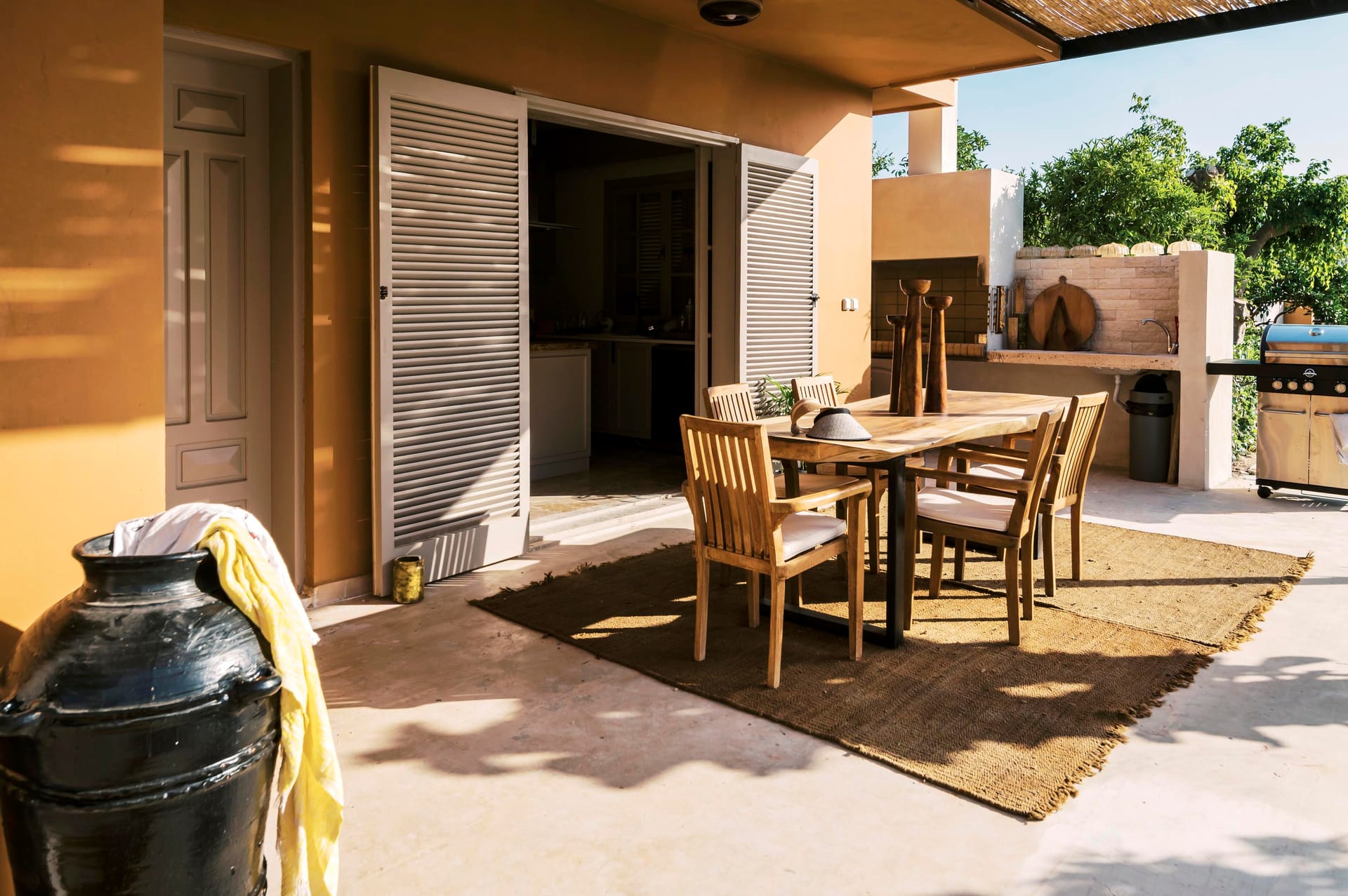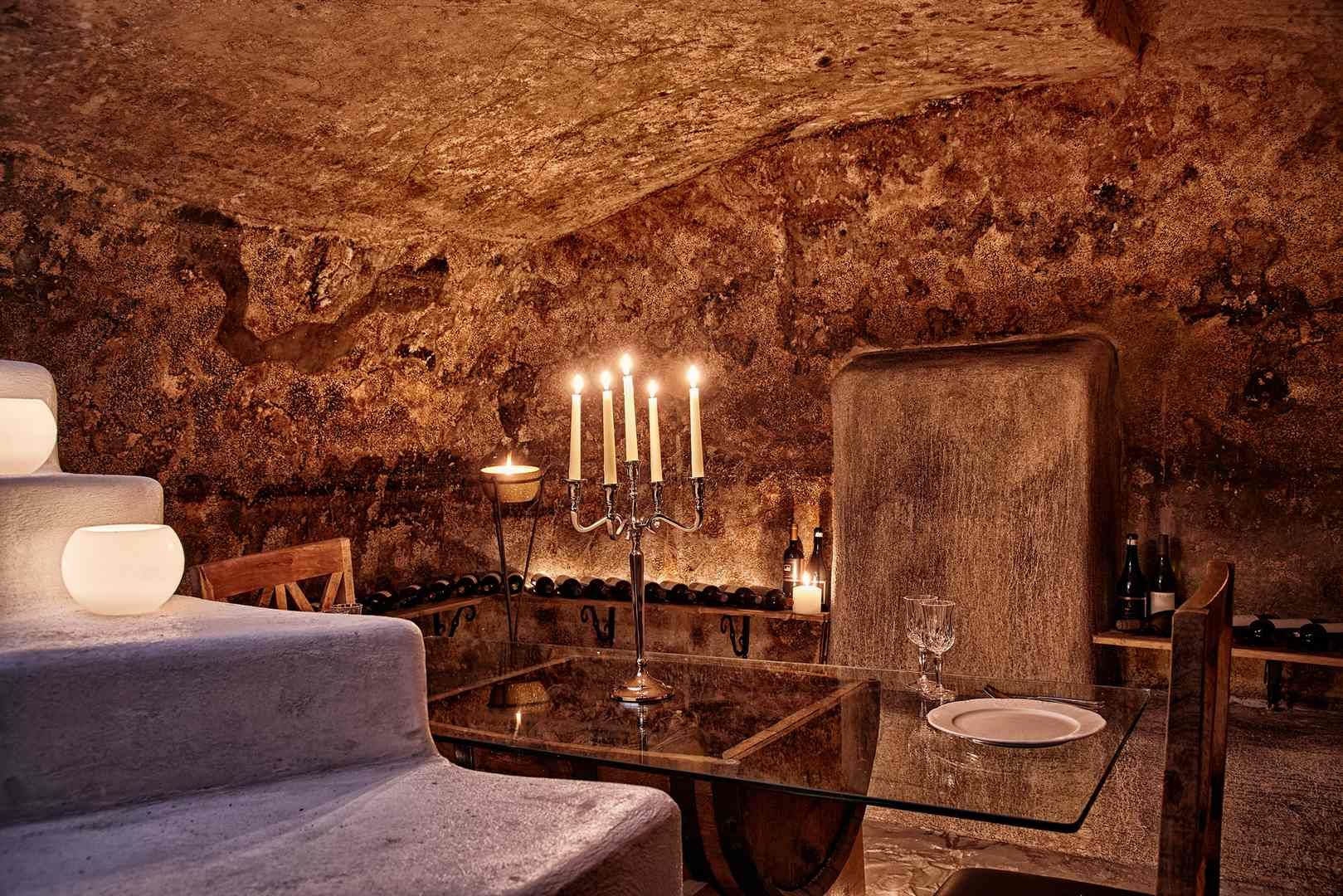 Diva villa has retained the original Cycladic design features of high arches and windows, and smooth cured lines. From the pool terrace the cave house villa extends back to the large living space with sofa and chairs, and the gorgeous king-sized bed. Off this room are the double ensuite bathroom, the walk-in closet, the indoor pool, a steam room, and down the steps to a fully stocked wine cellar with table and chairs, everything for your pleasure in Diva Villa!