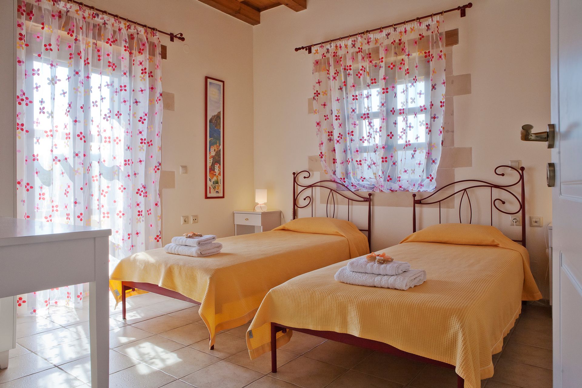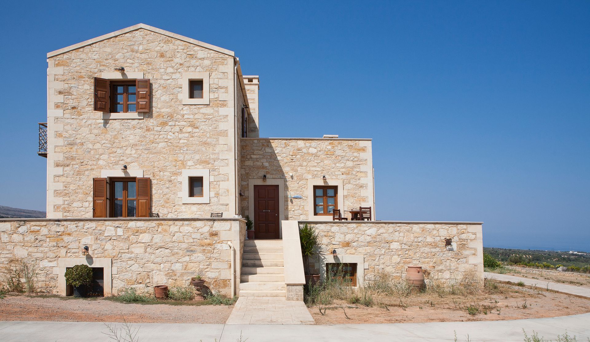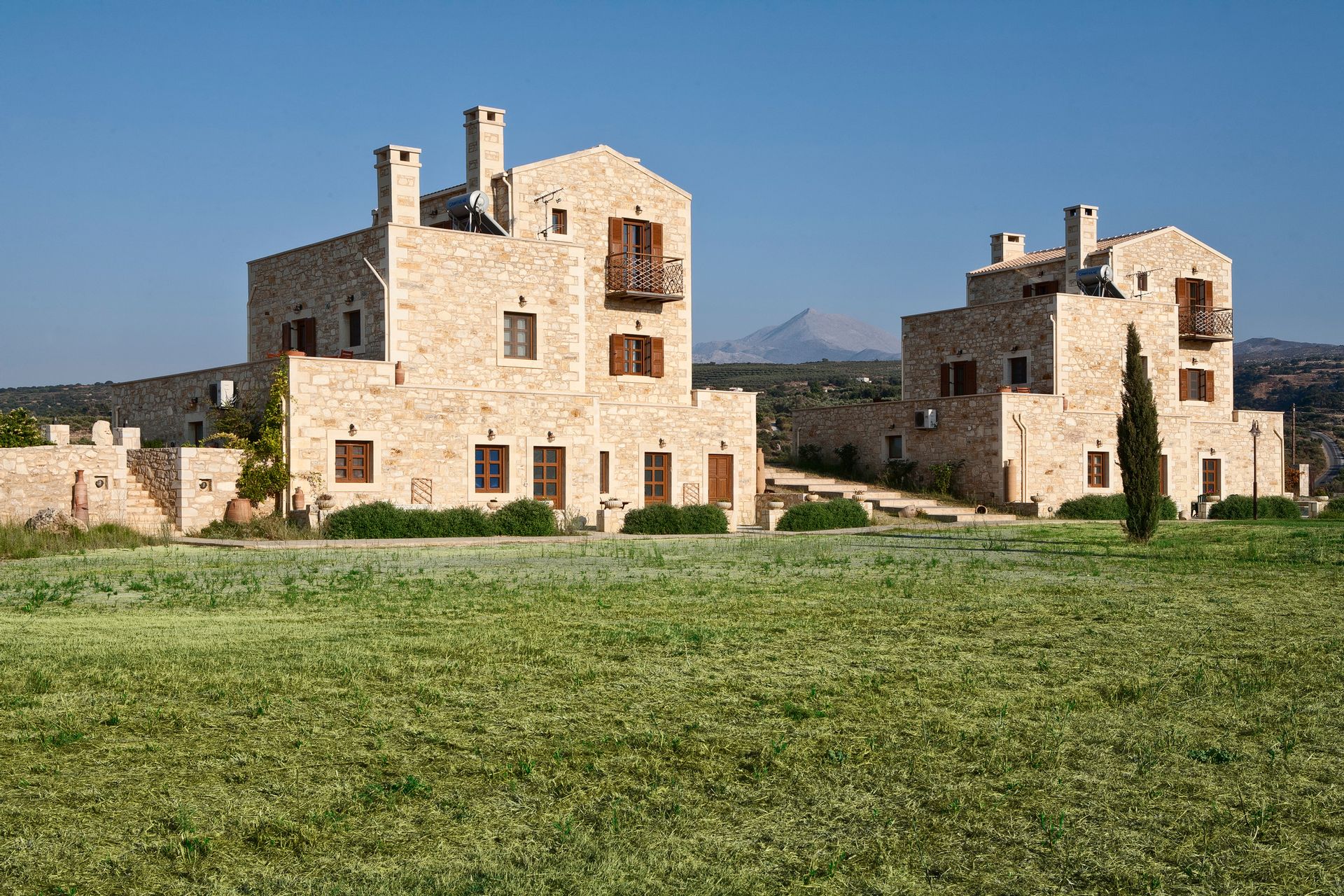 These 2 fully equipped stone-built villas are offering a pool overlooking the green-covered mountains of Psiloritis and Lefka Ori and are situated on a hilltop overlooking the valley of Pikris, near Rethymnon. Free Wi-Fi, roofed BBQ area and children's playground are only some of the facilities these 8 bedrooms, 4 bathrooms villas are offering. Each one of the 2-level villa has wooden beamed ceilings and tasteful furnishings. The ground floor features a spacious living area along with a fireplace, dining area and a fully fitted kitchen. Also 2 bedrooms, one with double bed and one with 2 twin beds and with individual balcony each bedroom along with a bathroom can be found there. Going up to the second floor the other 2 bedrooms again one with double bed and one with 2 twin beds and with individual balcony each bedroom along with one more bathroom is situated there. Other facilities include a flat-screen TV, DVD player, CD player and a washing machine.On the outside and in the 8 acres fenced private land, someone can find the 85sqm swimming pool and enjoy the silence and the view that this property is offering. Suitable for all kinds of interests like hiking, bicycle riding, walking, exploring the countryside or even just hand around the villa.