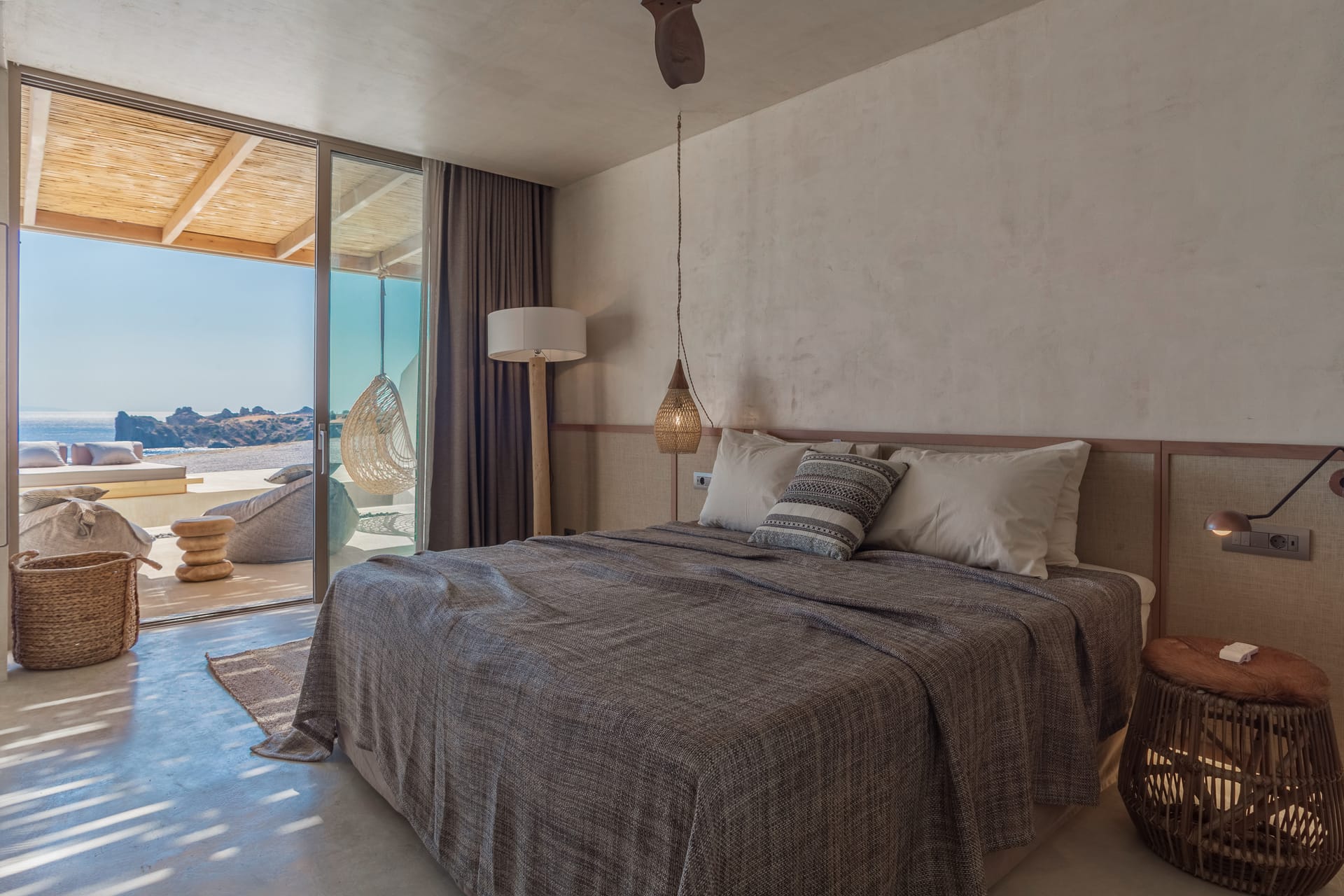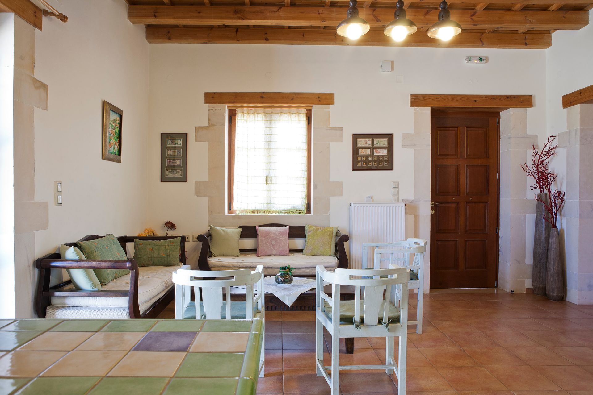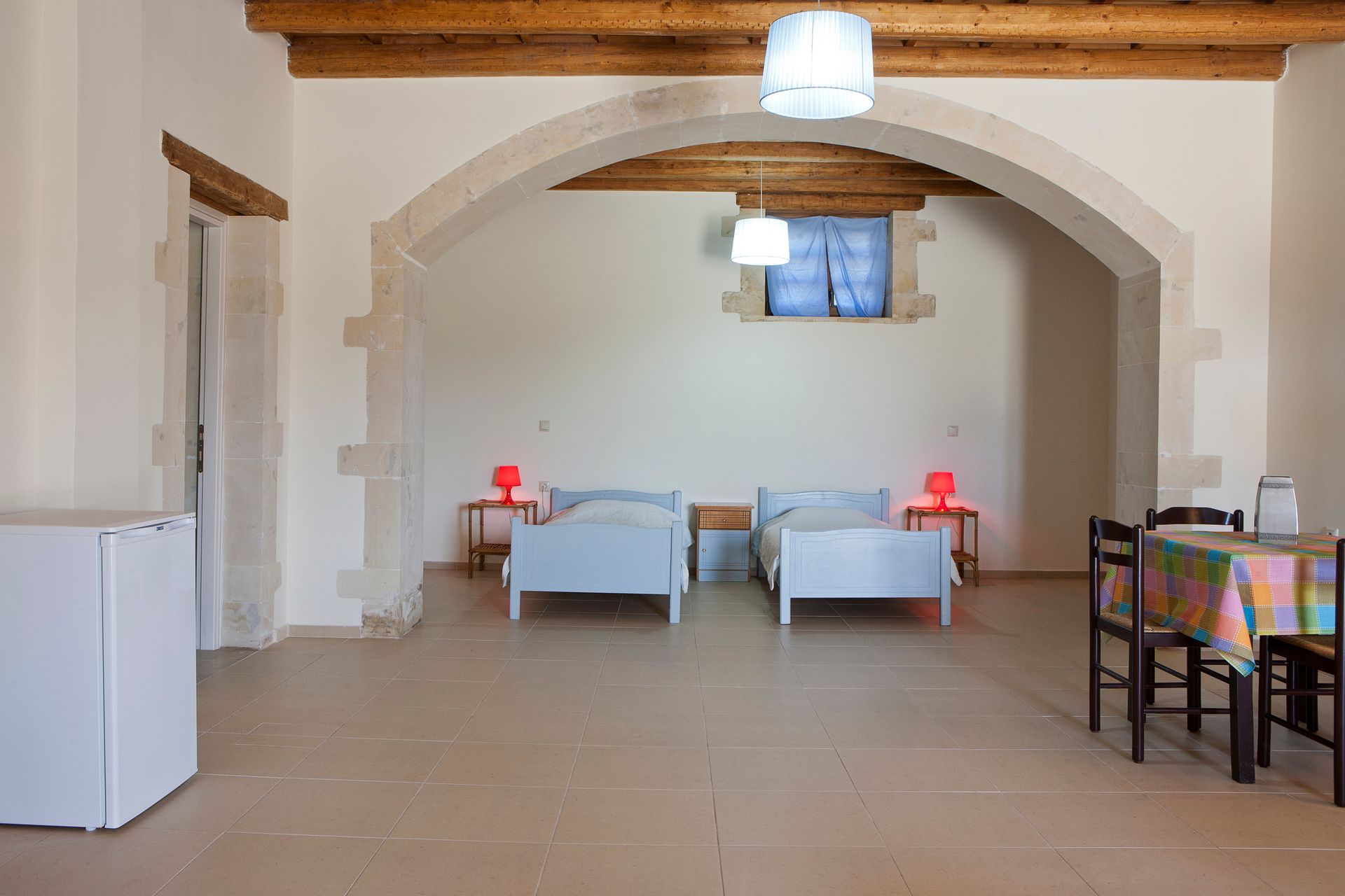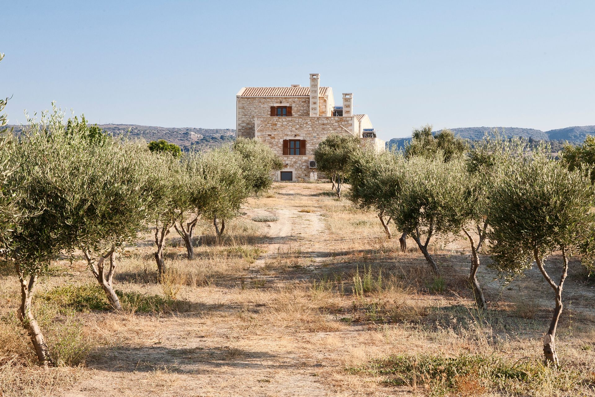These 2 fully equipped stone-built villas are offering a pool overlooking the green-covered mountains of Psiloritis and Lefka Ori and are situated on a hilltop overlooking the valley of Pikris, near Rethymnon. Free Wi-Fi, roofed BBQ area and children's playground are only some of the facilities these 8 bedrooms, 4 bathrooms villas are offering. Each one of the 2-level villa has wooden beamed ceilings and tasteful furnishings. The ground floor features a spacious living area along with a fireplace, dining area and a fully fitted kitchen. Also 2 bedrooms, one with double bed and one with 2 twin beds and with individual balcony each bedroom along with a bathroom can be found there. Going up to the second floor the other 2 bedrooms again one with double bed and one with 2 twin beds and with individual balcony each bedroom along with one more bathroom is situated there. Other facilities include a flat-screen TV, DVD player, CD player and a washing machine.On the outside and in the 8 acres fenced private land, someone can find the 85sqm swimming pool and enjoy the silence and the view that this property is offering. Suitable for all kinds of interests like hiking, bicycle riding, walking, exploring the countryside or even just hand around the villa.