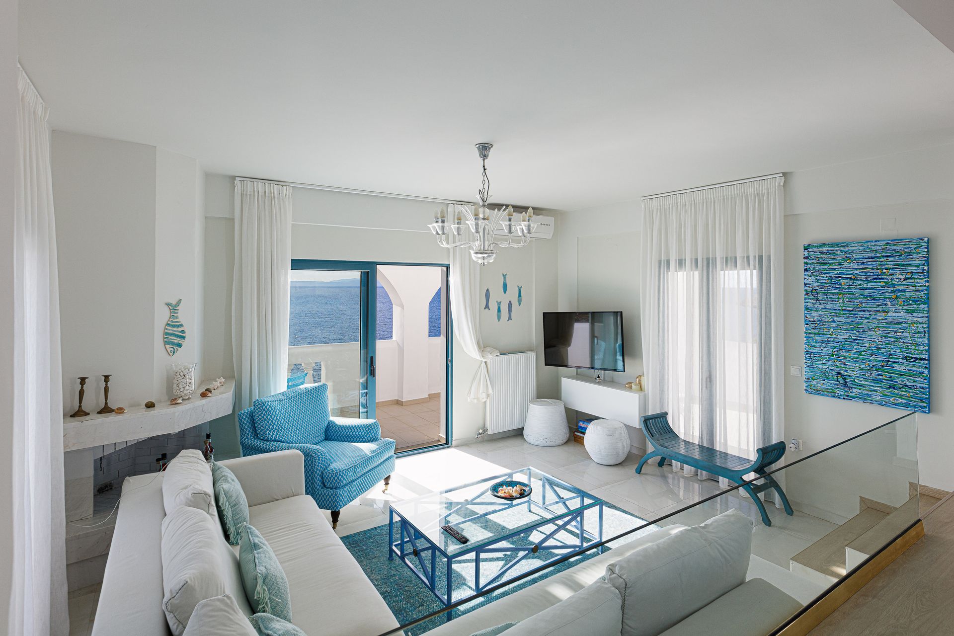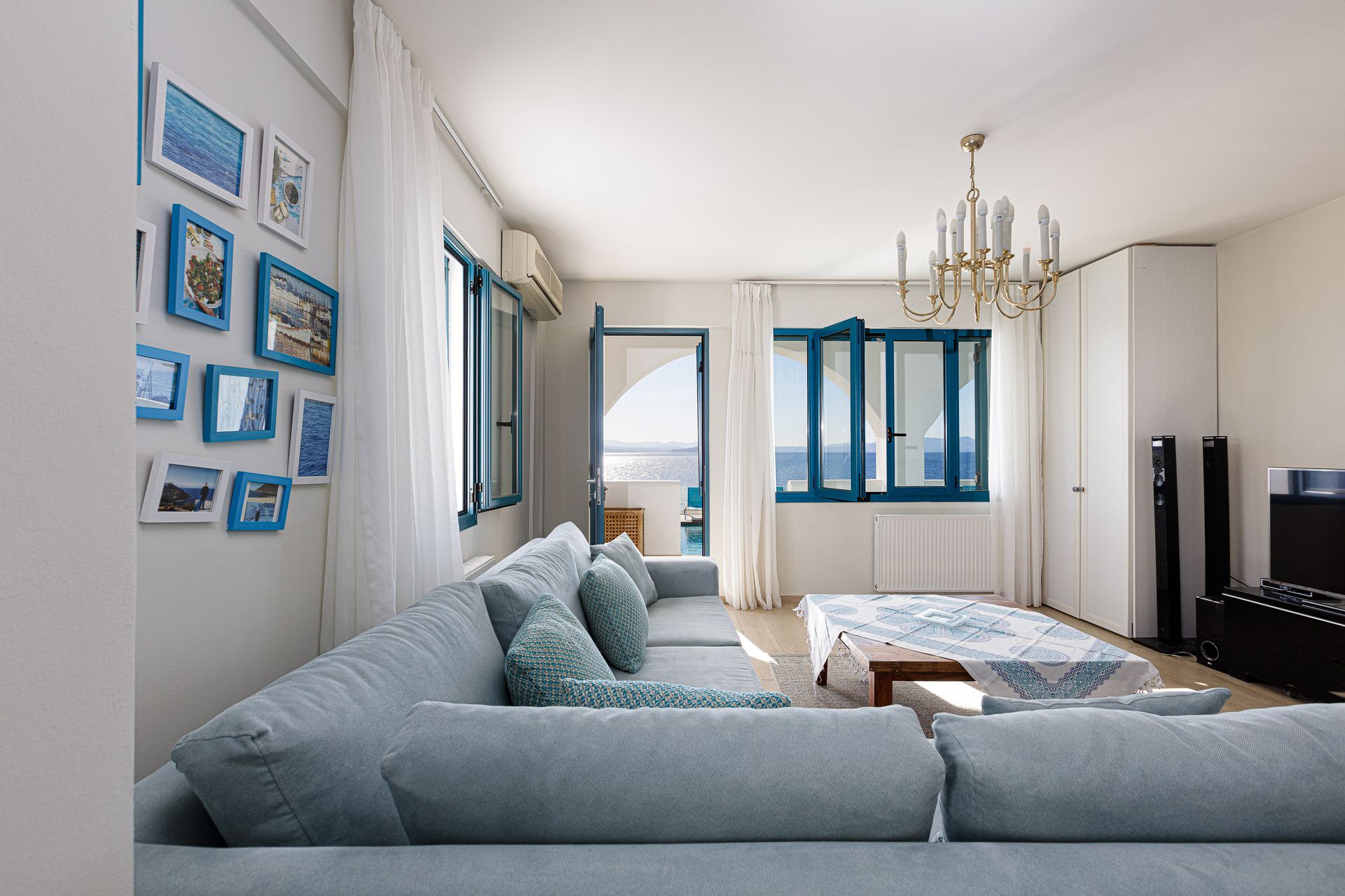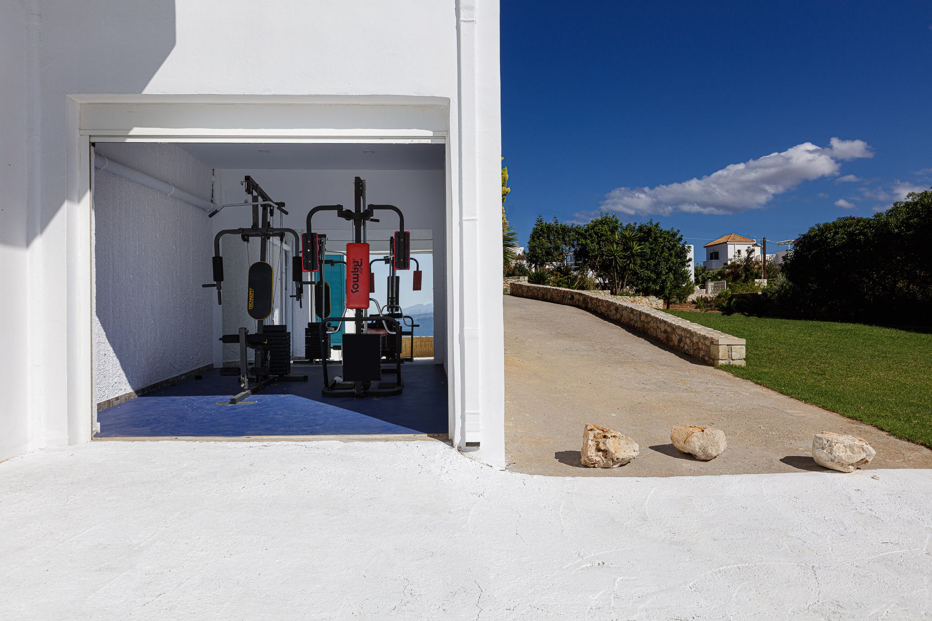 The villa is about 300 sq. m. and consists of six bedrooms, one gym with its own bathroom, one large kitchen and two living rooms. Every room of the villa has a satellite, plasma screen TV, whereas the living room near the kitchen and the one at the ground floor have two 3D televisions.