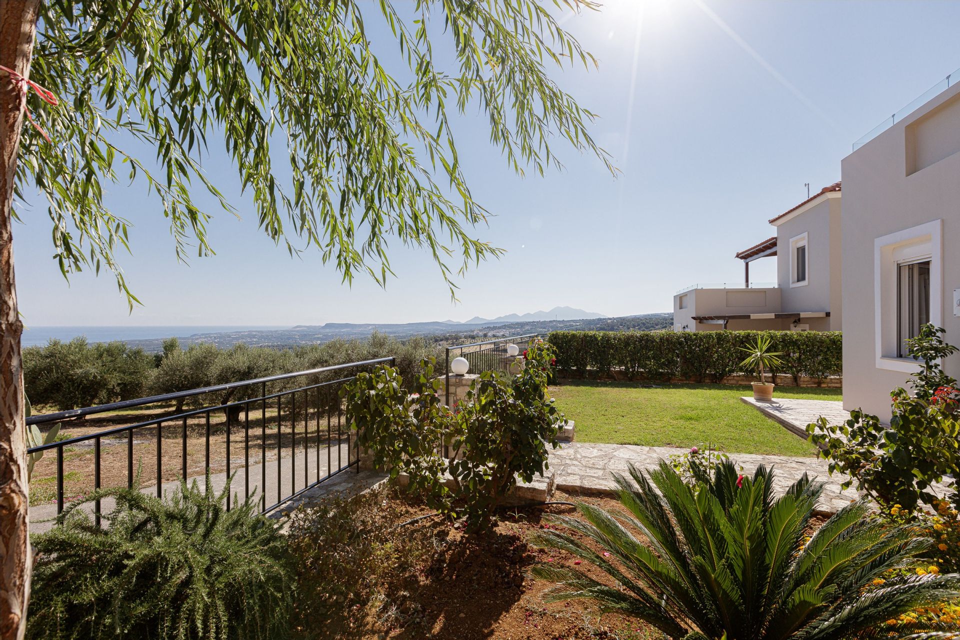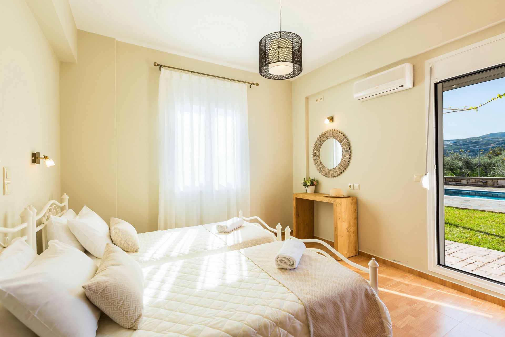 The interiors of this newly- built villa is divided into two levels reflecting a cozy trend, decorated in light colors. On the first level, the living room consists of leather sofas where the whole family can gather, as well as an open fireplace and a well-equipped kitchen with a dining table. Few steps away you will find the twin bedroom and a bathroom. The other two bedrooms are located on the second level; each of them features a double bed and has access to a balcony with amazing views.