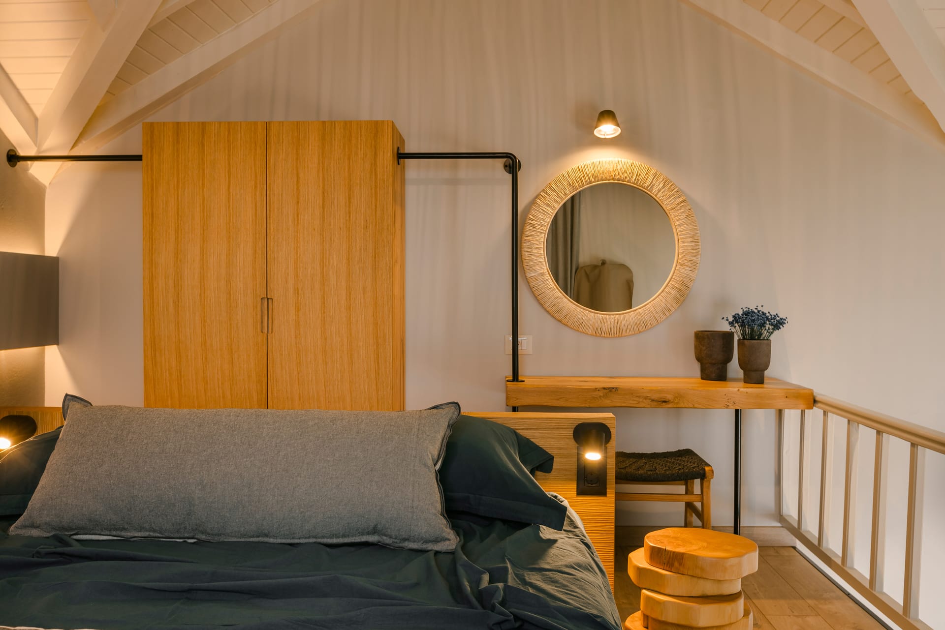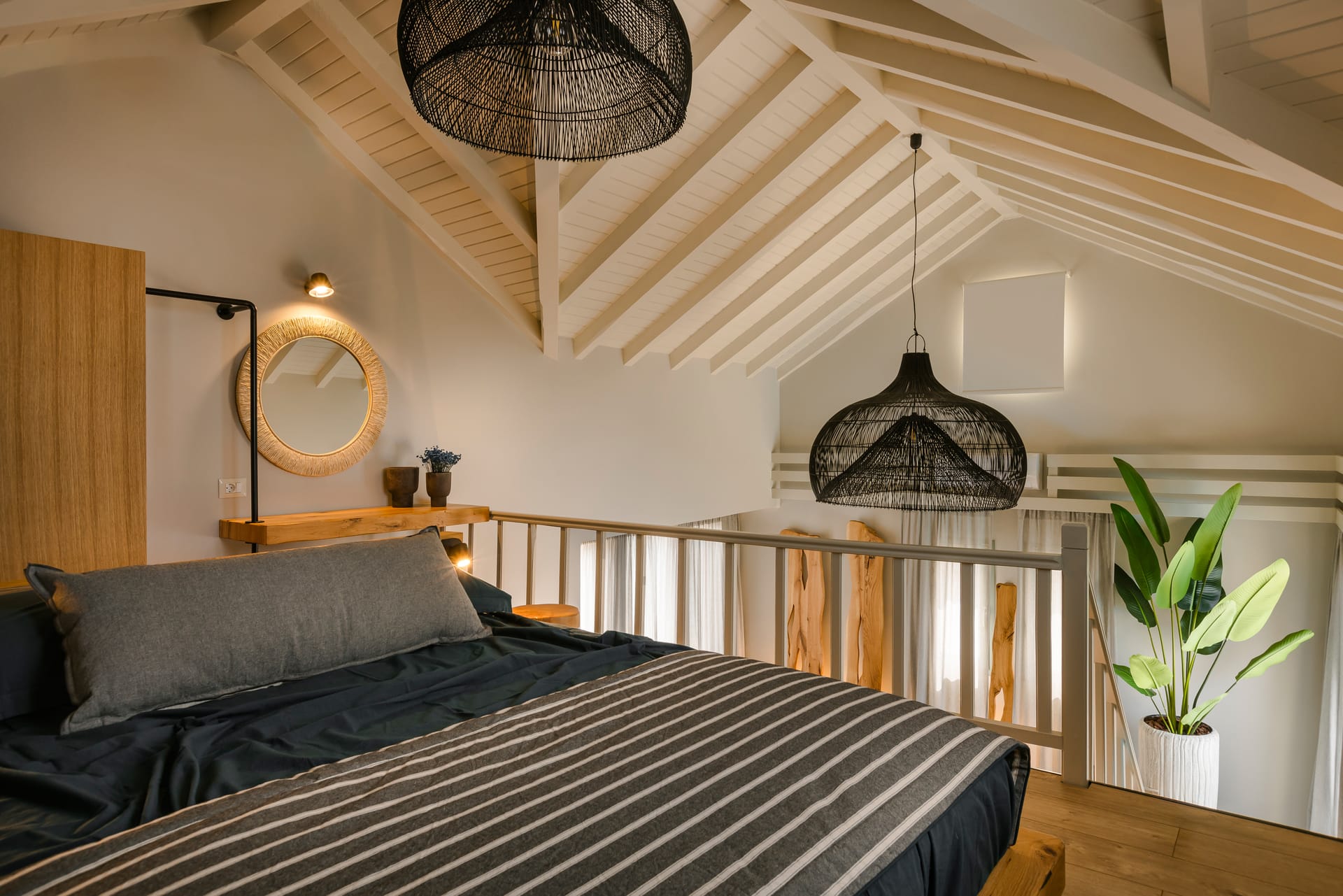 Entering Eros Villa you will find an open plan living area that offers direct access to the pool terrace, with a living room and an open fireplace, as well as a practical and fully equipped kitchen with dining table. The ground floor includes a twin bedroom and a bathroom, while a few stairs upwards there are the two remaining bedrooms of the villa with a balcony, and a family bathroom.
