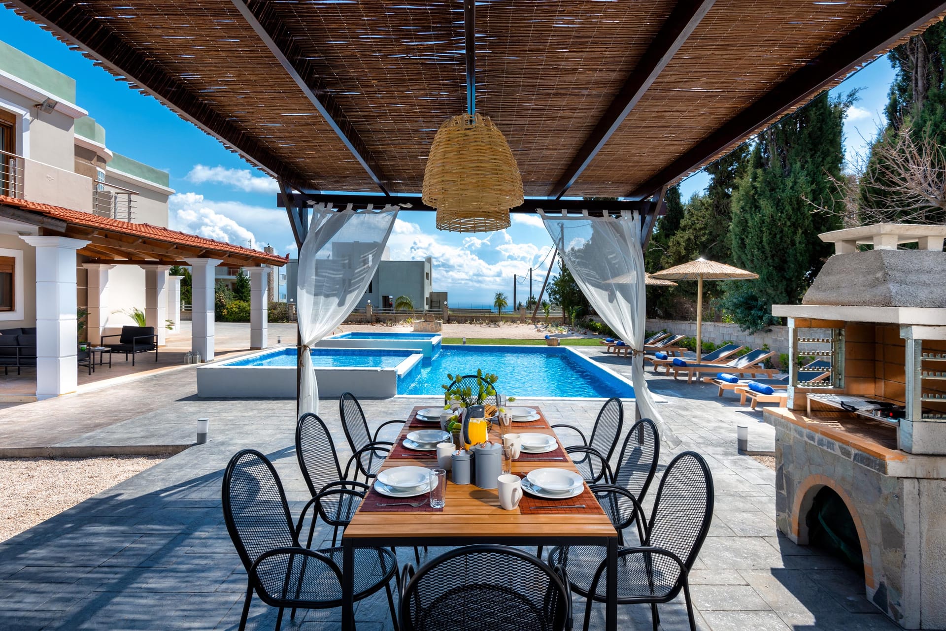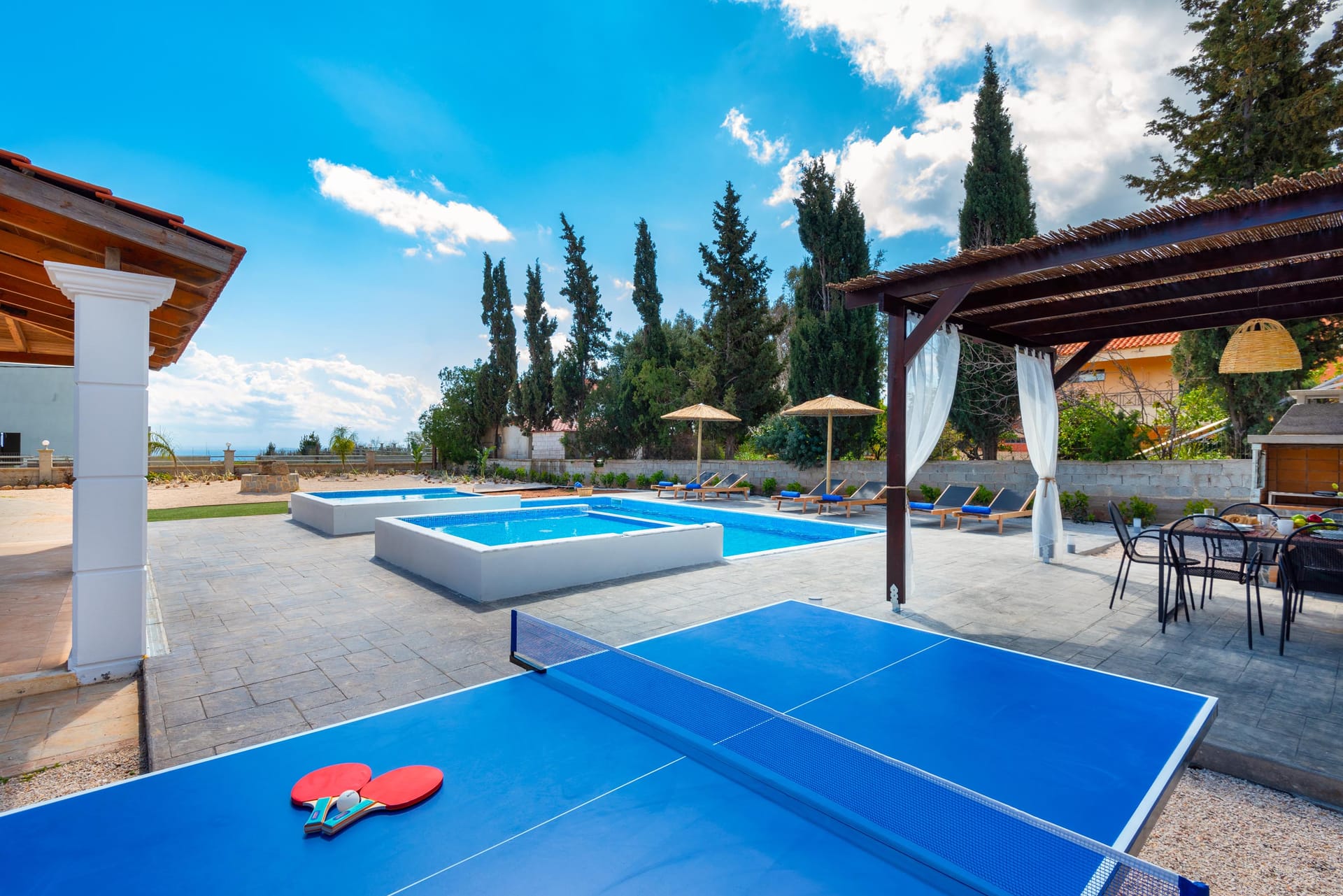 Private Swimming pool 13 X 6, Children’s pool, BBQ with dining table and chairs, lounge seats, garden with tomatoes etc, 4 cars parking