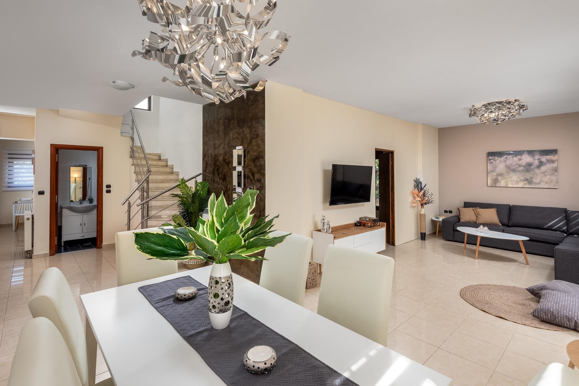 Stepping into the villa from the first floor, one finds himself in the living/lounge area, with its comfortable sofas, Flat screen TV, WIFI, etc. The fully fitted kitchen is well equipped with oven, hob, fridge, microwave, etc. On the same floor there are 2 bedrooms, one with double bed and the other one with 2 twin beds. All of them have their own bathroom, TV, air-condition, reading lamps, massive wardrobes.