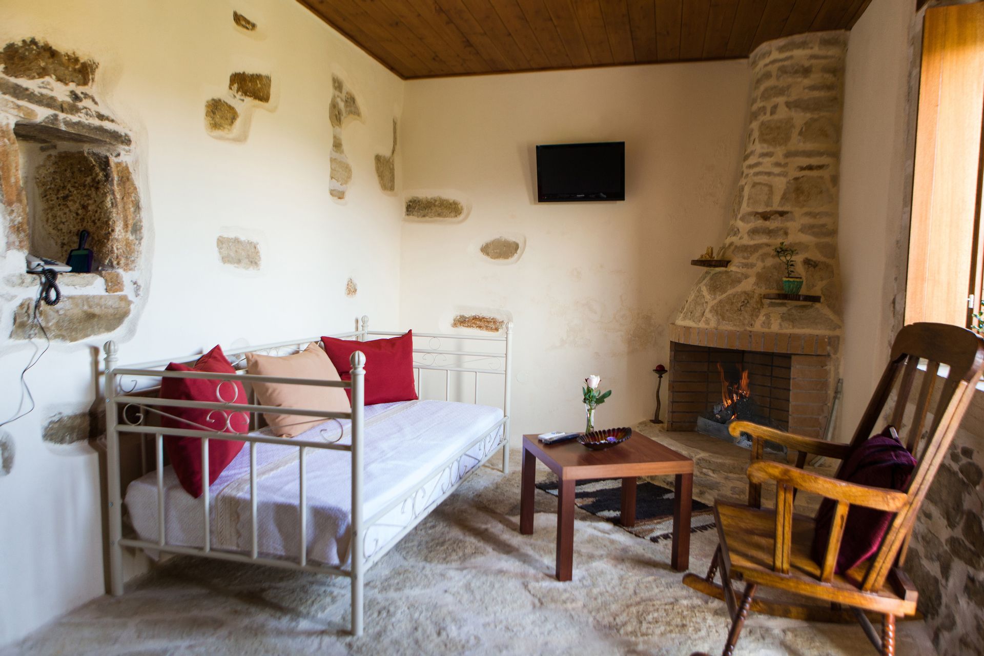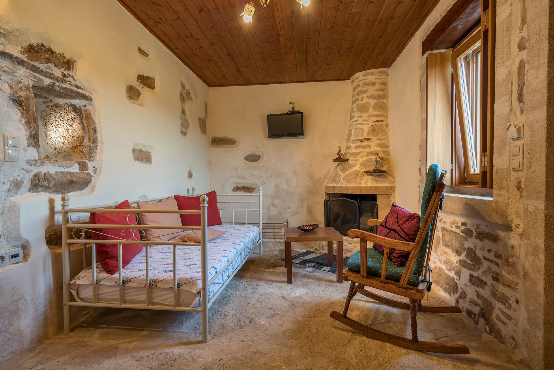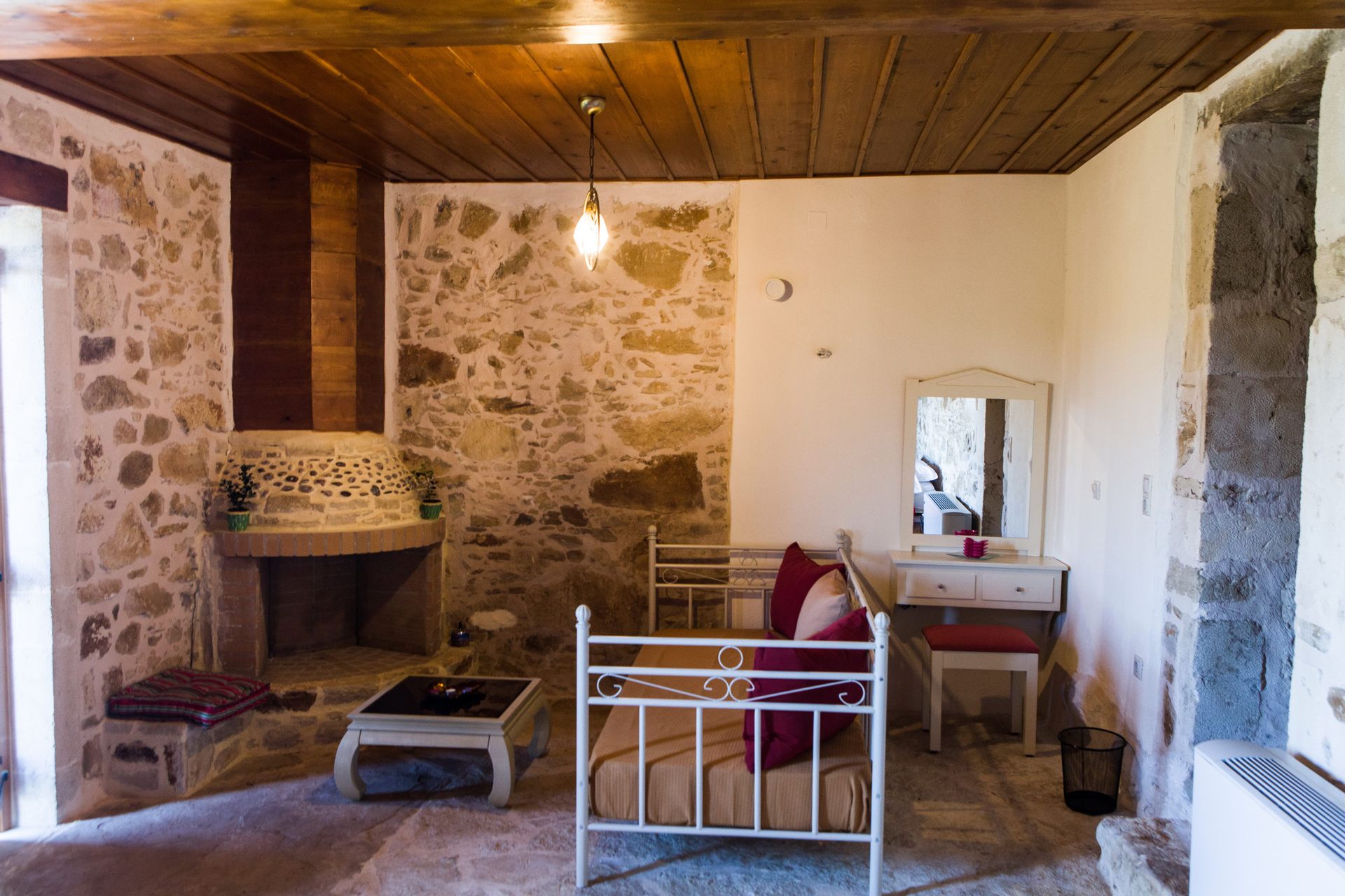 Next to ‘Fournos’ our last apartment is named ‘Axeronas’ and can sleep 3 people since there is only on double bed and one sofa bed in the living room. All of them have Wi-Fi, air-conditioning, Satelite TV & LCD TV with USB input, fireplace, living room and refrigerators. There is a communal area where you can find a large flat screen TV, DVD, Stereo system, play cards, some other games like backgammon, a PC with printer and fax machine. Next to this area the dining area for the entire group and a communal kitchen is there for you to prepare your dinner or breakfast. For a small fee the owners can prepare your breakfast or dinner if you wish to relax and do nothing at all.