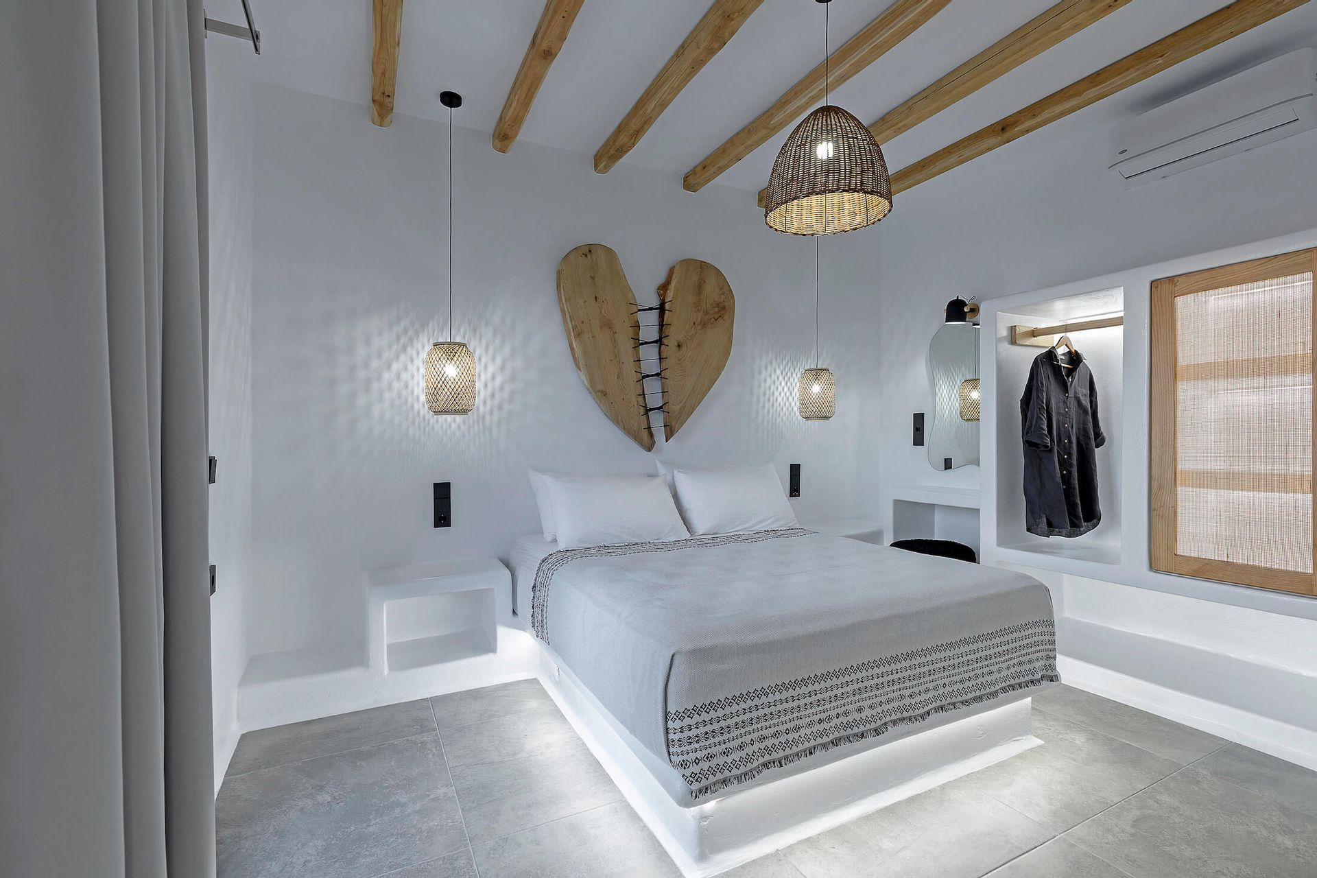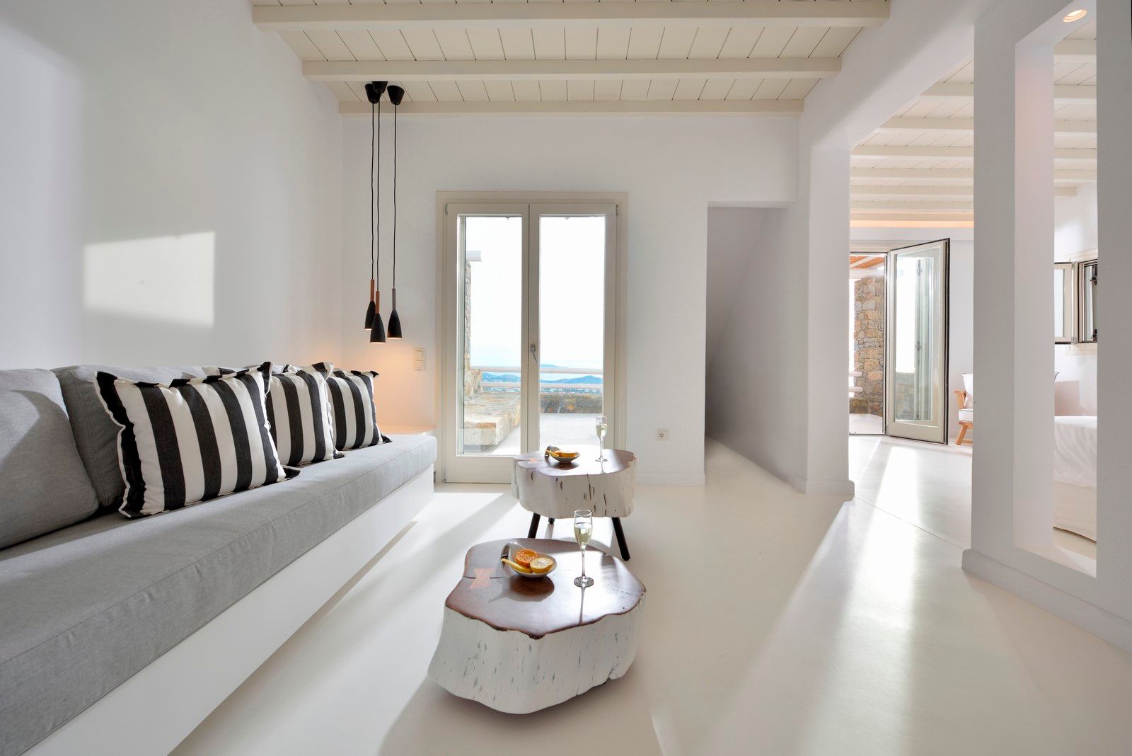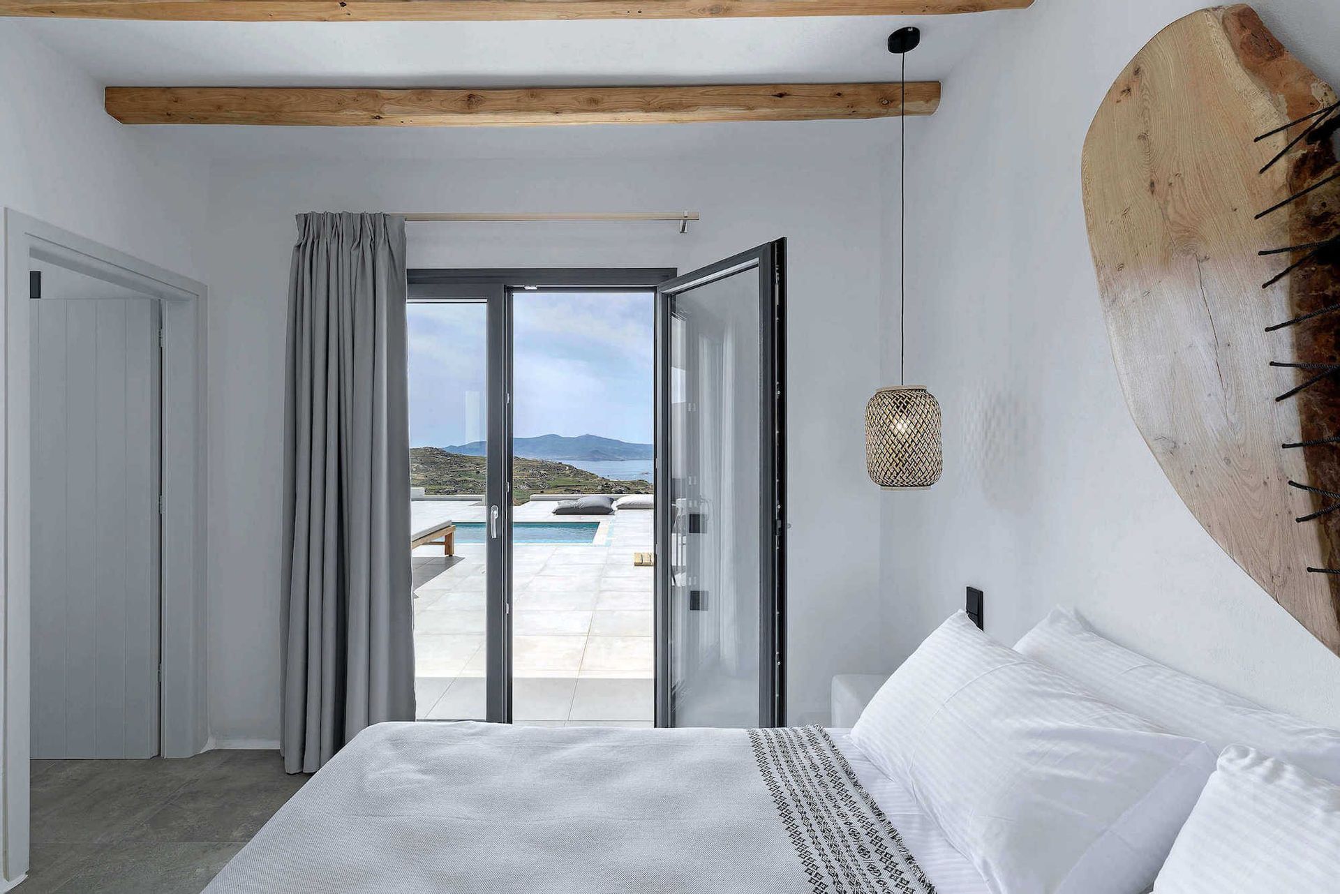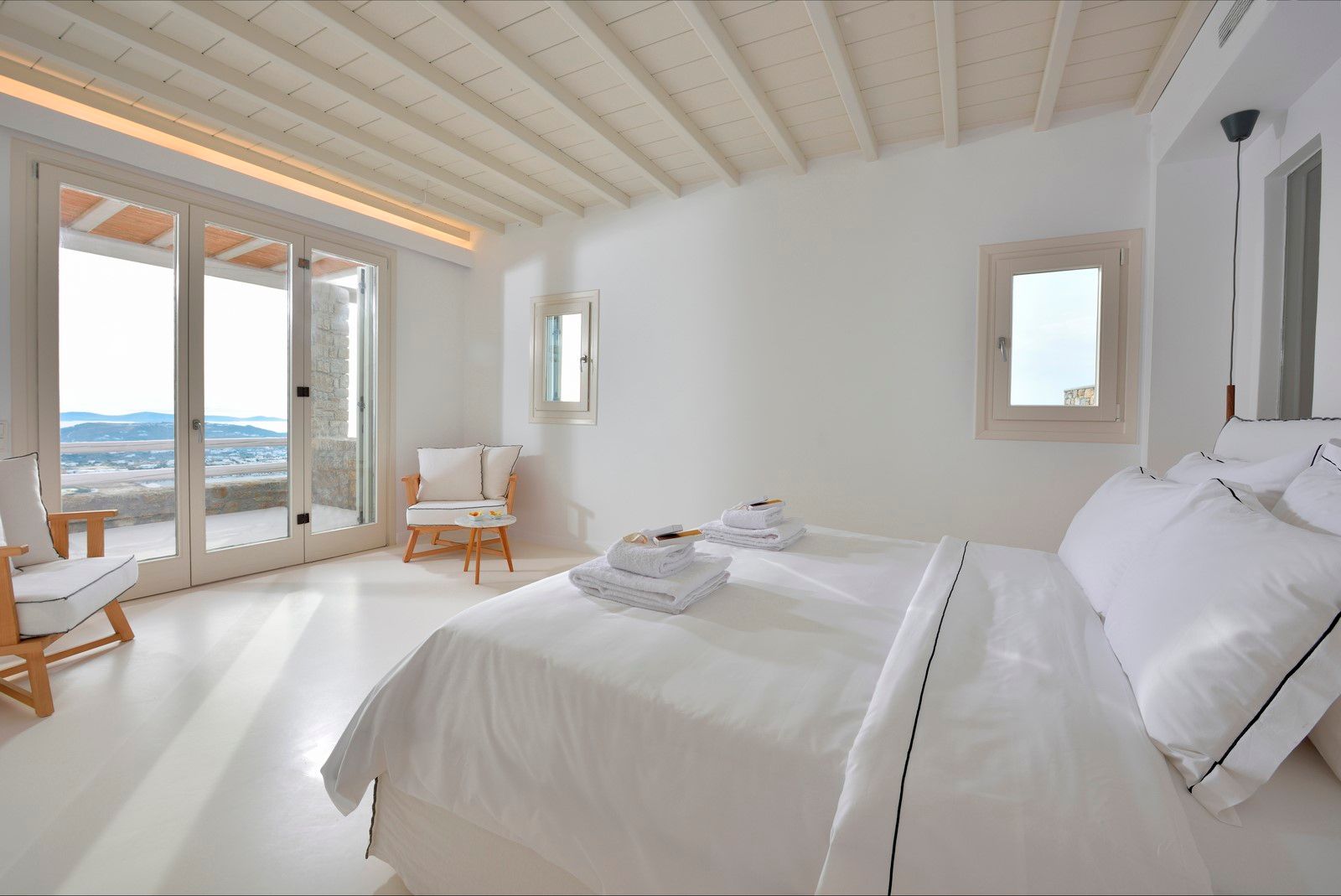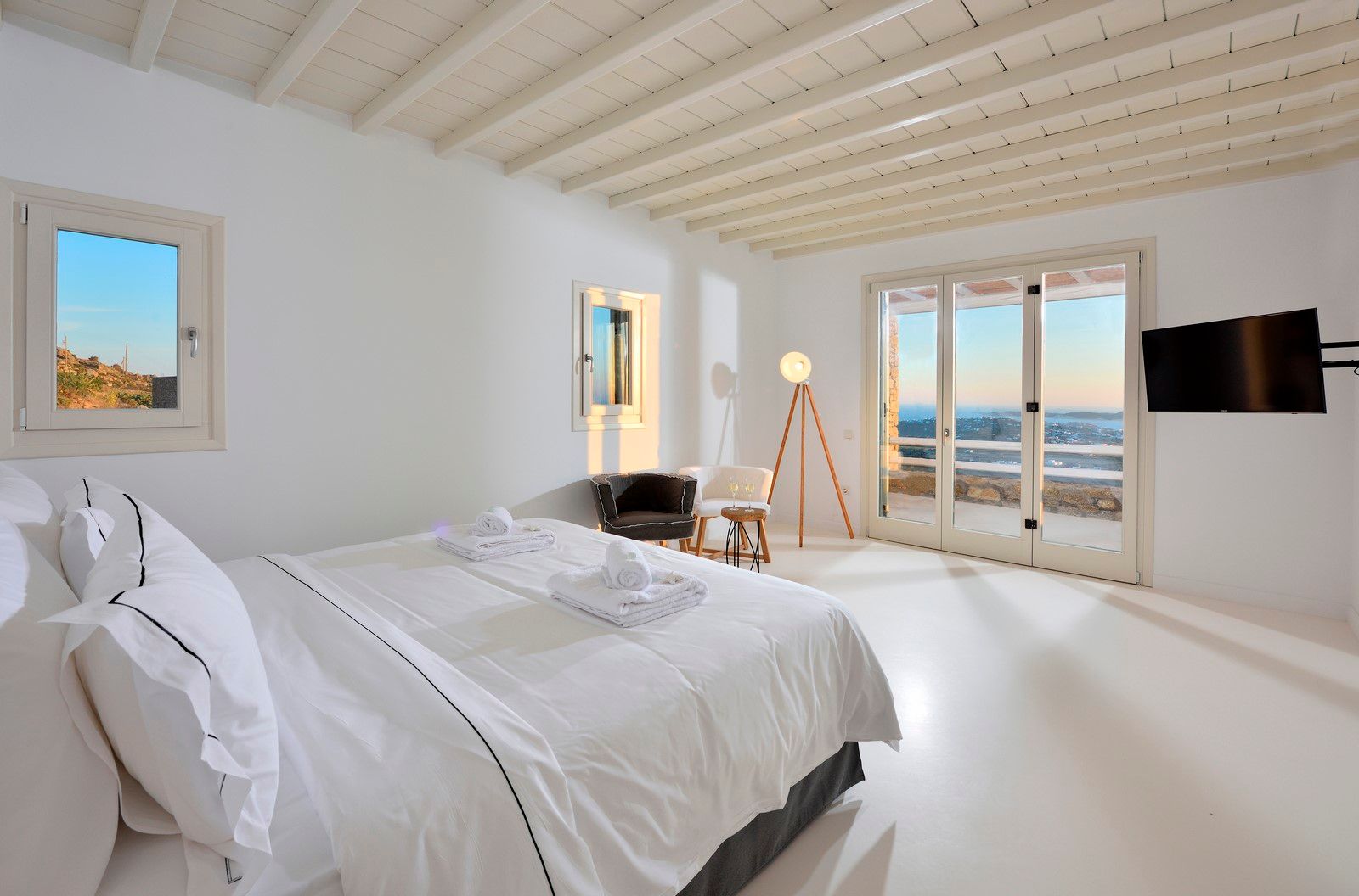 Villa Amaryllis has 3 bedrooms, 2 master with en-suite bathrooms and one separate bedroom. From the grand master suite, the guest has a panoramic view of Mykonos Island and during nighttime it feels like dancing lights.