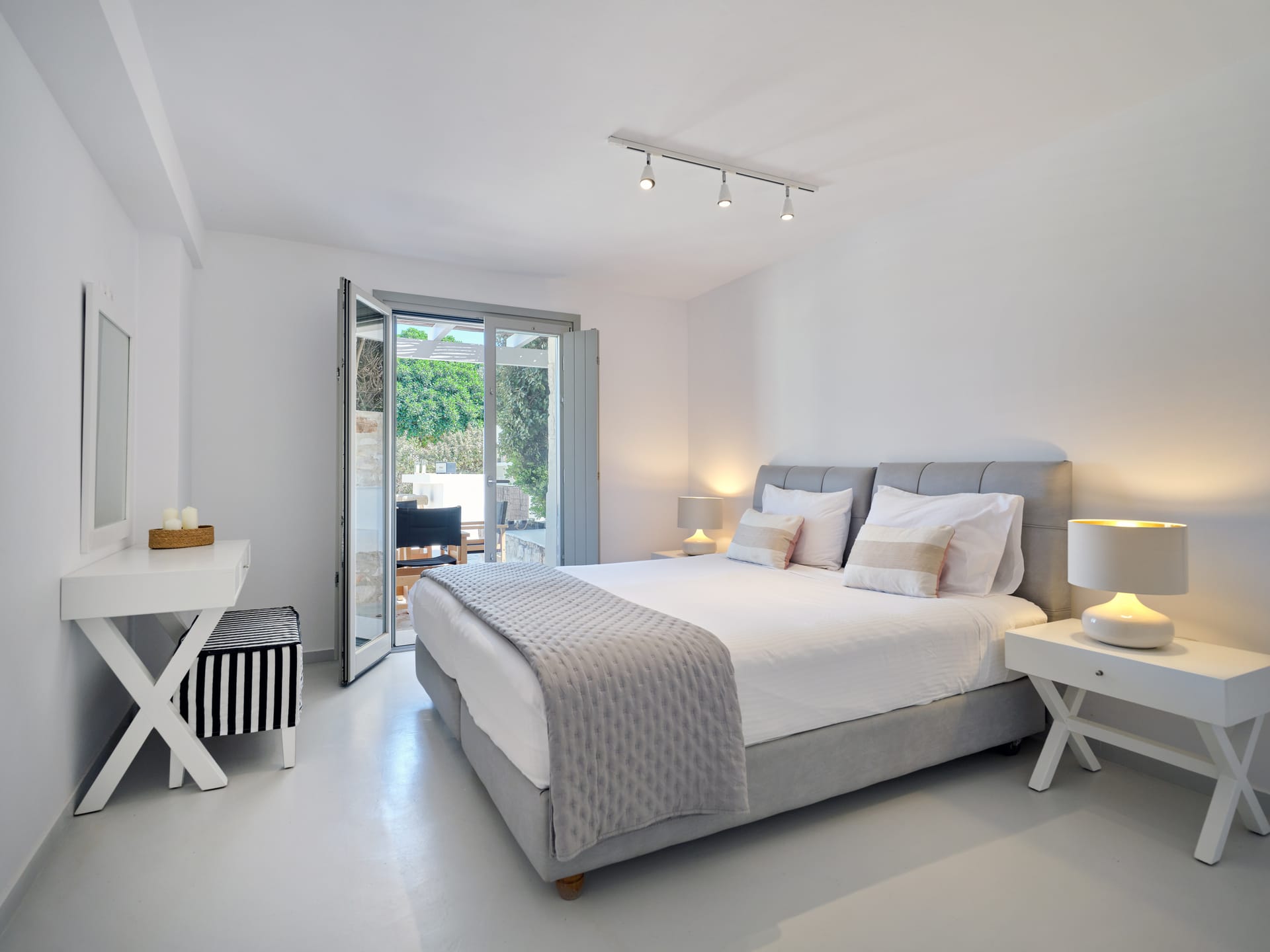 Outside, you’ll find a pool and plenty of places to sit and dine, all of which share that same breathtaking view. Somewhat tucked away, you’re within reach of local bars and restaurants, and only around a seven-minute drive away from Psarou Beach. The pool at this home is not heated, however, it can be heated for an additional fee. Please enquire when booking.