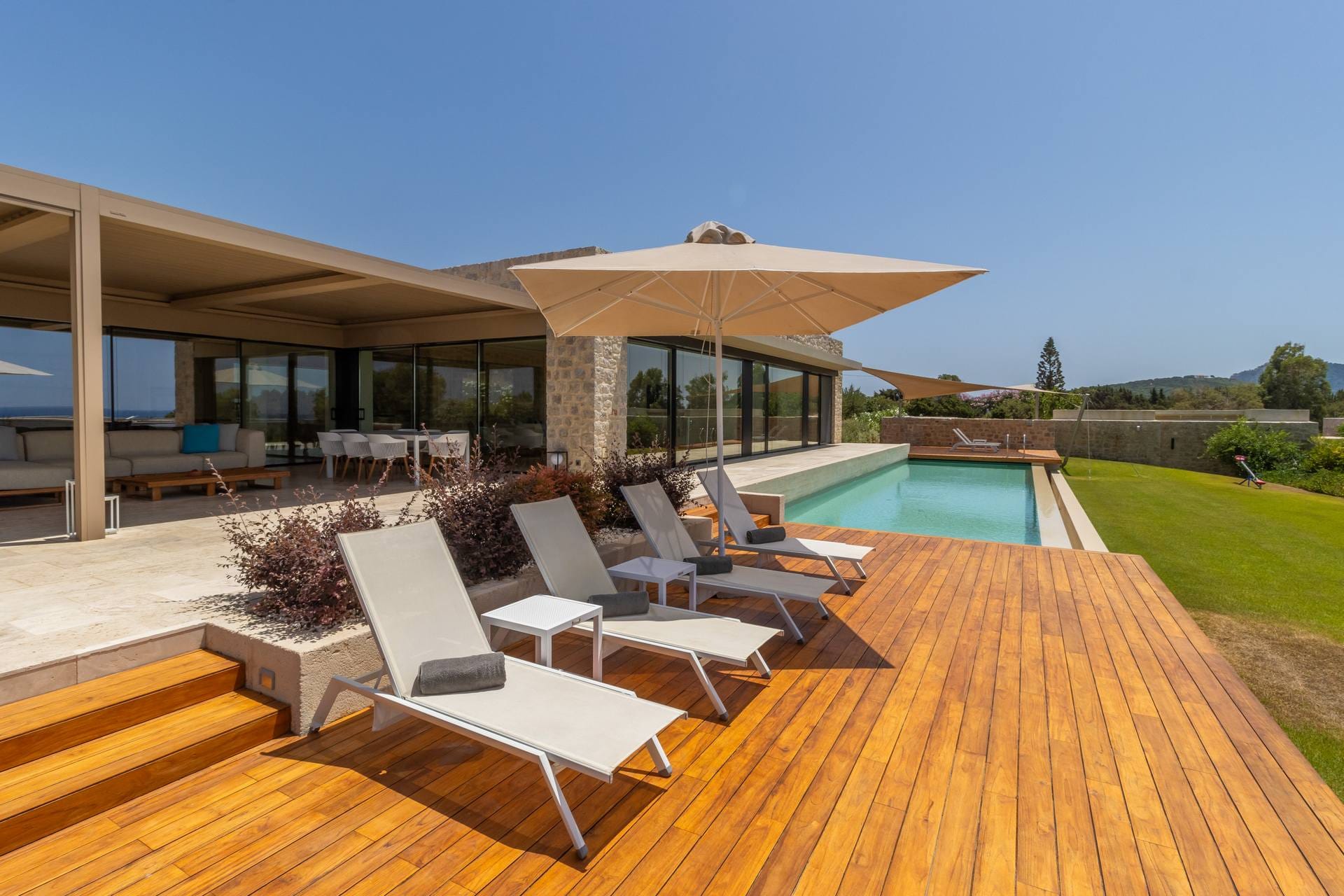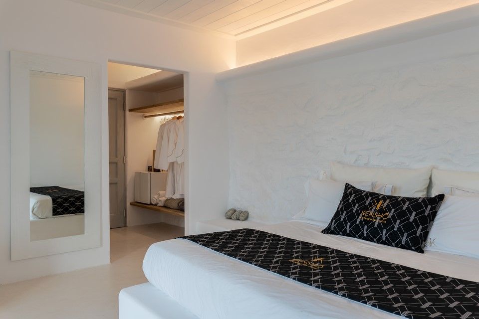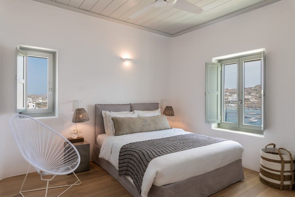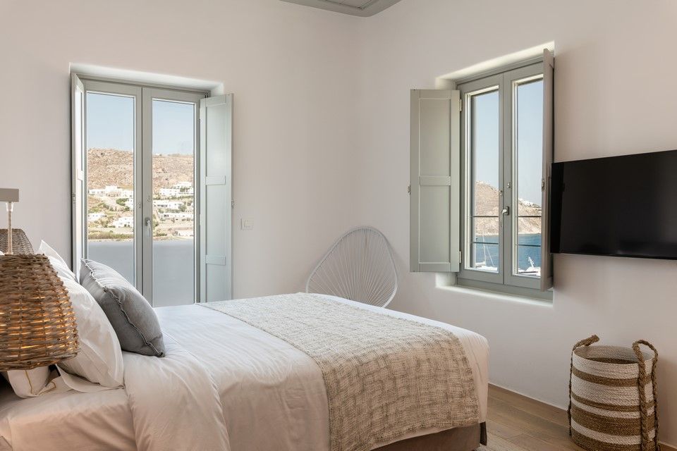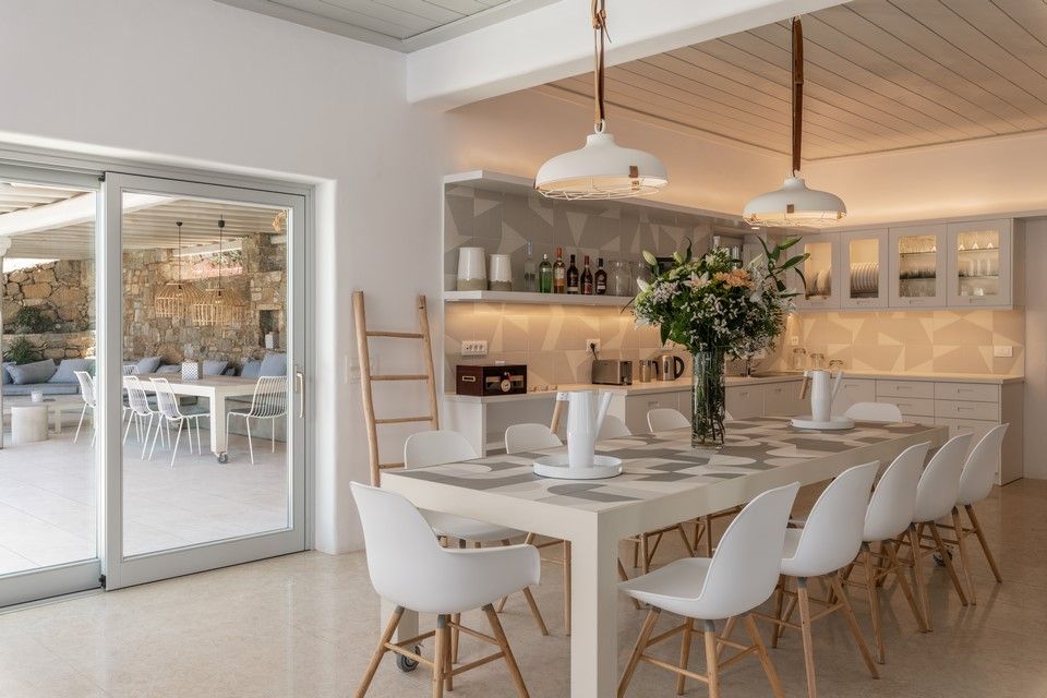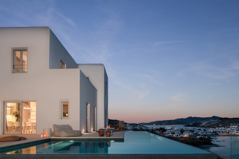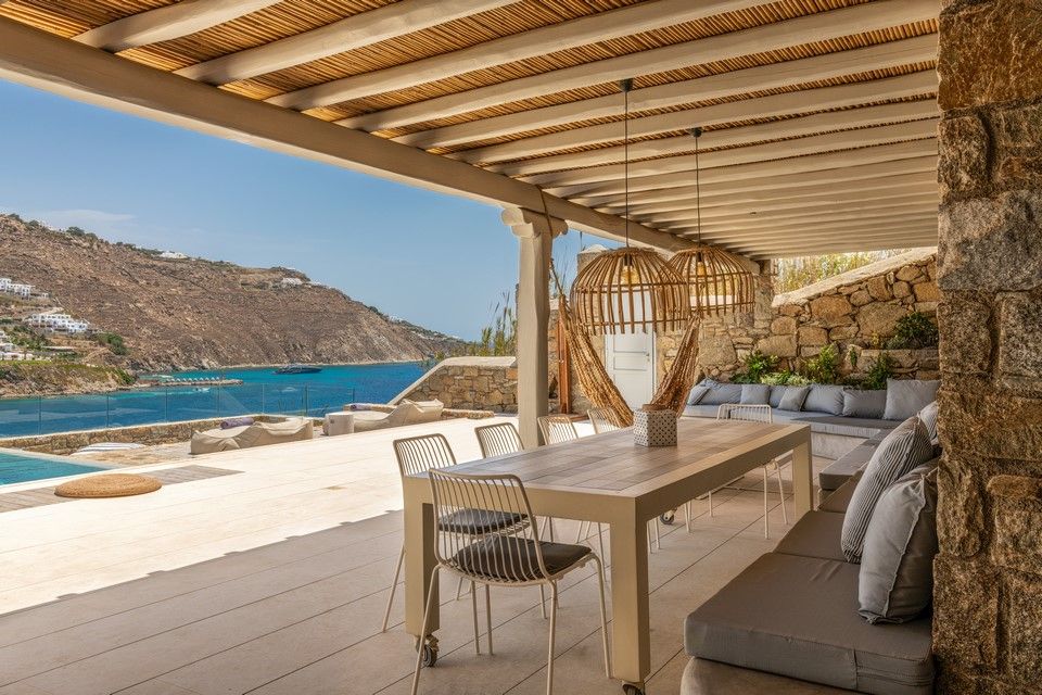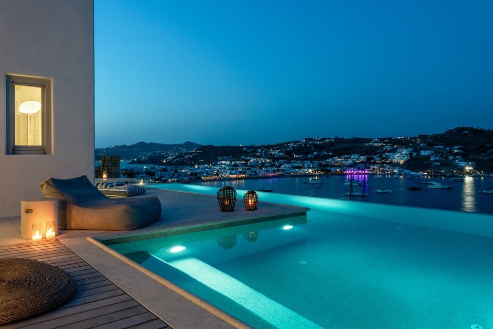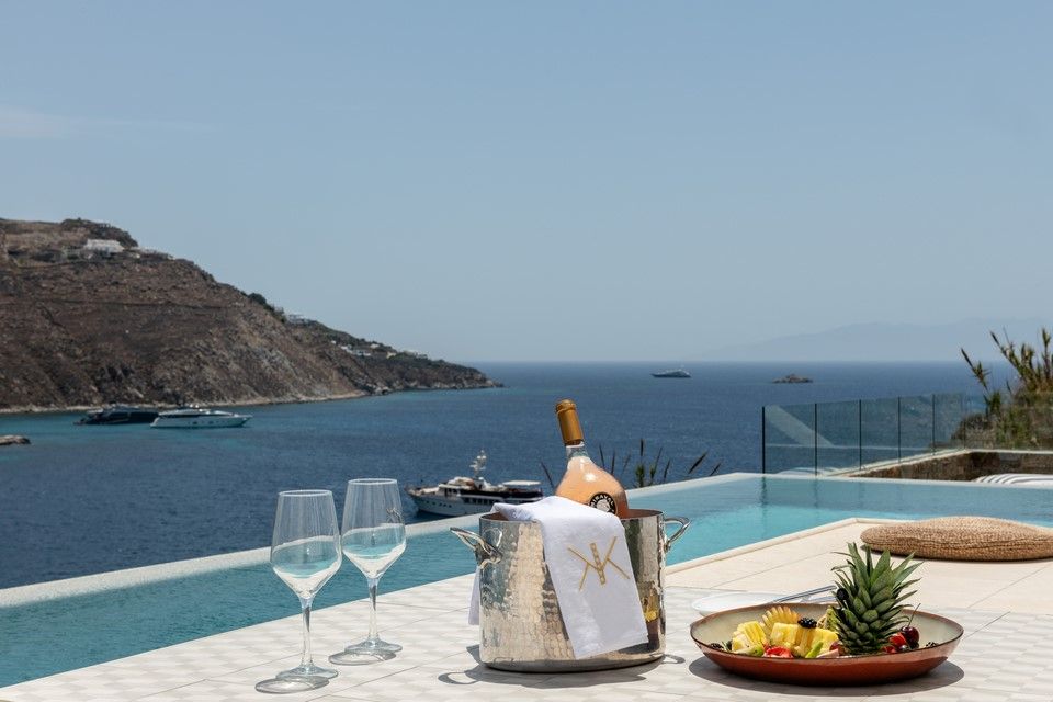 Guests of this property indulge themselves with the services and amenities, still enjoying their privacy in a luxurious setting. This 6-bedroom ensuite plus 1 double ensuite bedroom for staff private villa (260sqm), featuring an outdoors area of 300 sqm with an infinity pool and a sunbathing terrace. The Villa guests can pamper themselves with the panoramic and unobstructed sea views from Ornos bay until the bay of Mykonos town in absolute privacy.