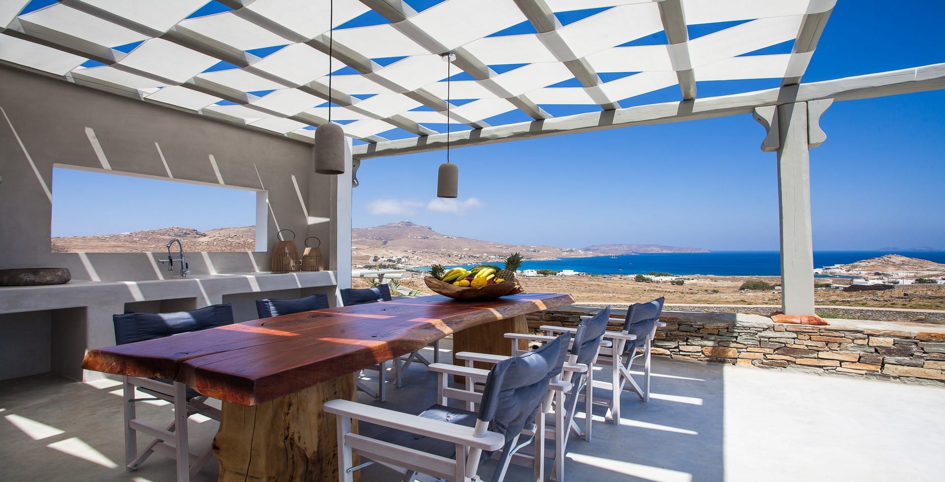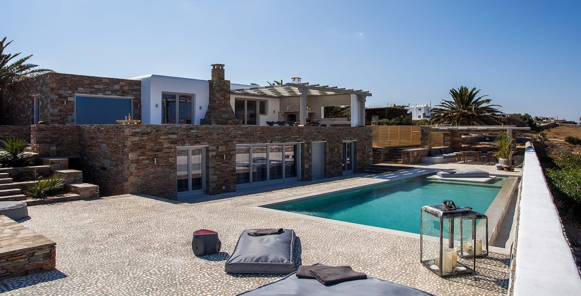 Pioneering a timeless contemporary Cycladic architecture, influenced by traditional Greek tone, the villa has been designed to flow elegantly between indoor and outdoor living. Interior has been eclectically signed, vastly incorporating natural materials like local Myconian stone as well as massive parts of wood; delivering absolute comfort in breath-taking surroundings, making you feel like home, away from home.