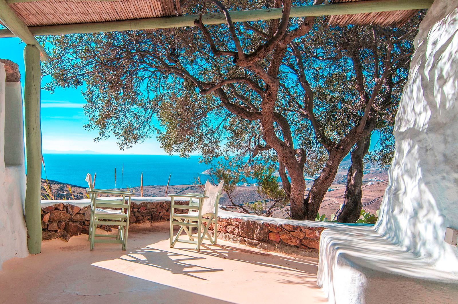 The property is situated on the South East side of the island and it overlooks the beautiful beaches of Lia and Kalafati. It has outstanding views over the islands of Paros, Naxos and the vast Aegean sea. It is totally secluded, surrounded by sky and sea alone. A lovely ravine full of old olive trees, cactuses, and mature flowery gardens passes through the 4 acres of the property, adding to the uniqueness and the beauty of the surroundings.