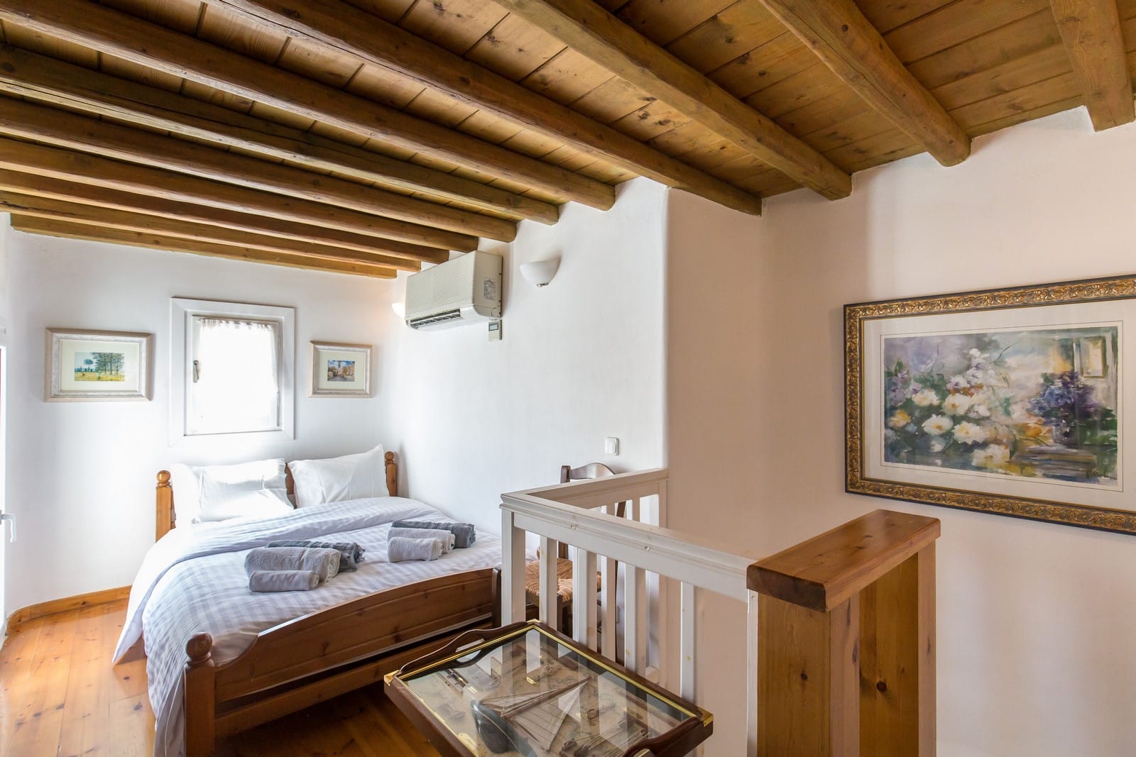 The lower space due to the atilt soil gives you the impression that it is beneath the surface of the soil but in reality, it is the ground floor. There are two bedrooms with double beds, (one with double French built bed), a bathroom and a roomy living room with fire place and built coach, whose French window looks at the big terrace with the unique and vast view of the sea.