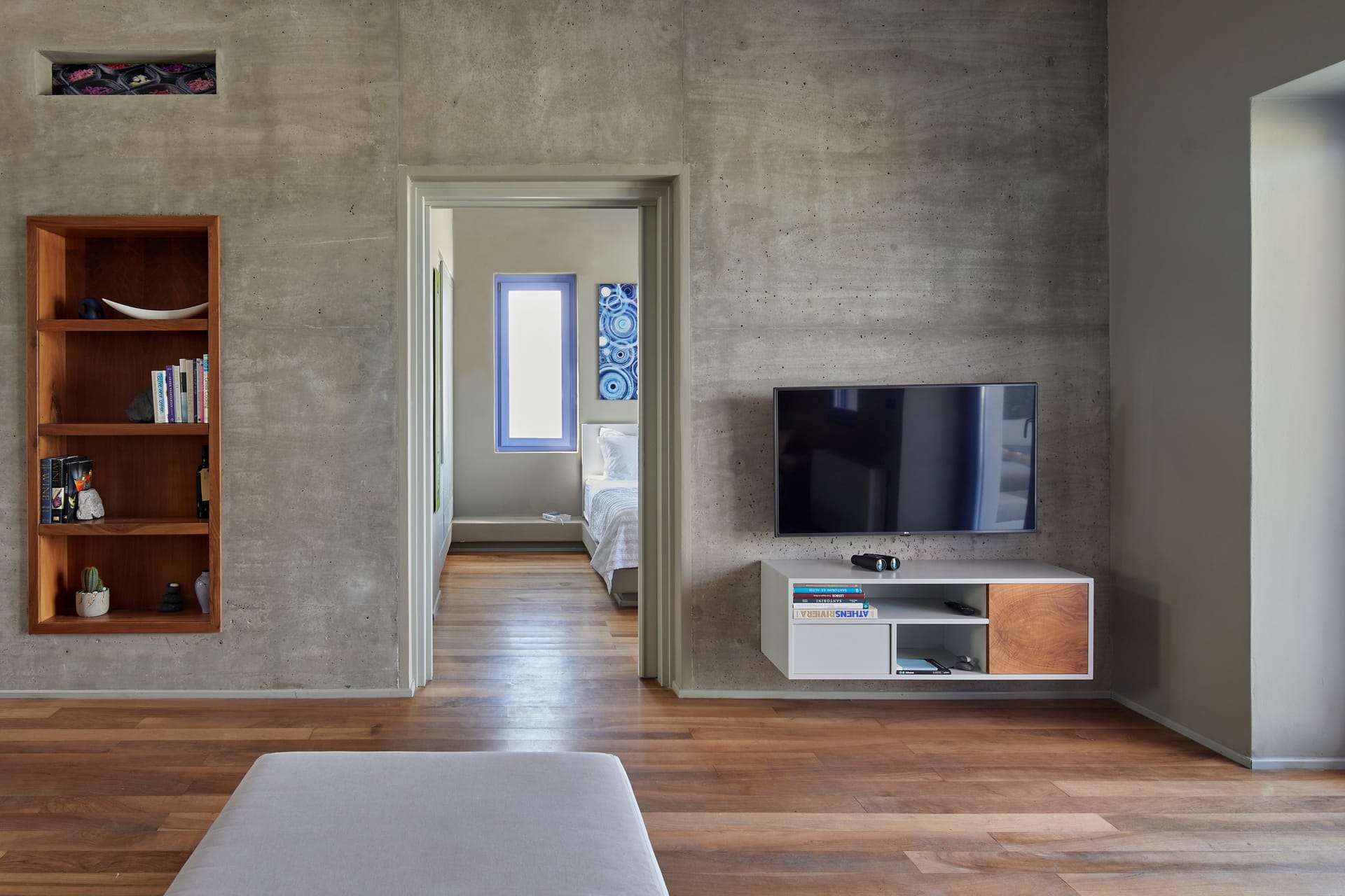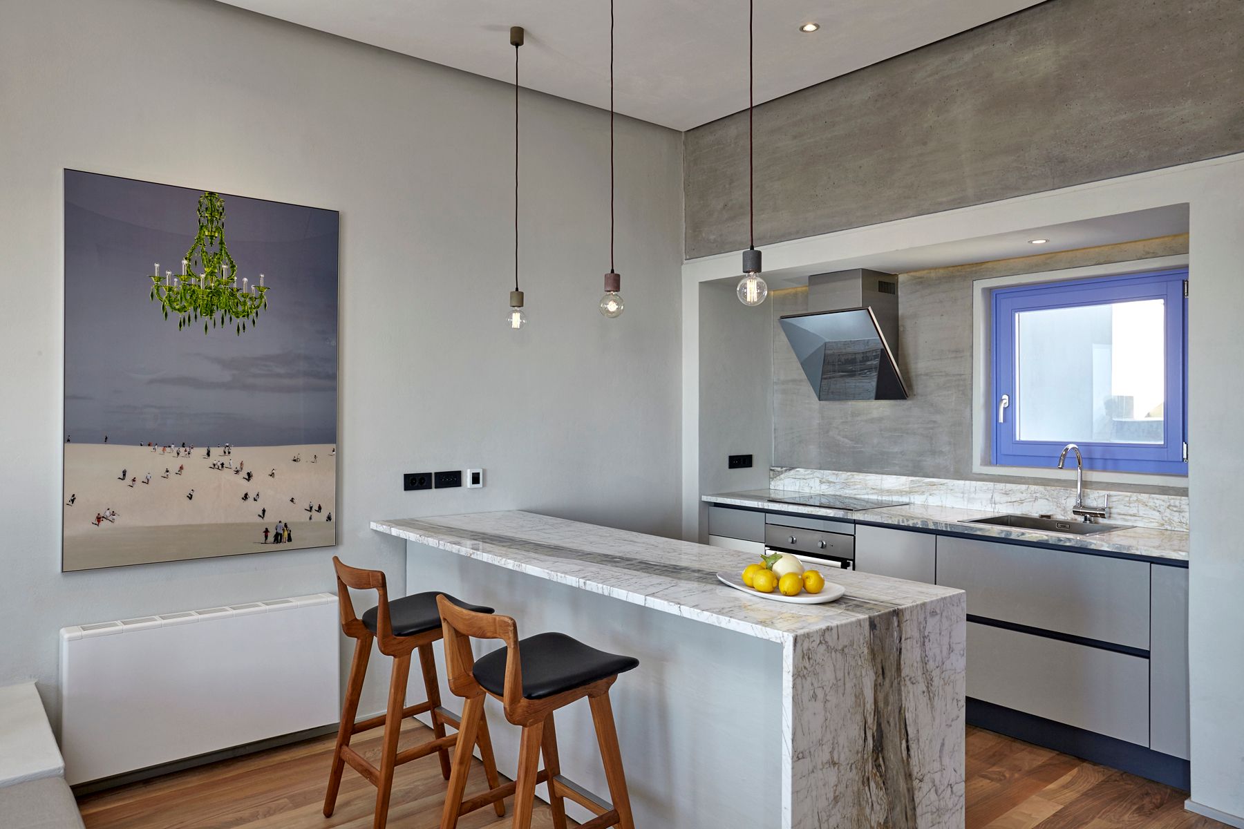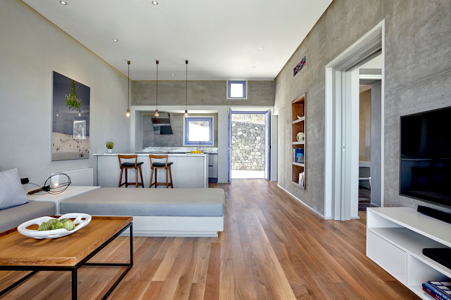 A spacious living room built into two levels with wooden floors at the upper level and perl colour tiles combined with white marble at the rest of the space gives to one the sense that all the colors of the Greek sea and sky are brought inside this room.