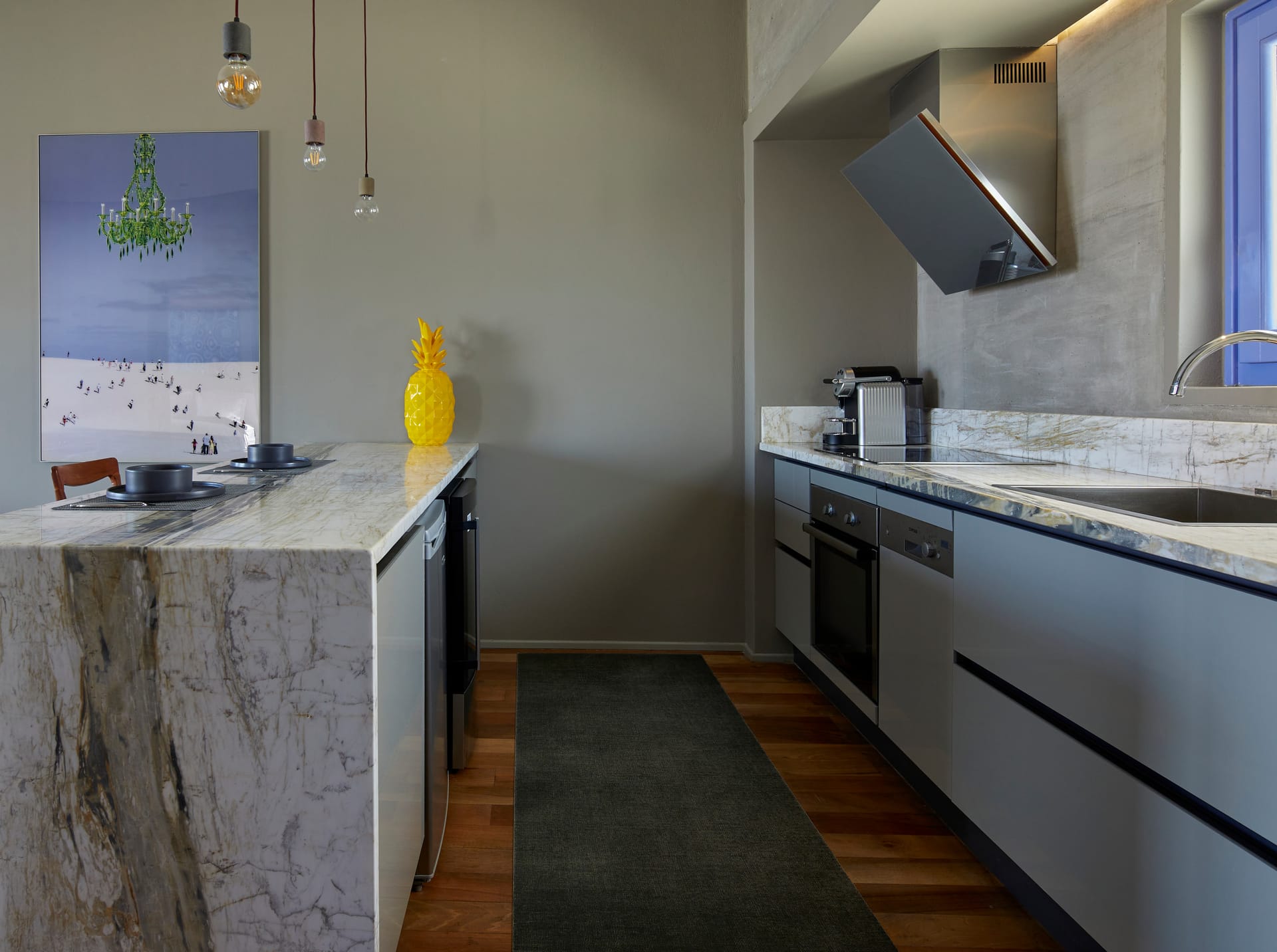 At the ground floor there is a roomy kitchen fully equipped with white cupboards and fixtures and the gorgeous dining room may host up to eight guests.