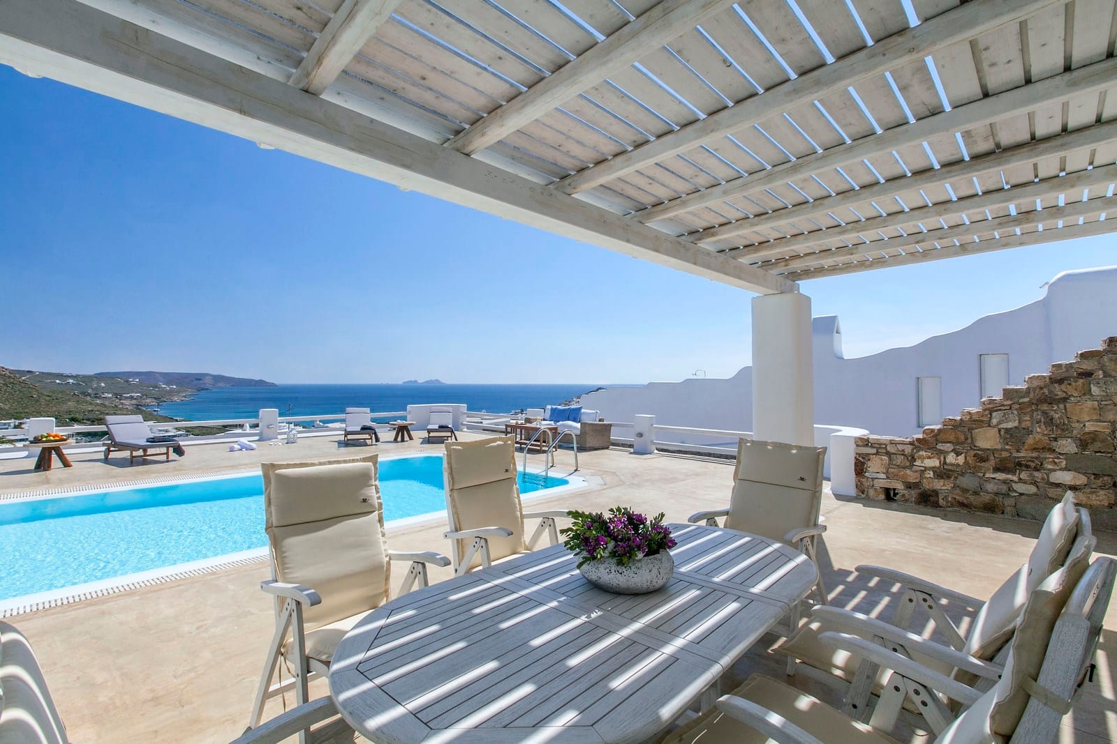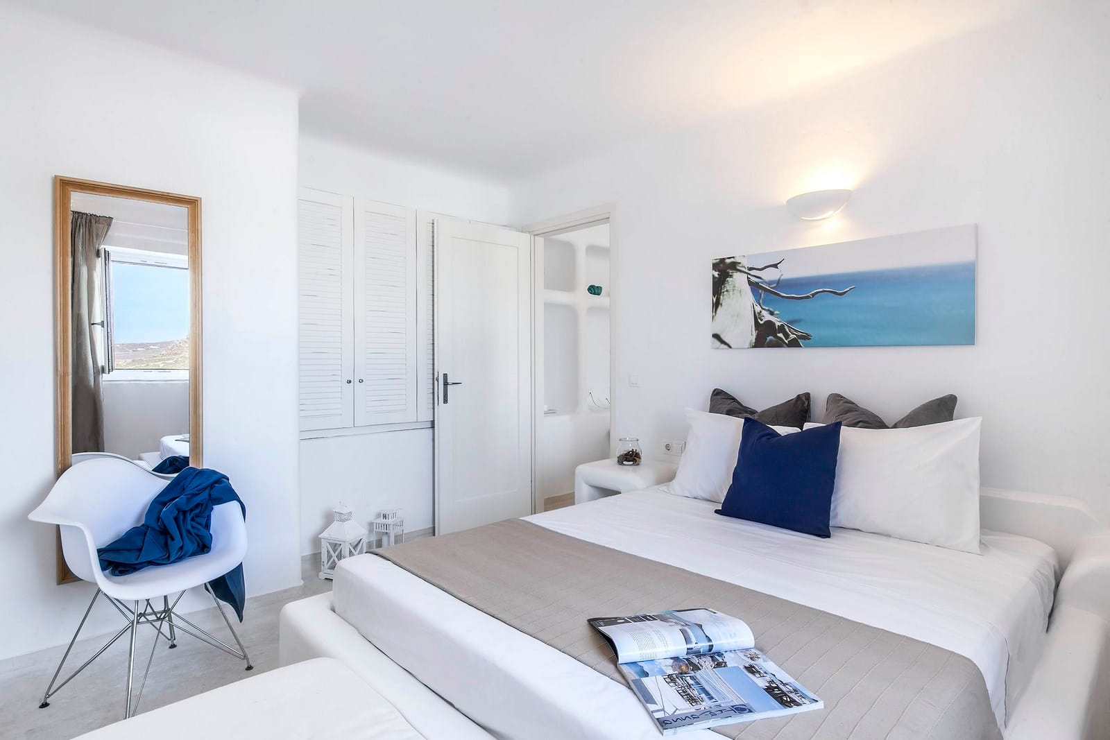 This two-story Cycladic design villa will accommodate 10 guests with option to rent the adjoining villa for up to 10 more guests. Welcome to Maggie II located in Kalafatis Mykonos.