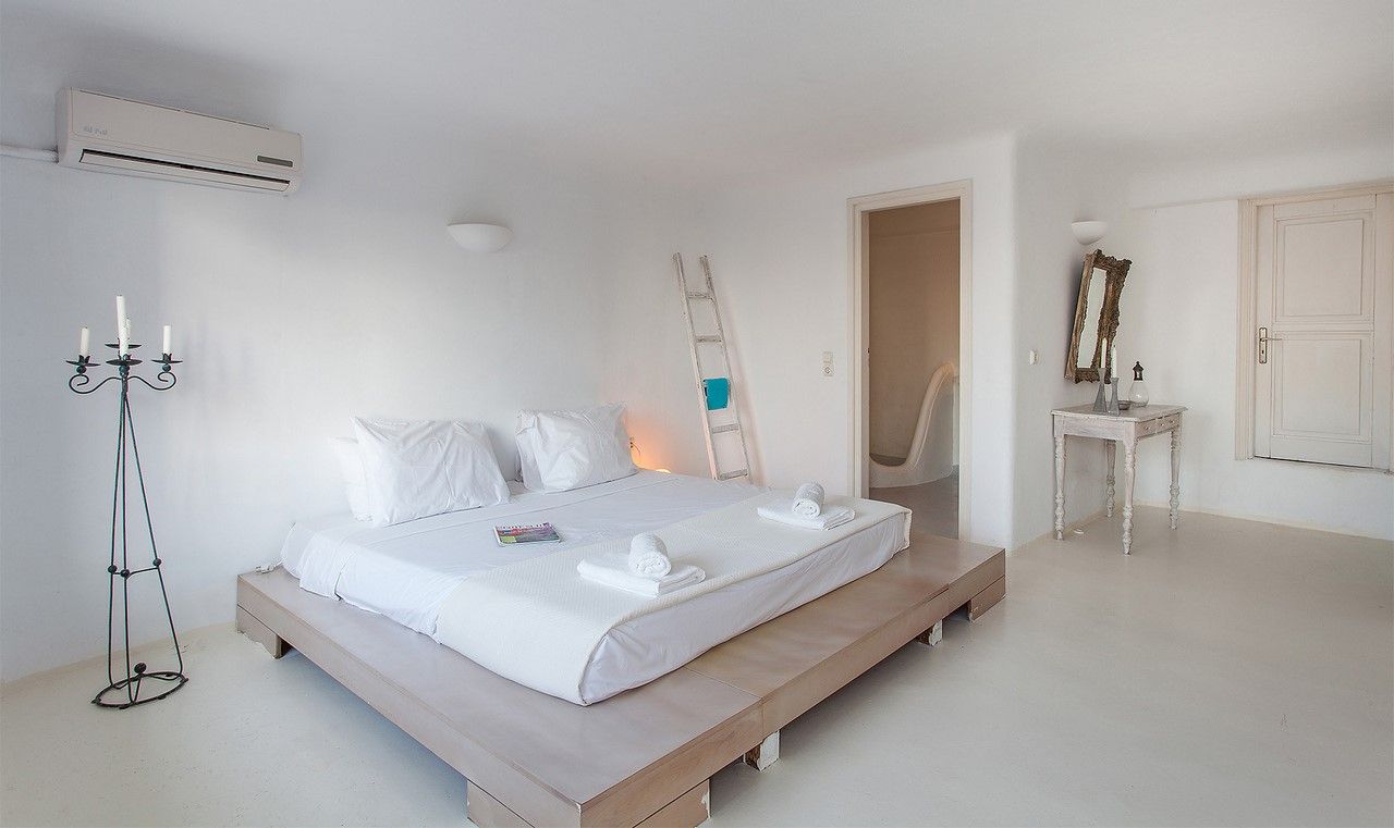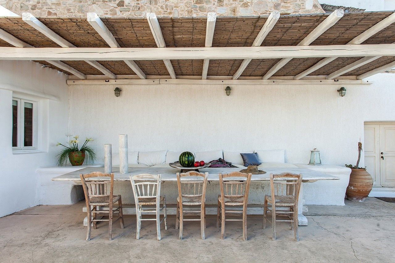 Meeting point in this villa is the vast exterior with its swimming pool and delightful shaded dining and lounge area, all inclusive of a breathtaking view of the Aegean Sea.