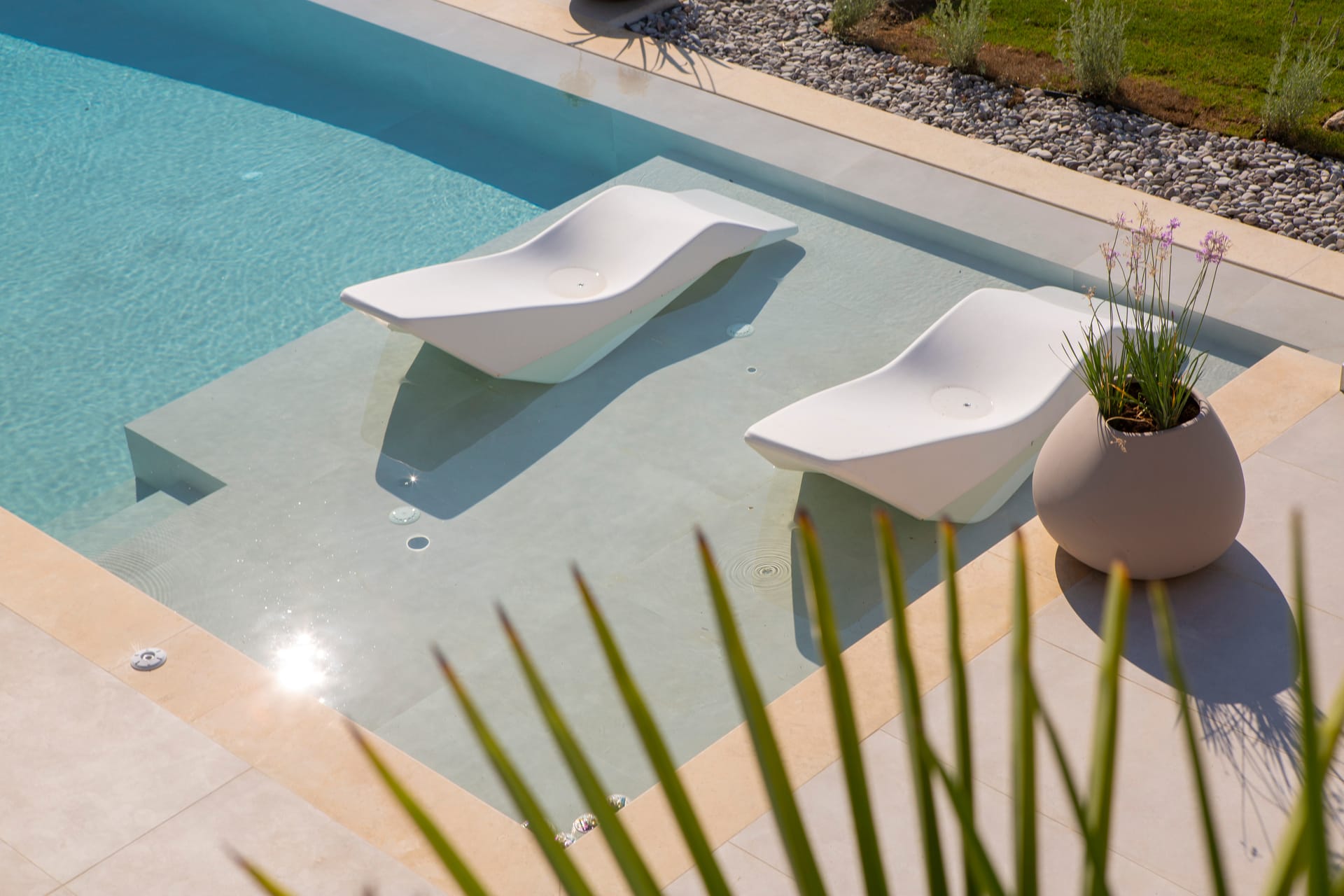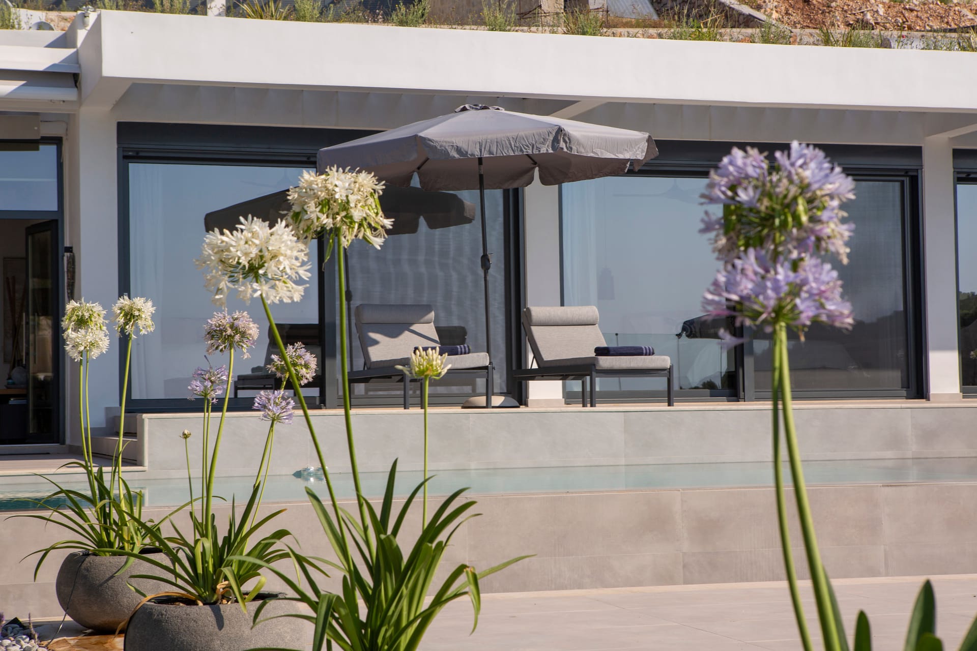 - Swimming pool with umbrellas and deck chairs