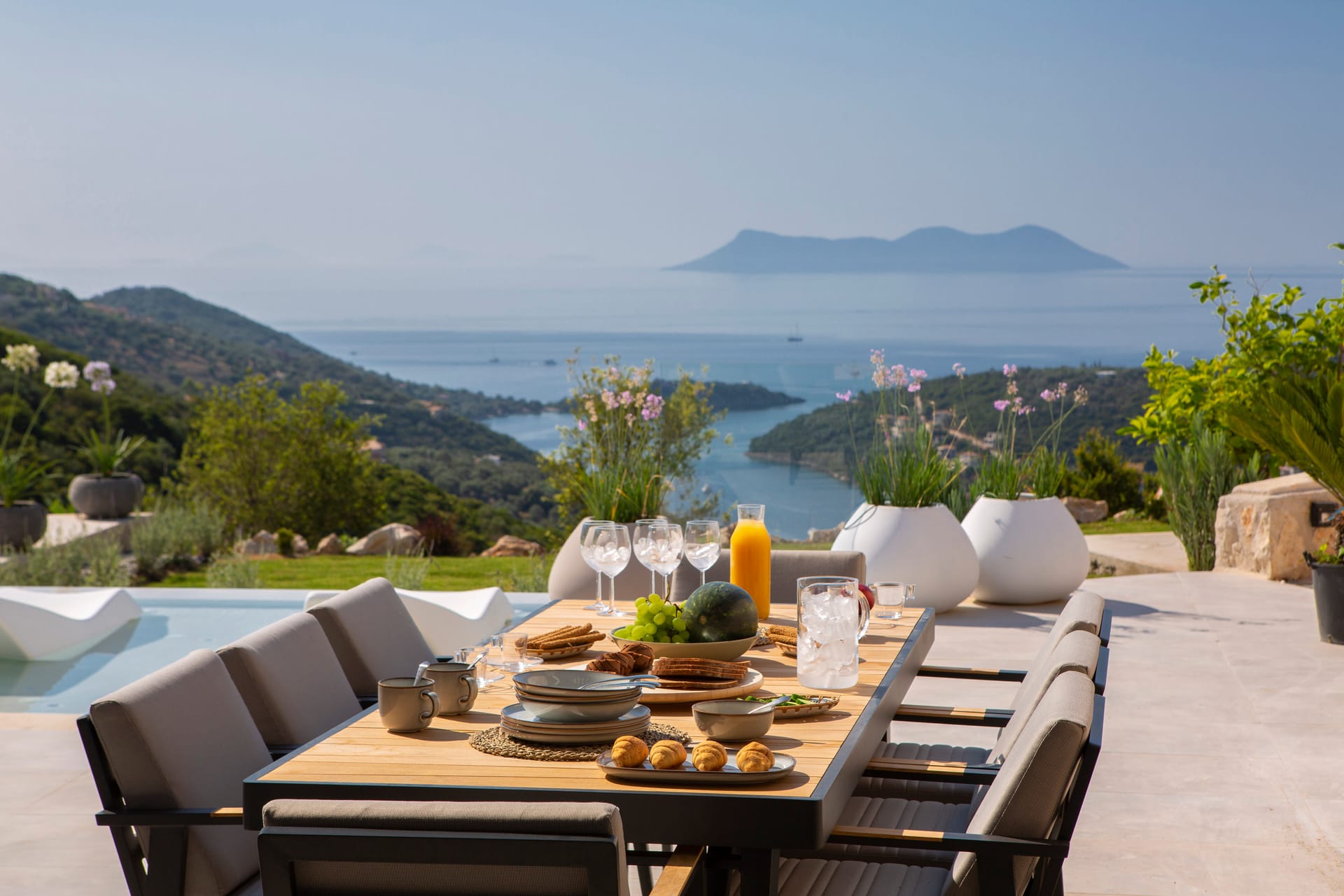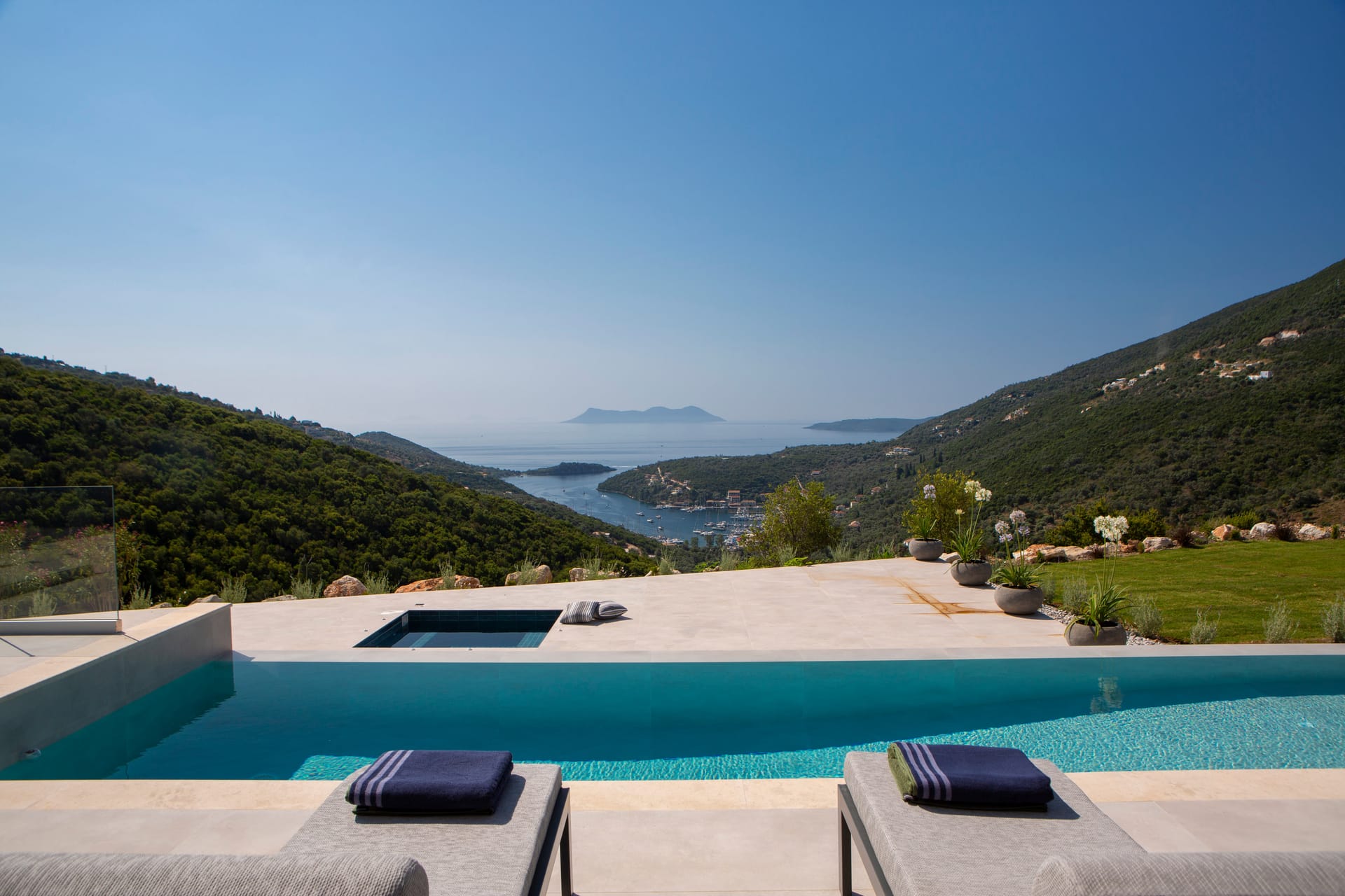 The villa is modernly furnished and has a large swimming pool. There are 4 bedrooms in total, 3 in the first floor and one in the ground floor with its own entrance by the pool. All bedrooms have en-suite bathrooms, digital HDTV, silent refrigerators with glass doors (mini-bars), high quality safes both well hidden inside the closets and air-conditioning. The villa has wi-fi internet support. There are plenty of open spaces and verandas with pergolas and at the pool side there are umbrellas and deck-chairs. The villa has also 2 parking spaces.