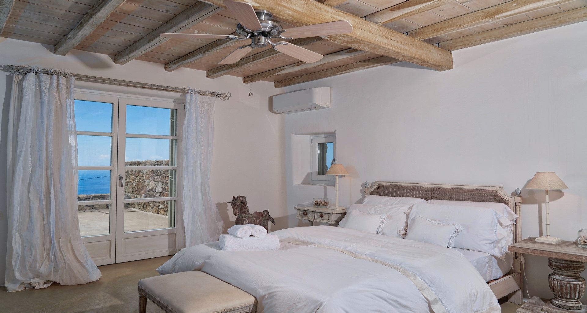 - Bedroom with double bed, A/C, ceiling fan, balcony door.