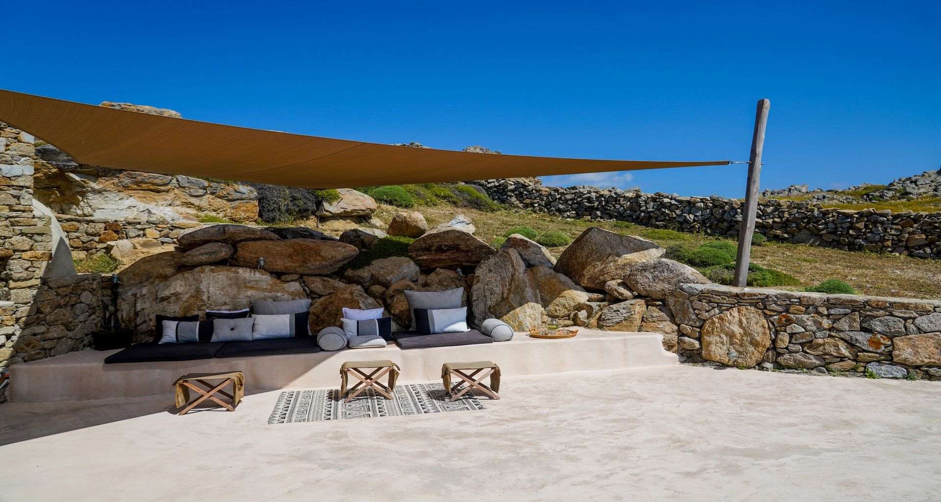 The villa is on the North-West side of Mykonos and consists of a main house, 3 independent guest houses, several outdoor sitting areas, dining area, a spa pool (non-heated) and an outdoor Jacuzzi (Not Heated). Guests enjoy moments of relaxation at the outdoor areas with comfortable sofas, floor pillows, dining table etc.