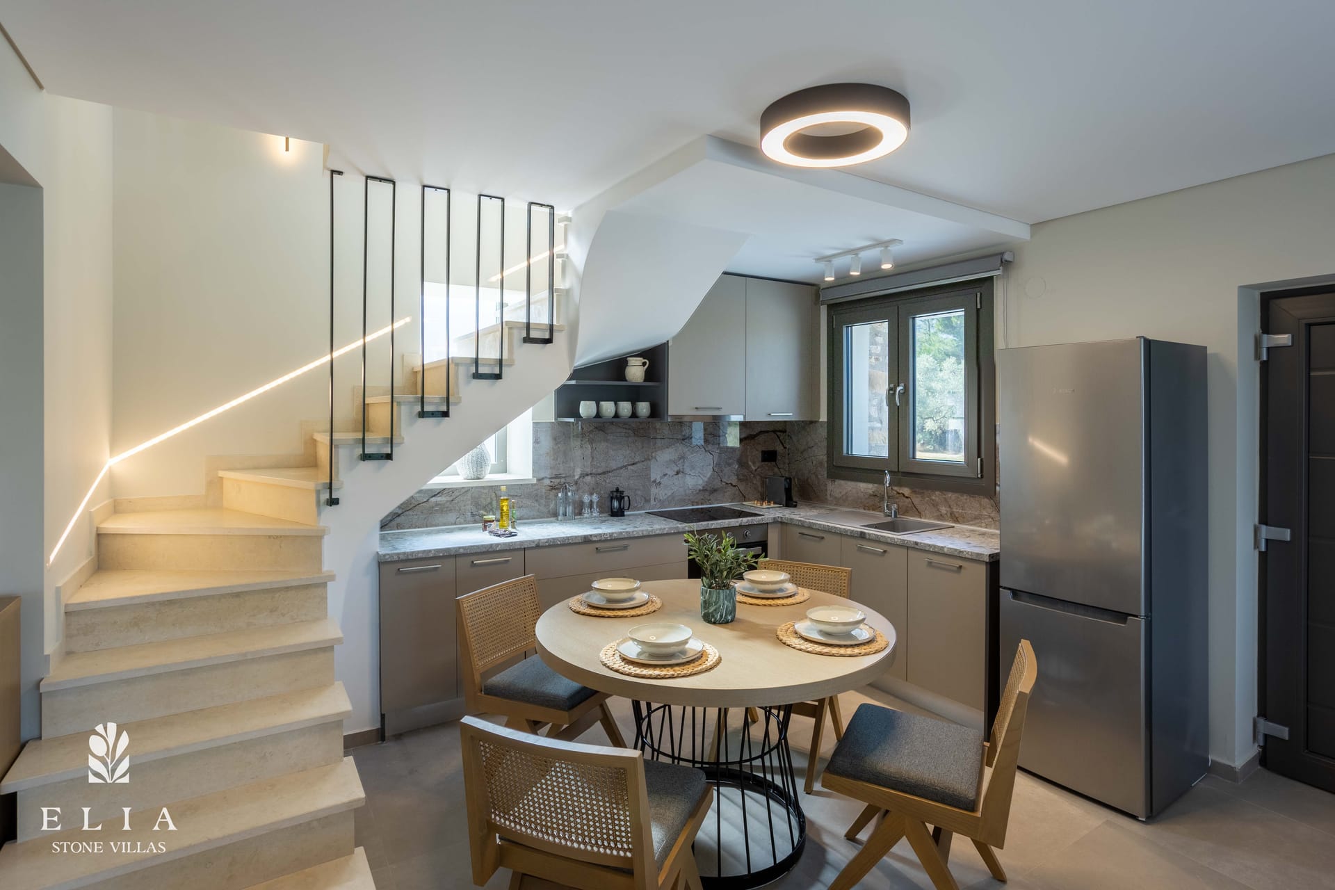 The impressive entrance opens into the spacious open plan living/dining area which opens out onto the pool terrace. The beautifully furnished living area boasts a comfortable sofa matched with a stylish armchair making their own statement within the lounge, offering a flat-screen TV on a low cabinet and minimal décor. An adjacent dining area features modern dining table and chairs which sits alongside the open kitchen space. The kitchen is fitted with stylish high-gloss units and is well stocked with all necessary utensils and top-quality equipment, including electric oven and hob, integrated dishwasher and microwave.