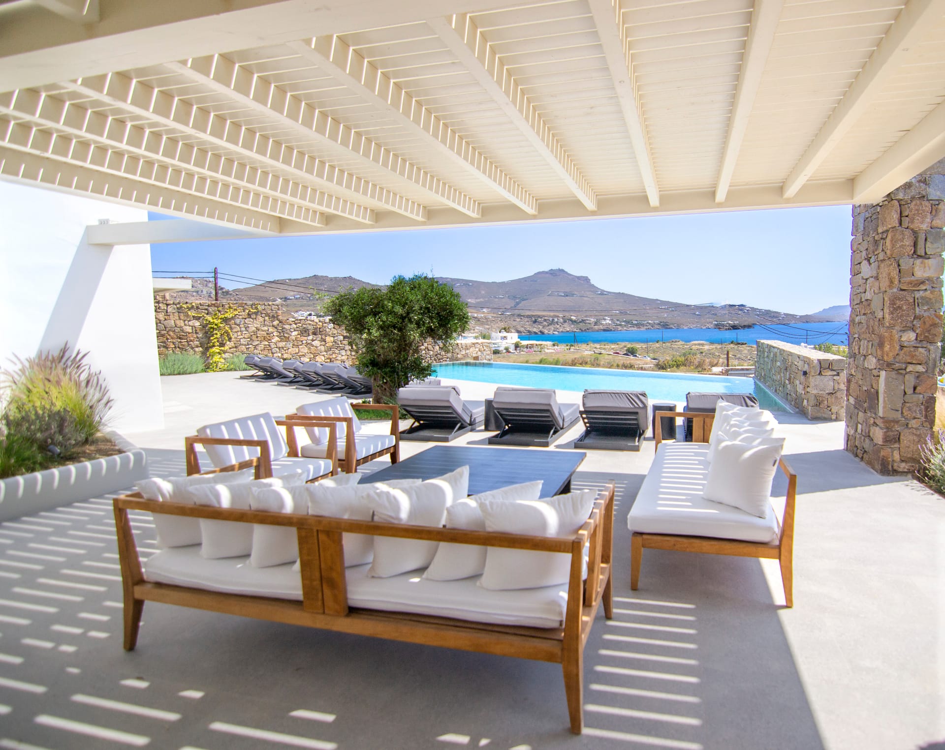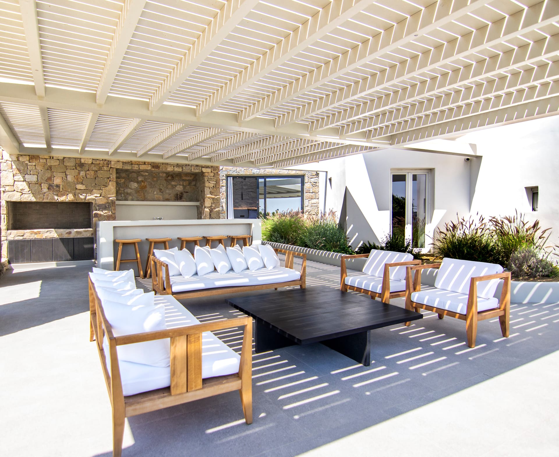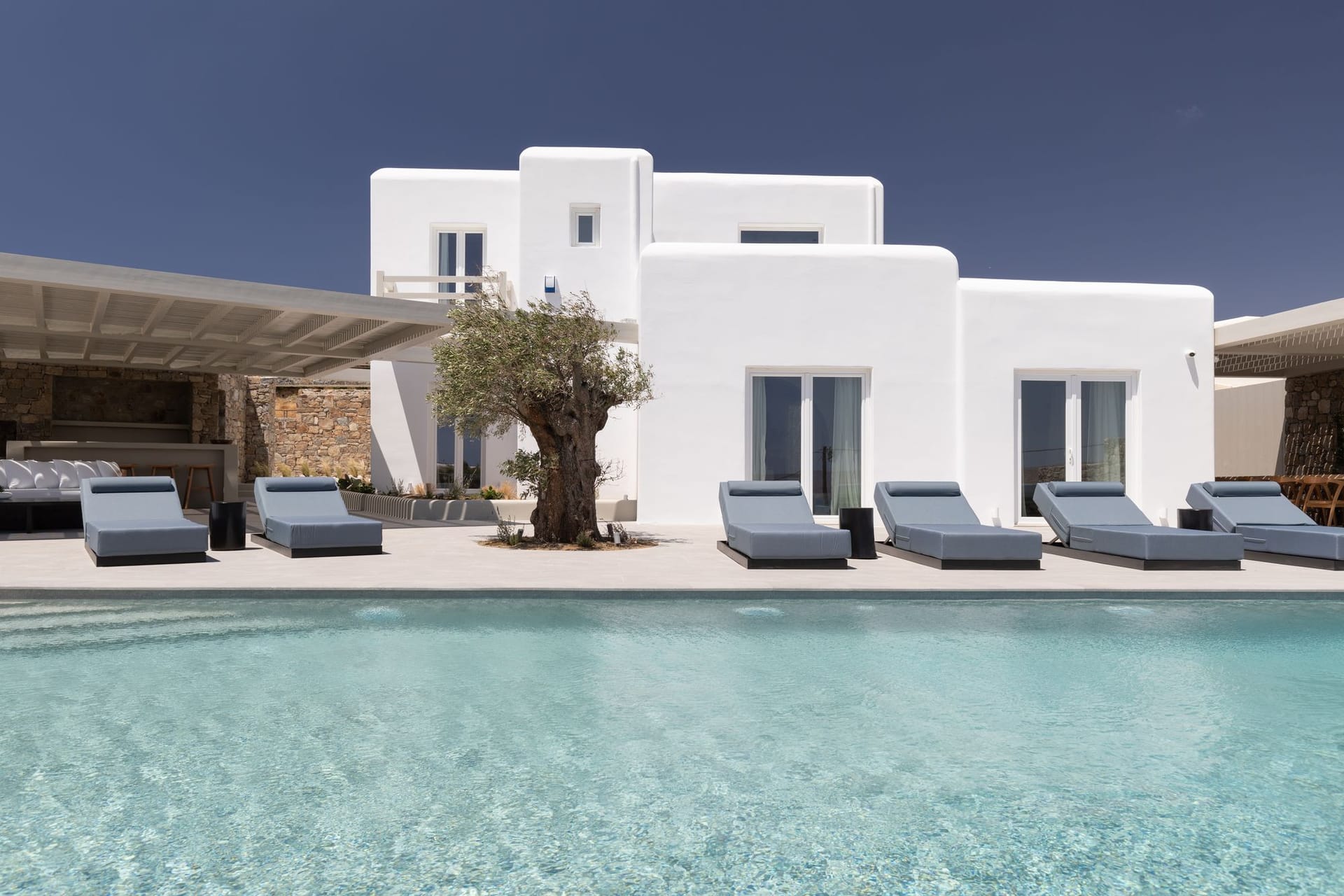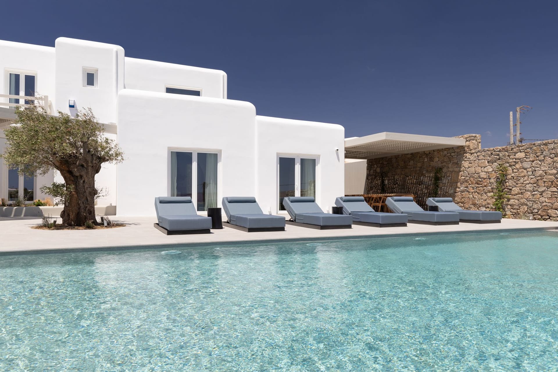 The villa is a harmonious combination of style and substance, offering seven beautifully luxury decorated bedrooms, making it a haven for up to 14 people. Each space is meticulously designed, with an unwavering commitment to detail. The architectural masterpiece is a testament to Greek and local design sensibility, combining minimalist aesthetics with traditional elements, such as the iconic whitewashed walls, wooden accents and the incorporation of natural local stone. This project pays tribute to the island's rich heritage and culture, providing an immersive experience for every visitor.