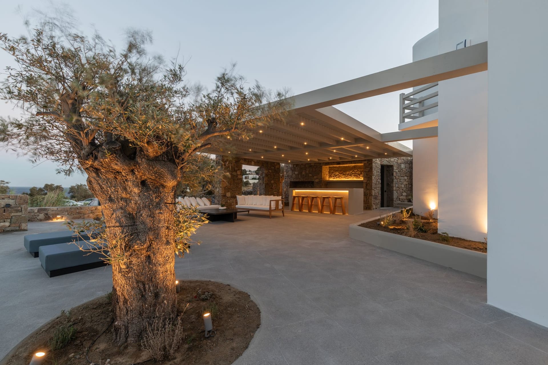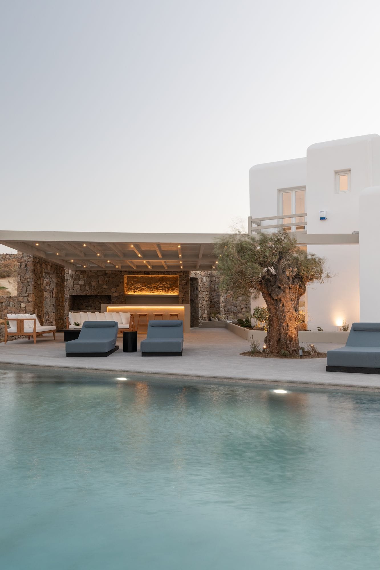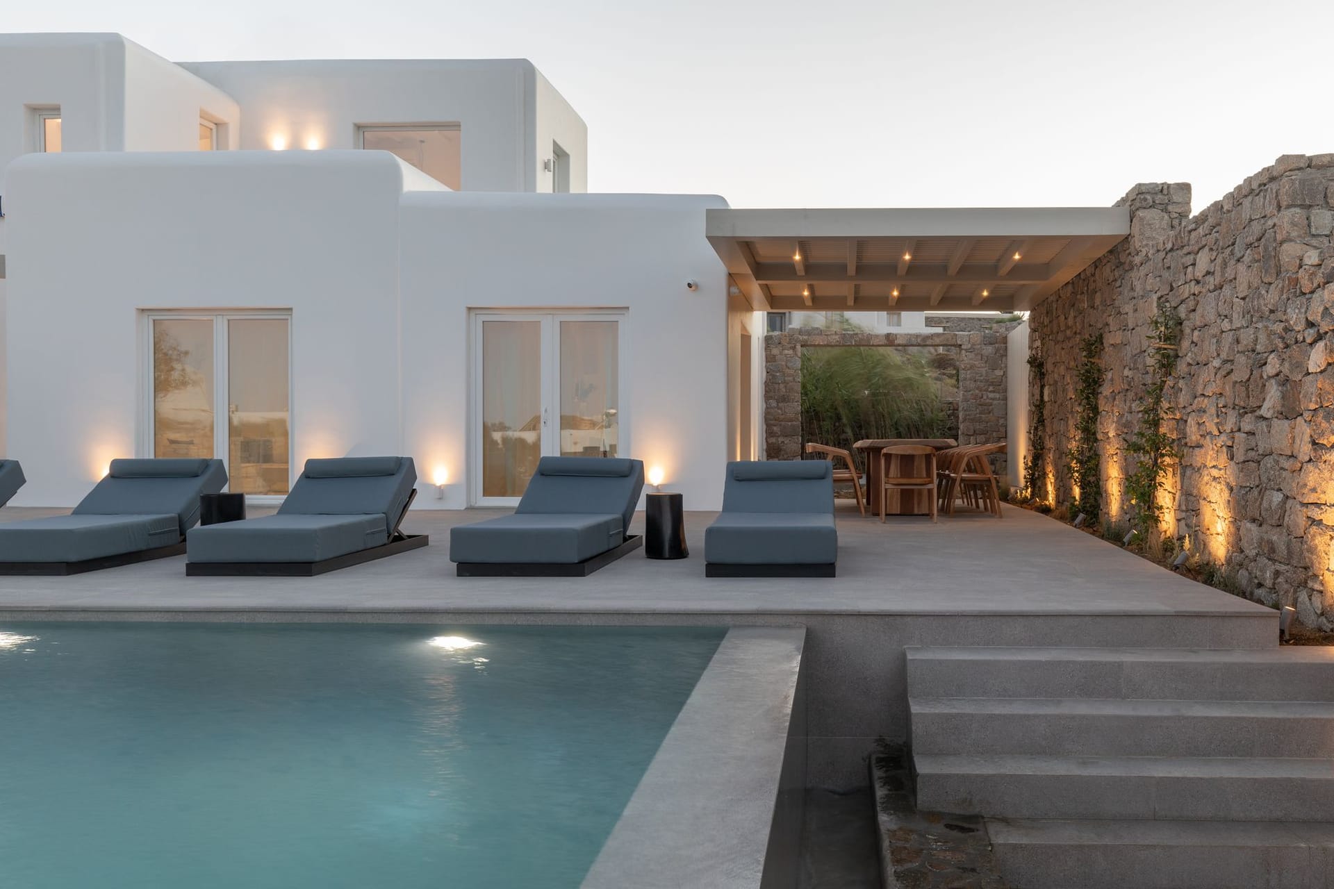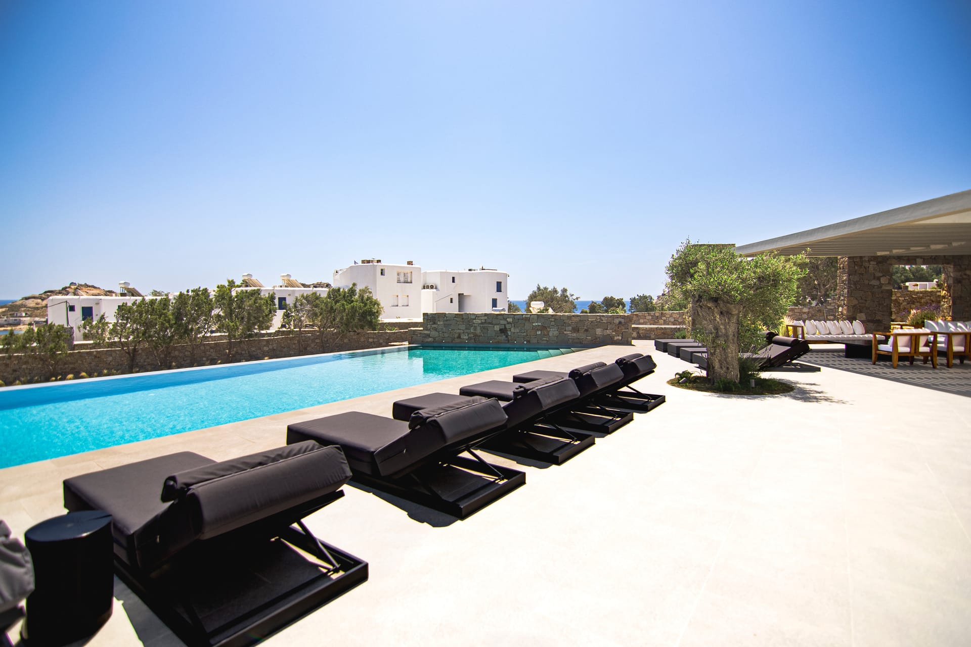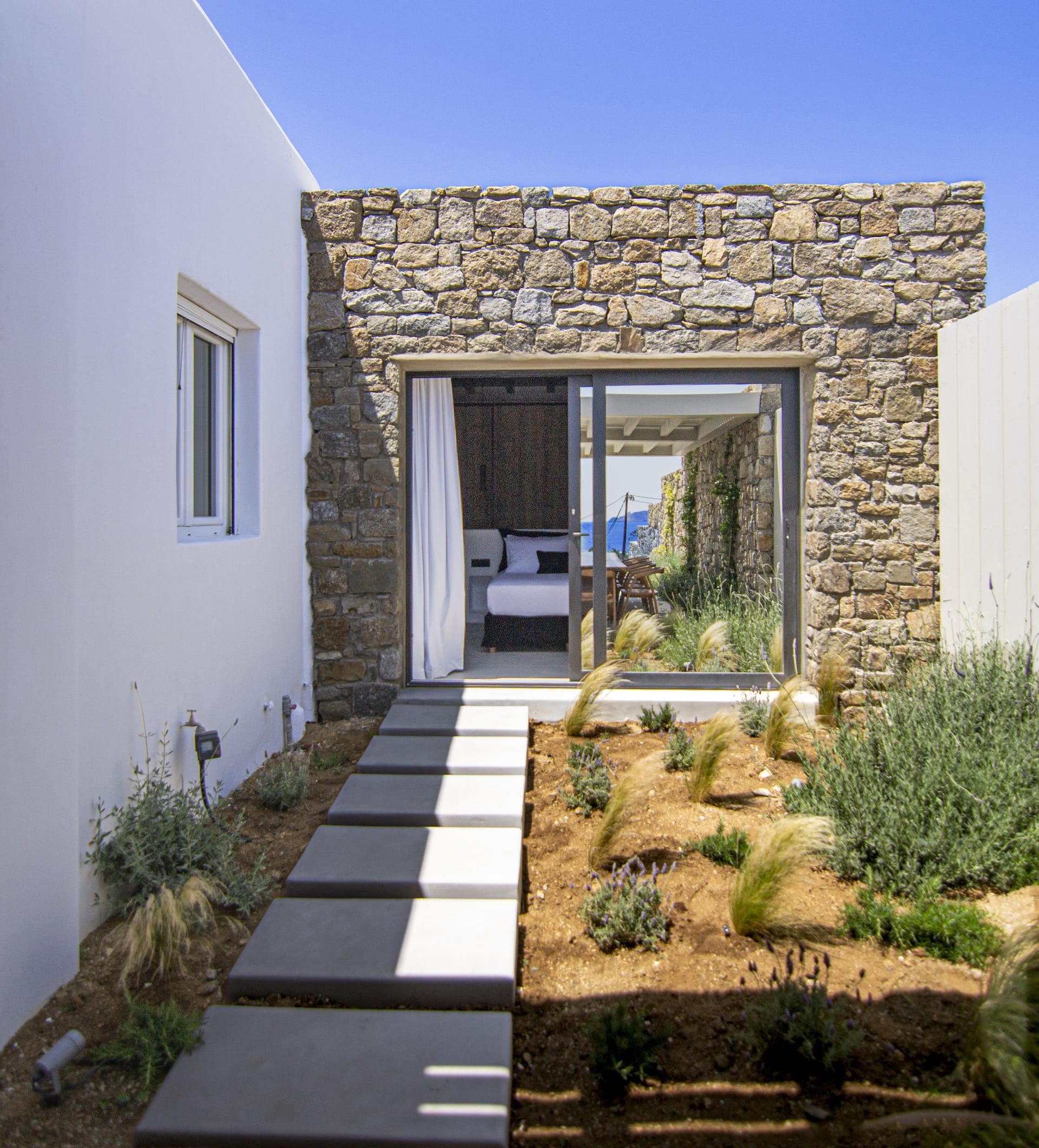 The villa is a harmonious combination of style and substance, offering seven beautifully luxury decorated bedrooms, making it a haven for up to 14 people. Each space is meticulously designed, with an unwavering commitment to detail. The architectural masterpiece is a testament to Greek and local design sensibility, combining minimalist aesthetics with traditional elements, such as the iconic whitewashed walls, wooden accents and the incorporation of natural local stone. This project pays tribute to the island's rich heritage and culture, providing an immersive experience for every visitor.