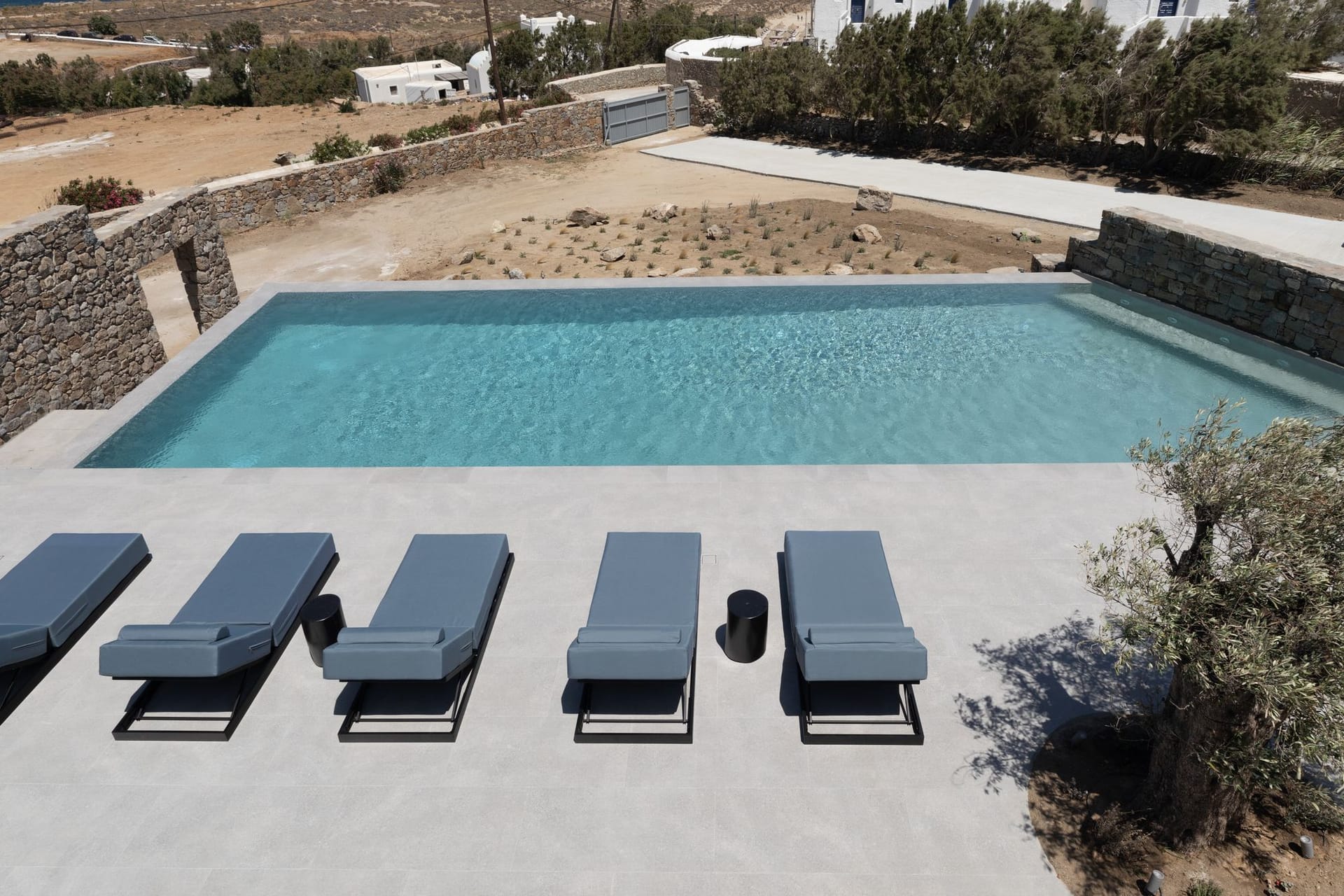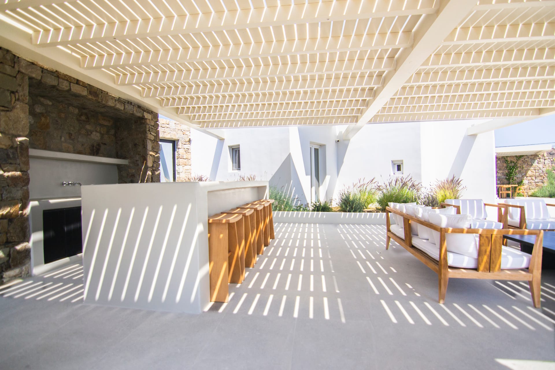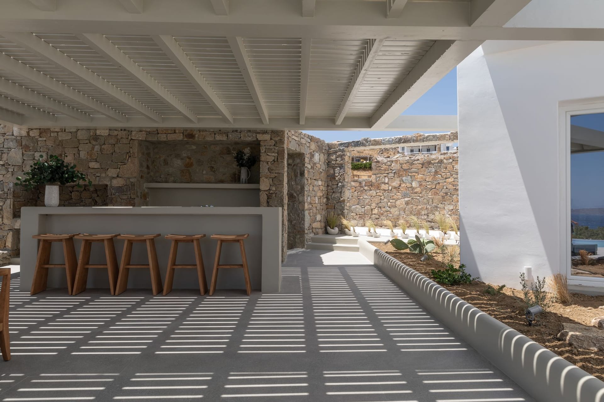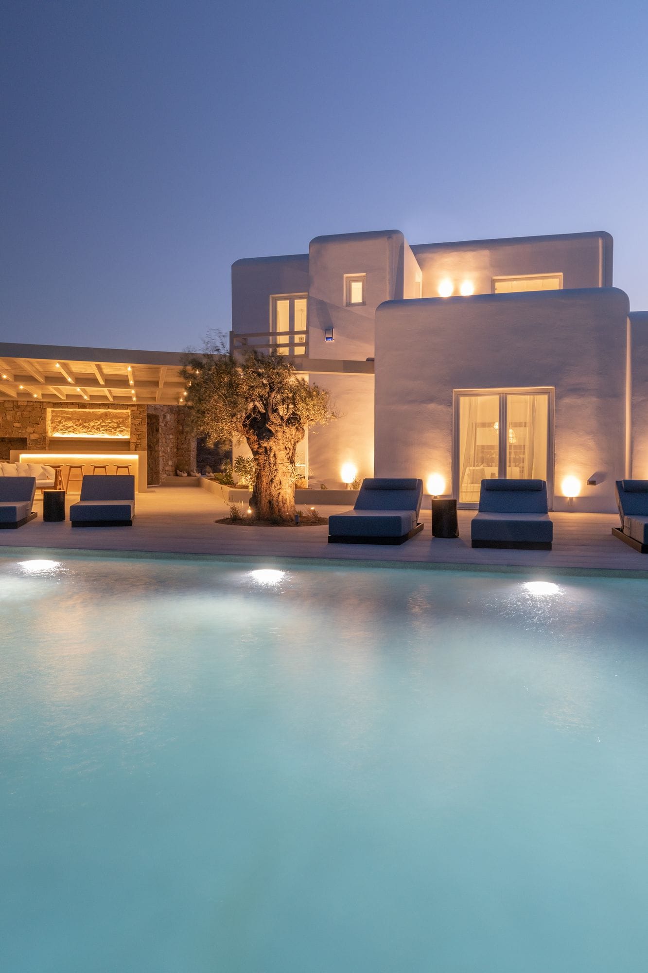 The villa is a harmonious combination of style and substance, offering seven beautifully luxury decorated bedrooms, making it a haven for up to 14 people. Each space is meticulously designed, with an unwavering commitment to detail. The architectural masterpiece is a testament to Greek and local design sensibility, combining minimalist aesthetics with traditional elements, such as the iconic whitewashed walls, wooden accents and the incorporation of natural local stone. This project pays tribute to the island's rich heritage and culture, providing an immersive experience for every visitor.