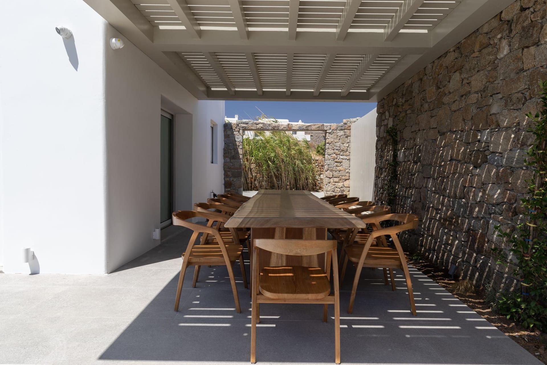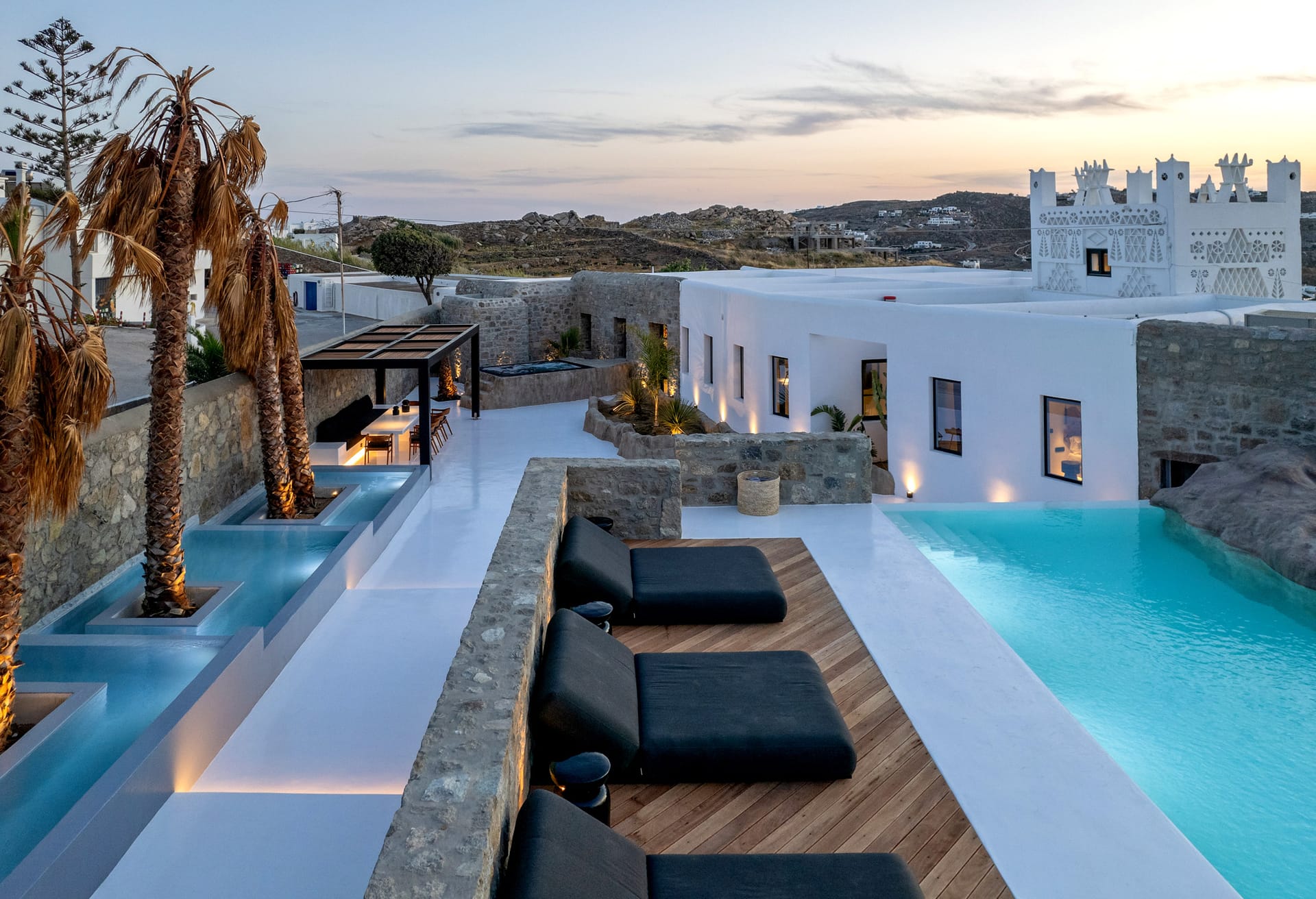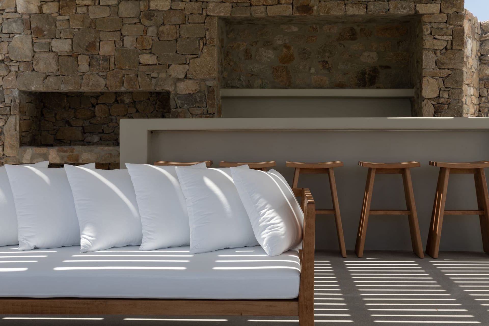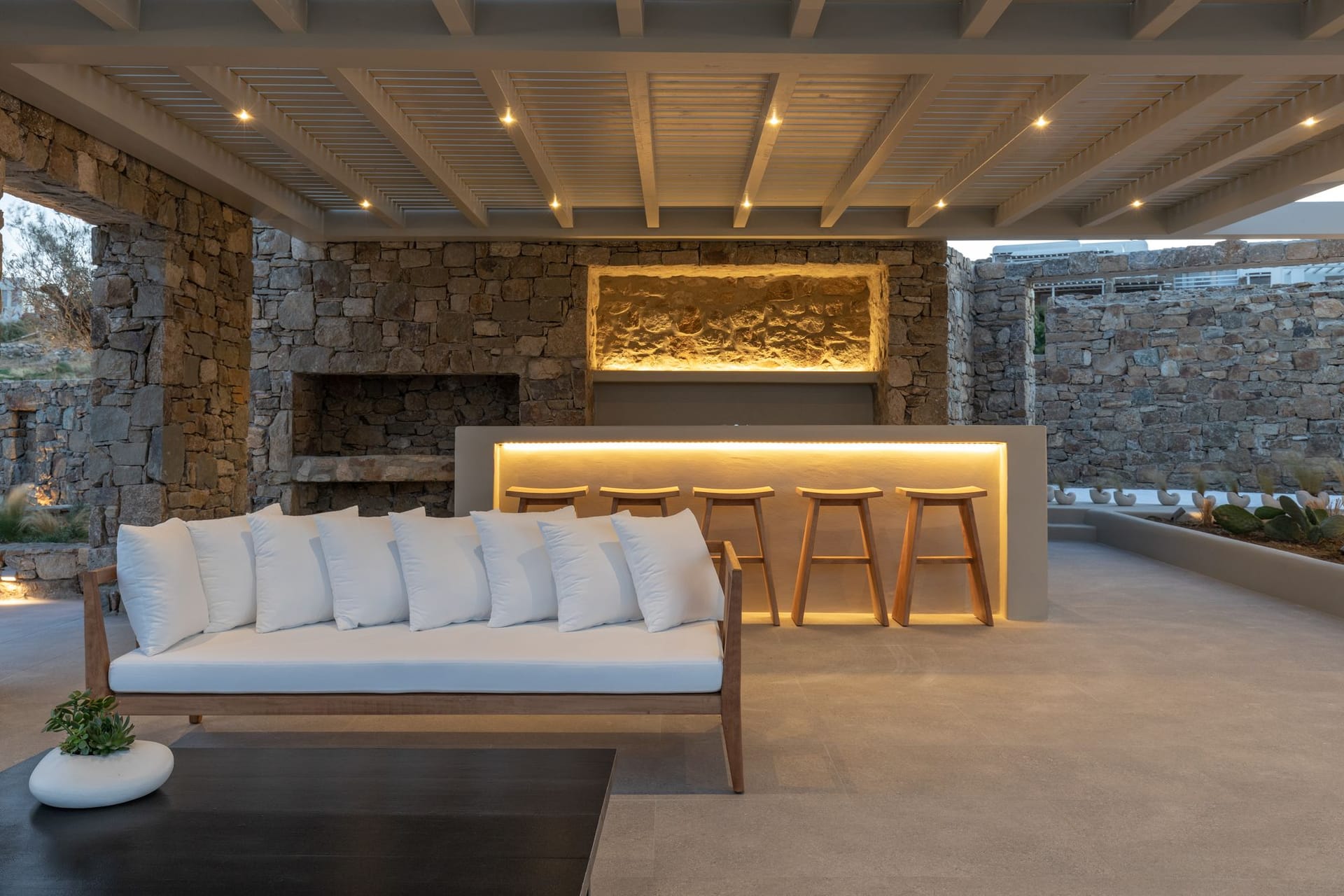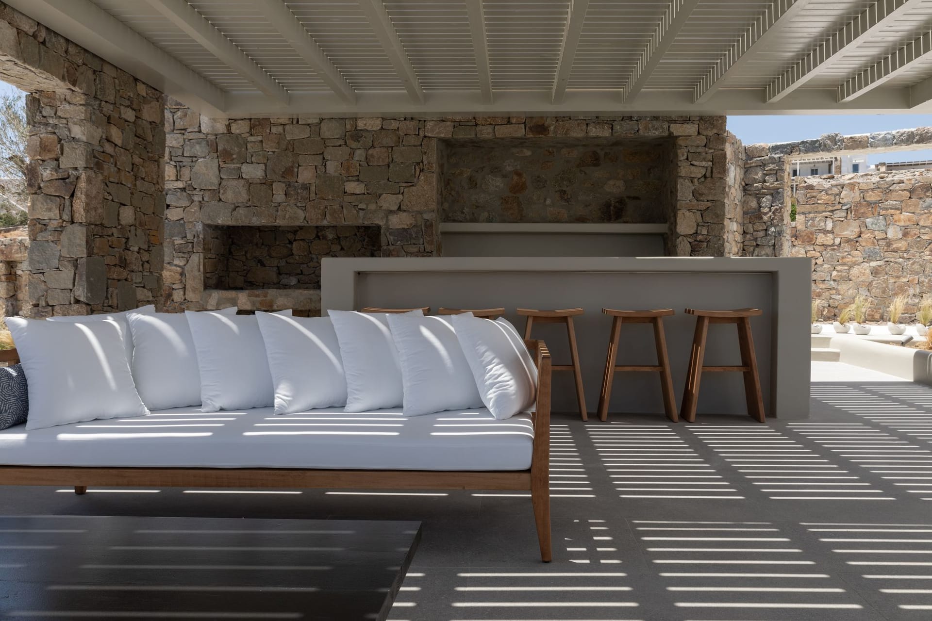 The villa is a harmonious combination of style and substance, offering seven beautifully luxury decorated bedrooms, making it a haven for up to 14 people. Each space is meticulously designed, with an unwavering commitment to detail. The architectural masterpiece is a testament to Greek and local design sensibility, combining minimalist aesthetics with traditional elements, such as the iconic whitewashed walls, wooden accents and the incorporation of natural local stone. This project pays tribute to the island's rich heritage and culture, providing an immersive experience for every visitor.