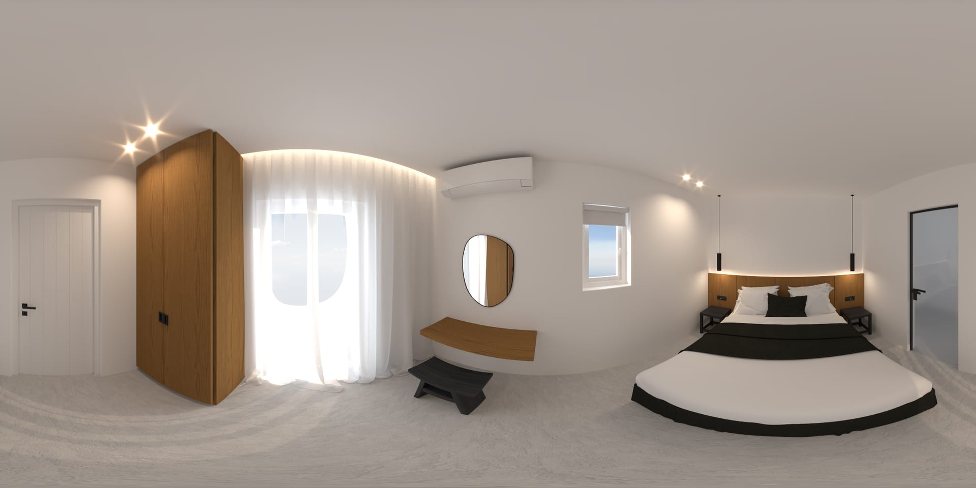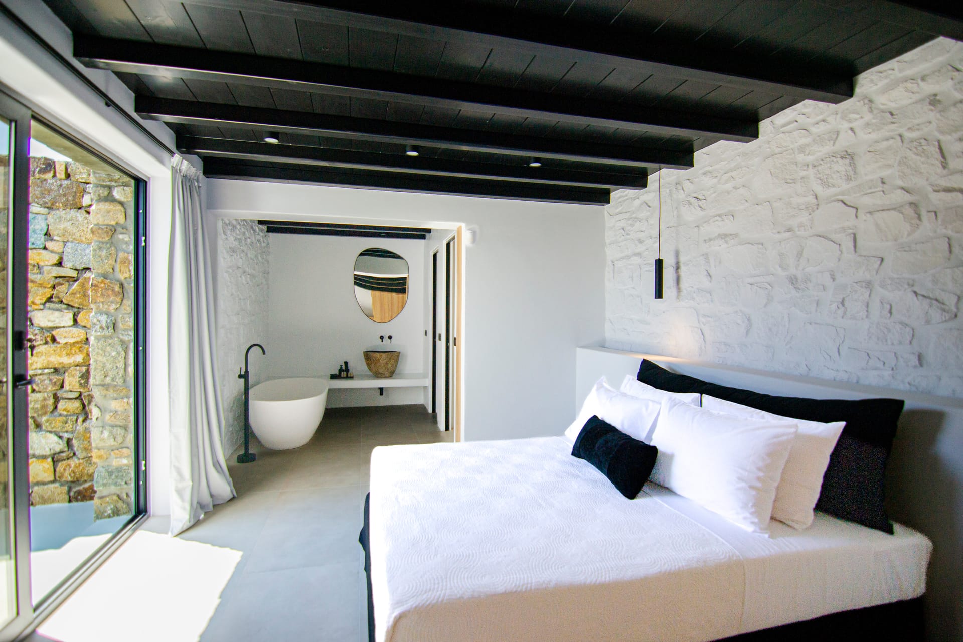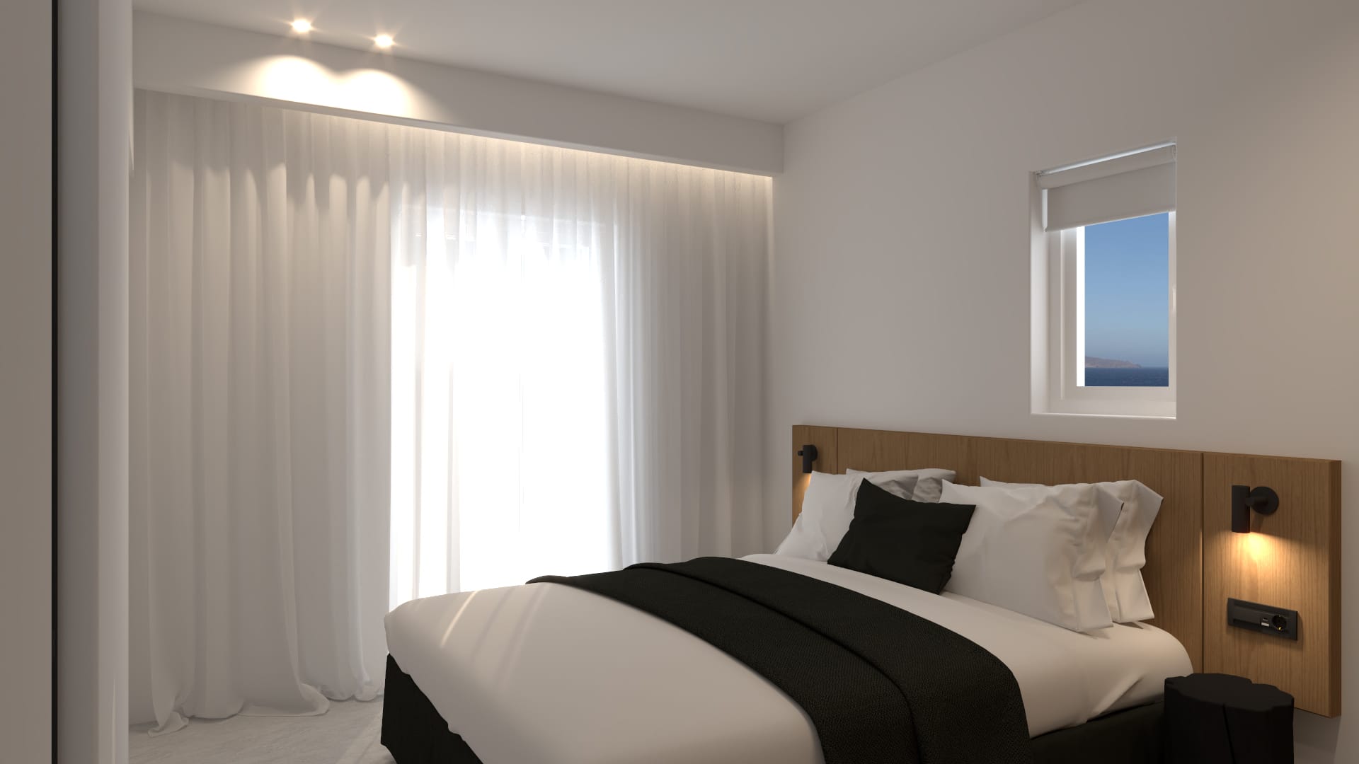 Suite 7: bedroom with queen-size bed, en-suite bathroom with walk-in rain shower, closets, ergonomic desk, direct access to a private balcony, panoramic sea view from the bed.
