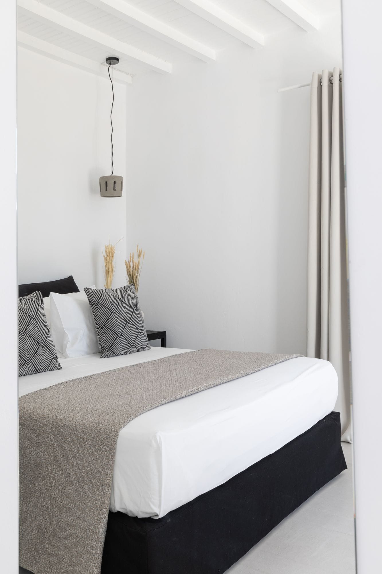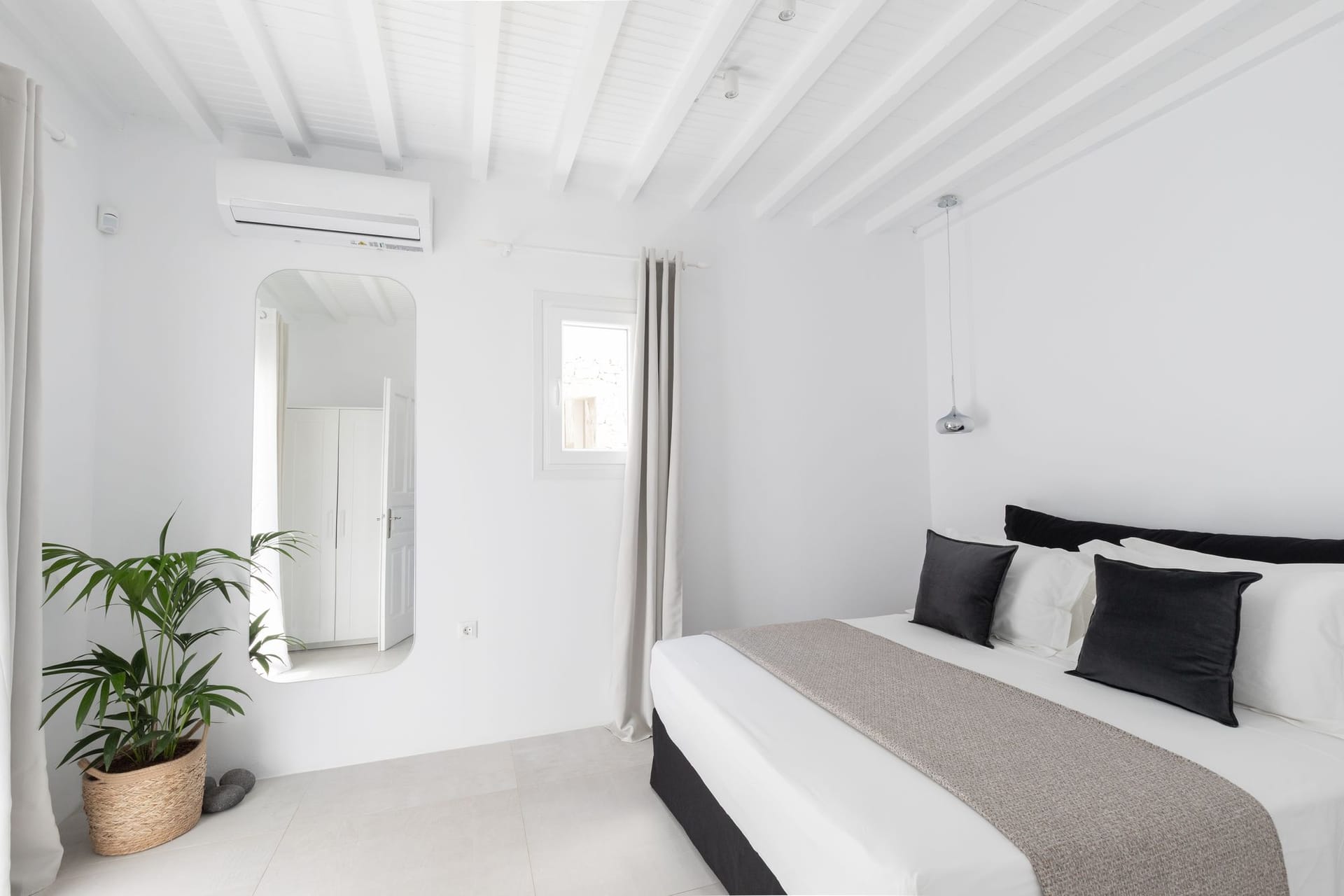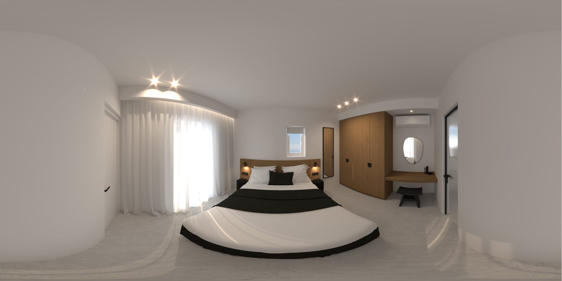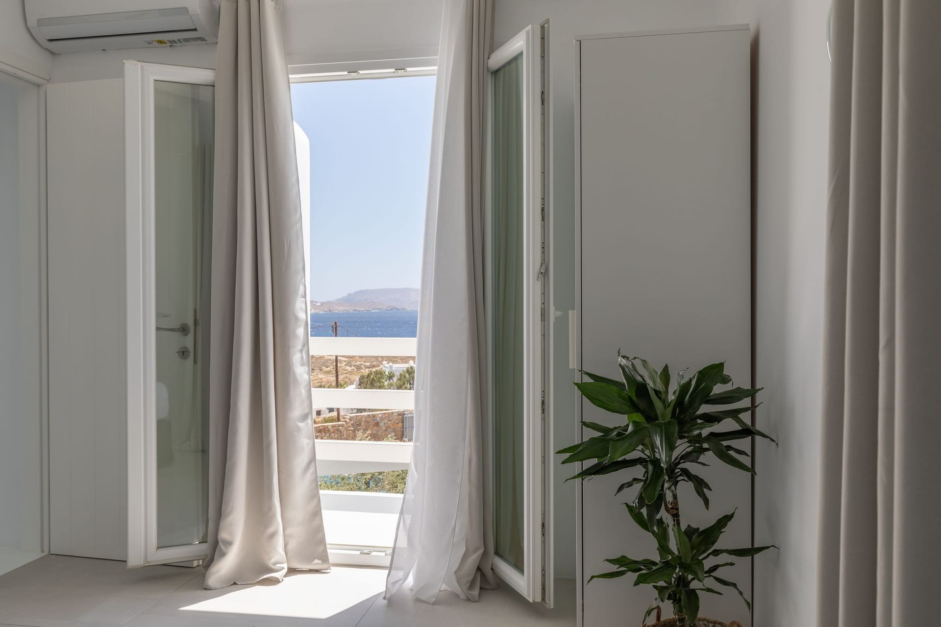 Suite 7: bedroom with queen-size bed, en-suite bathroom with walk-in rain shower, closets, ergonomic desk, direct access to a private balcony, panoramic sea view from the bed.