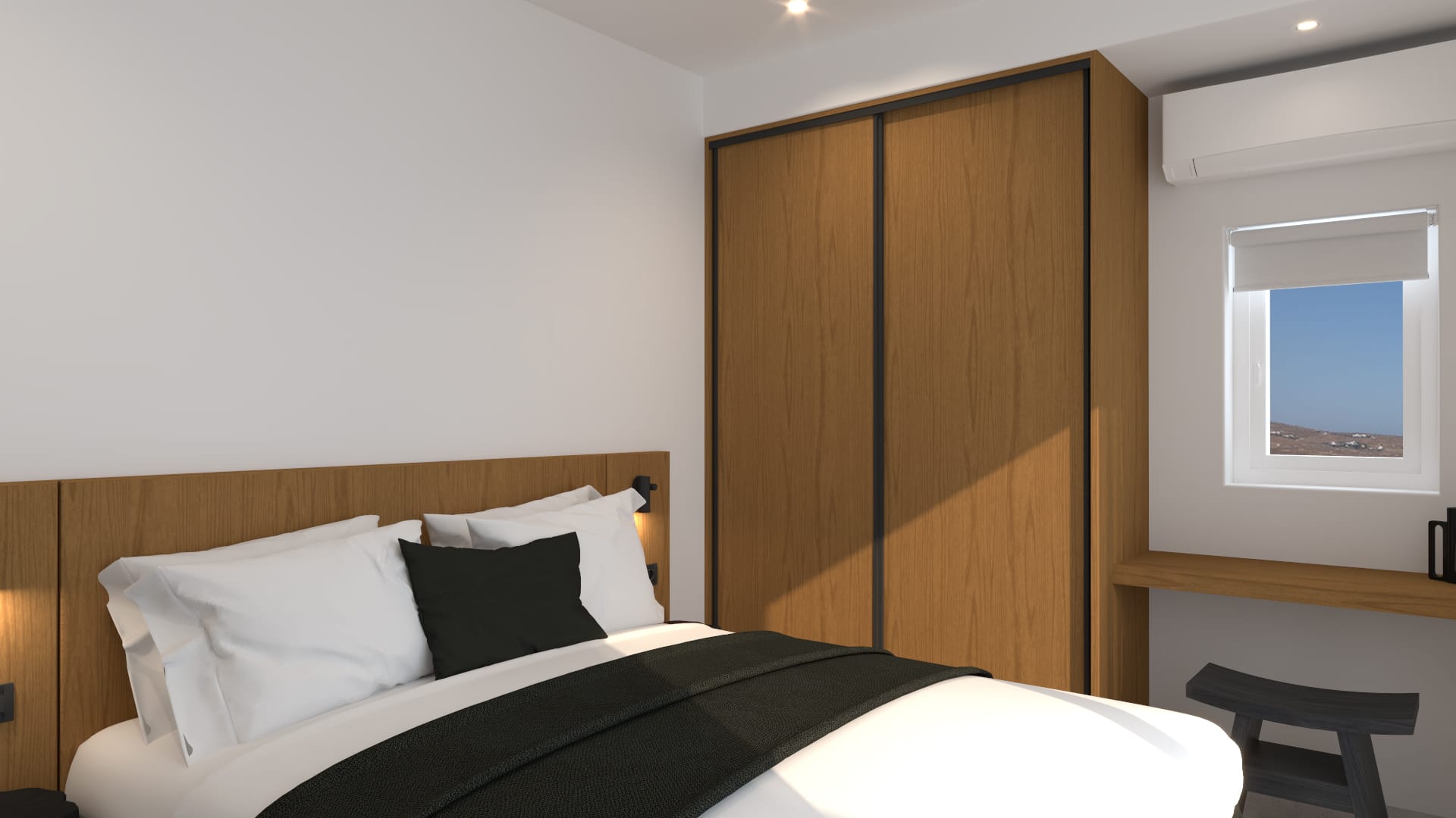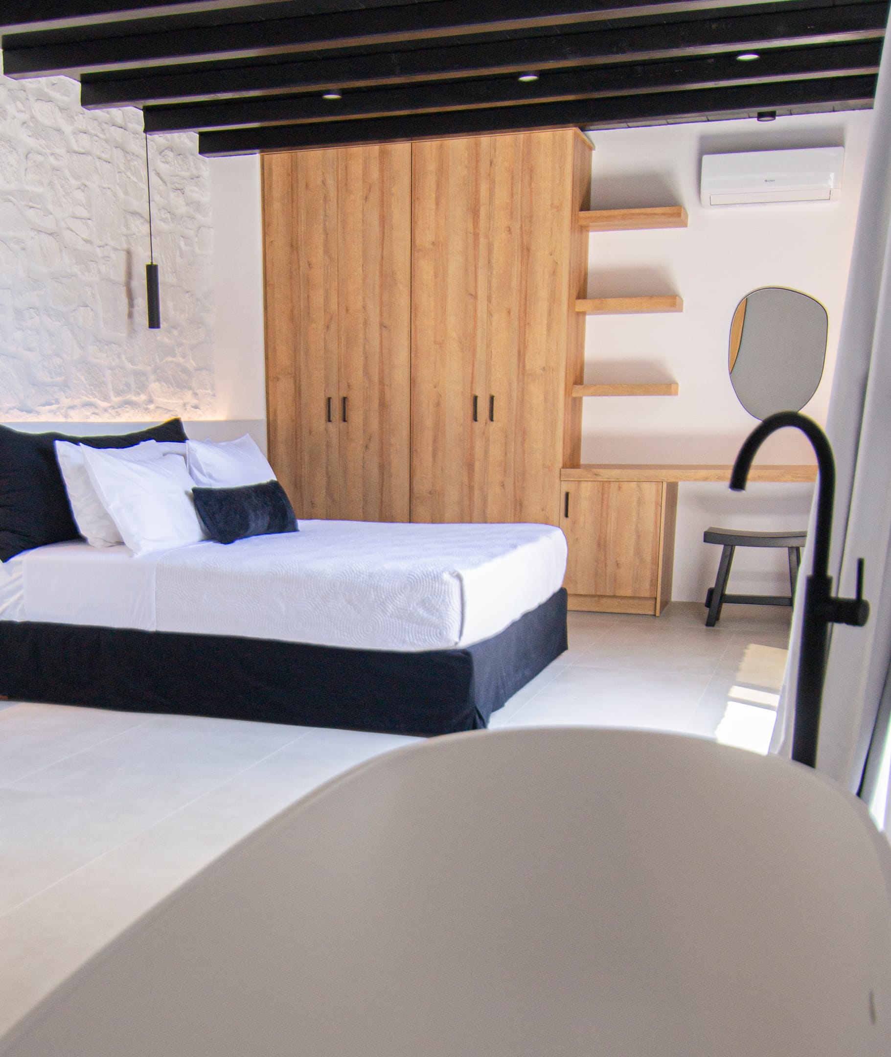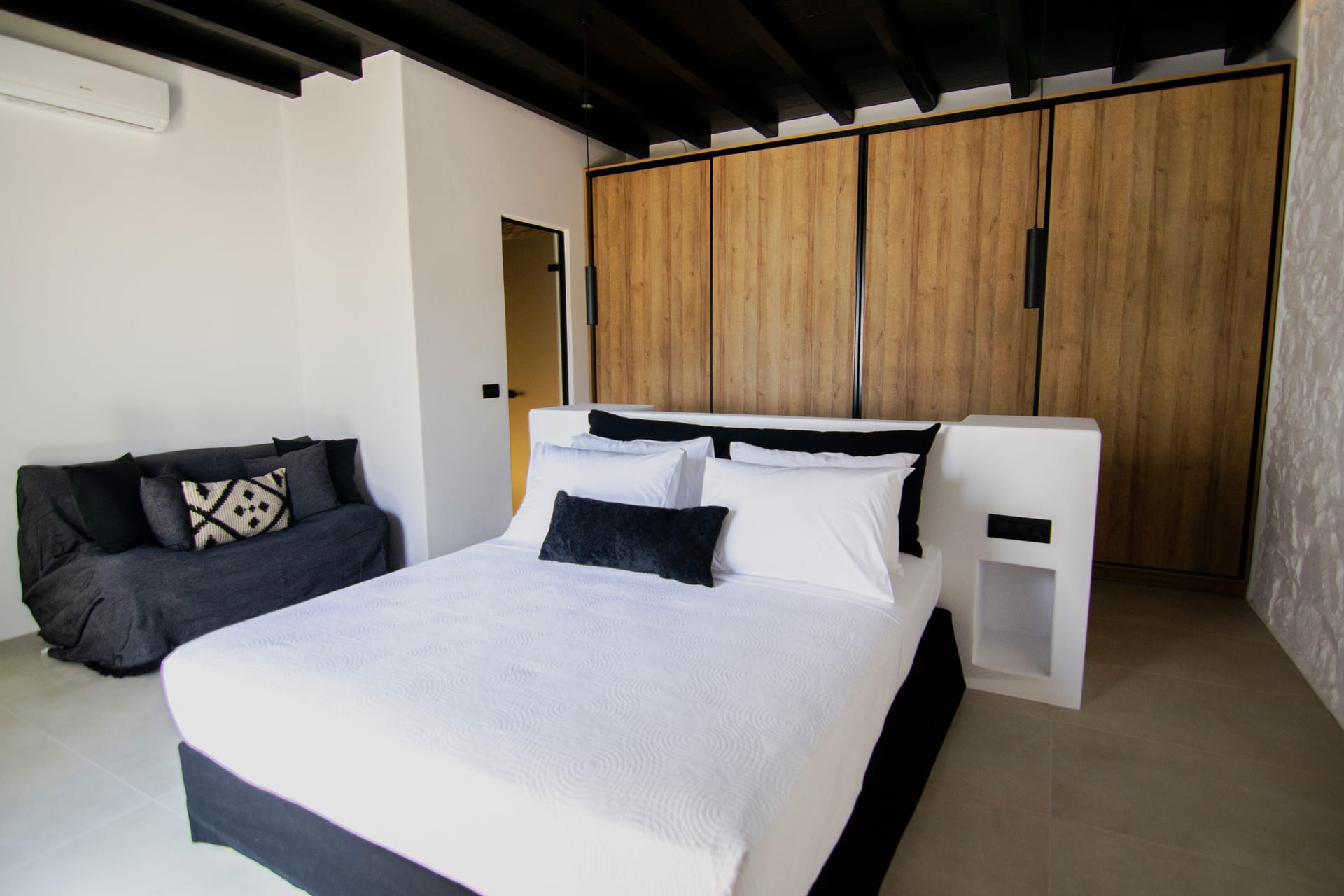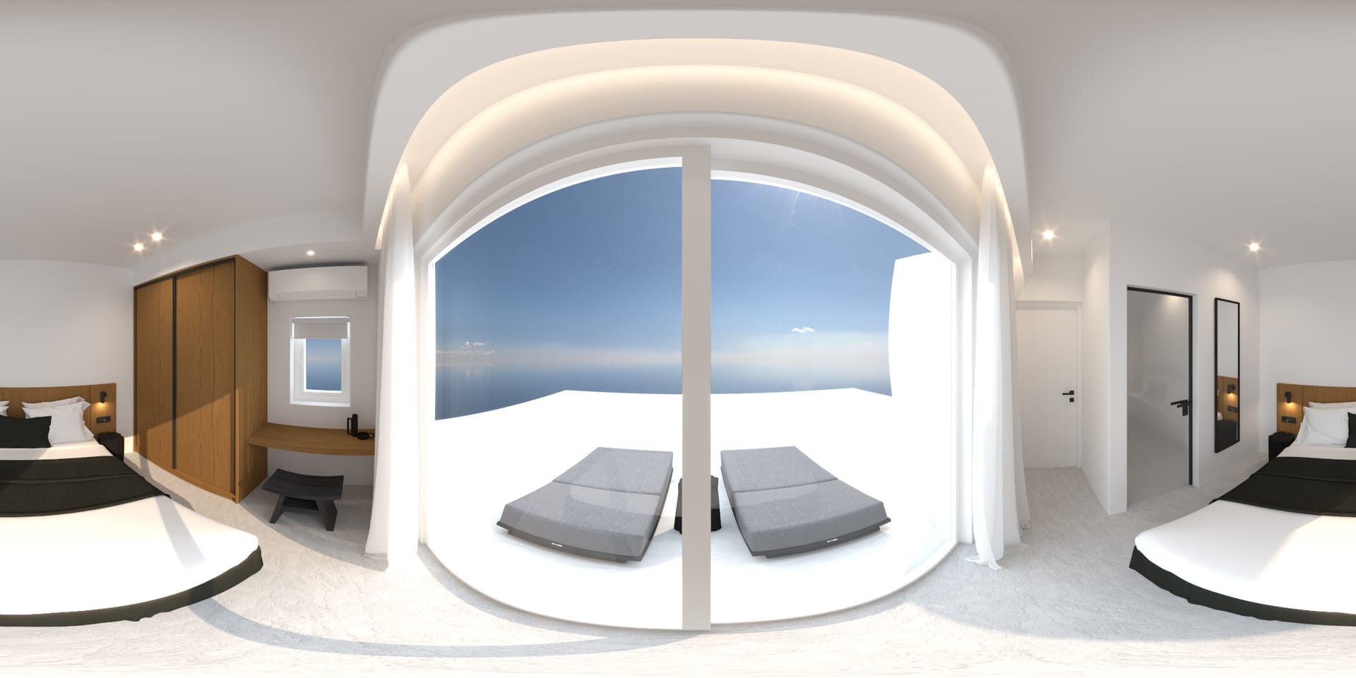 Suite 6: bedroom with queen-size bed, en-suite bathroom with walk-in rain shower, closets, ergonomic desk, direct access to a private balcony with sunbeds, panoramic sea view from the bed.